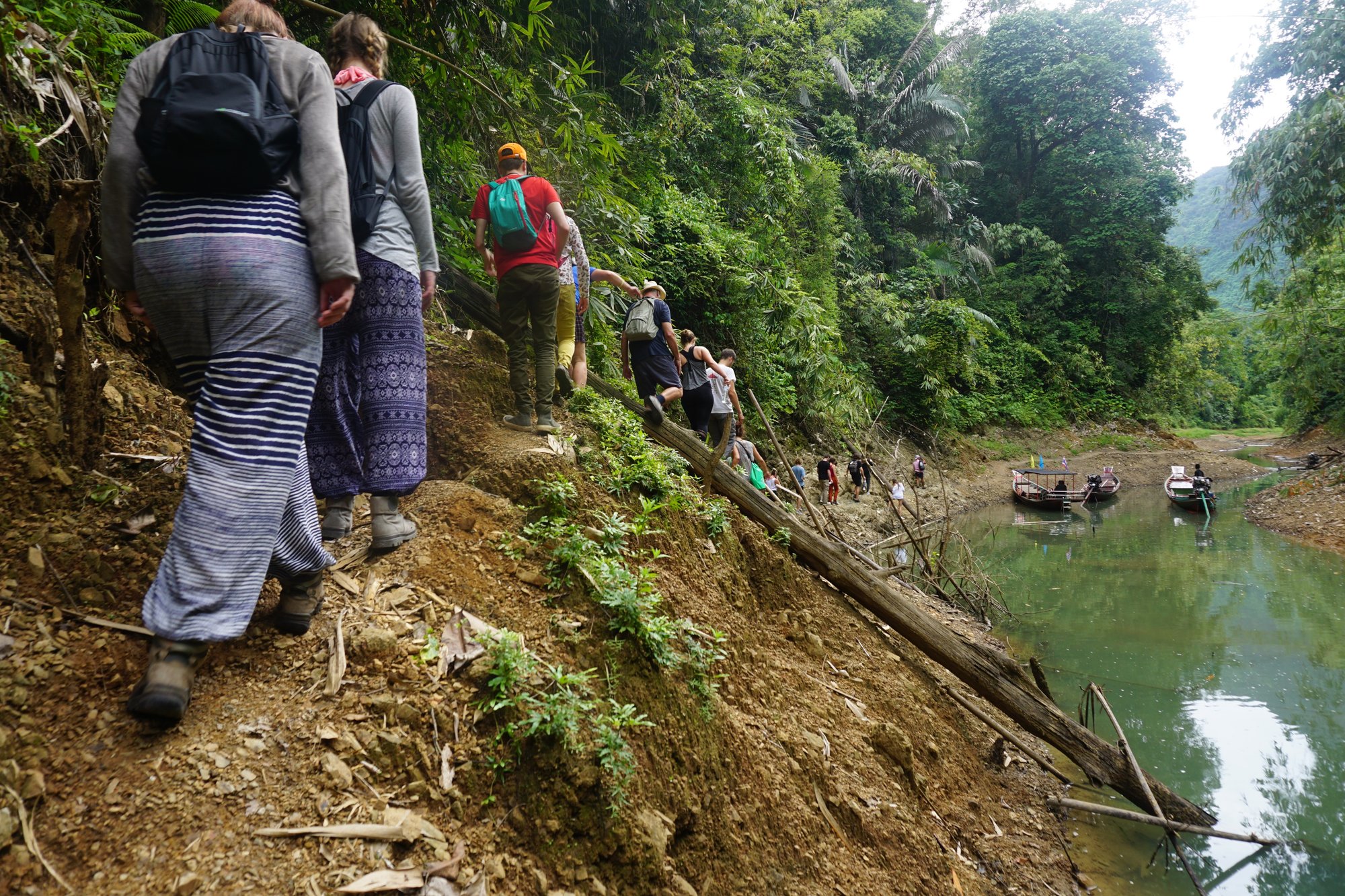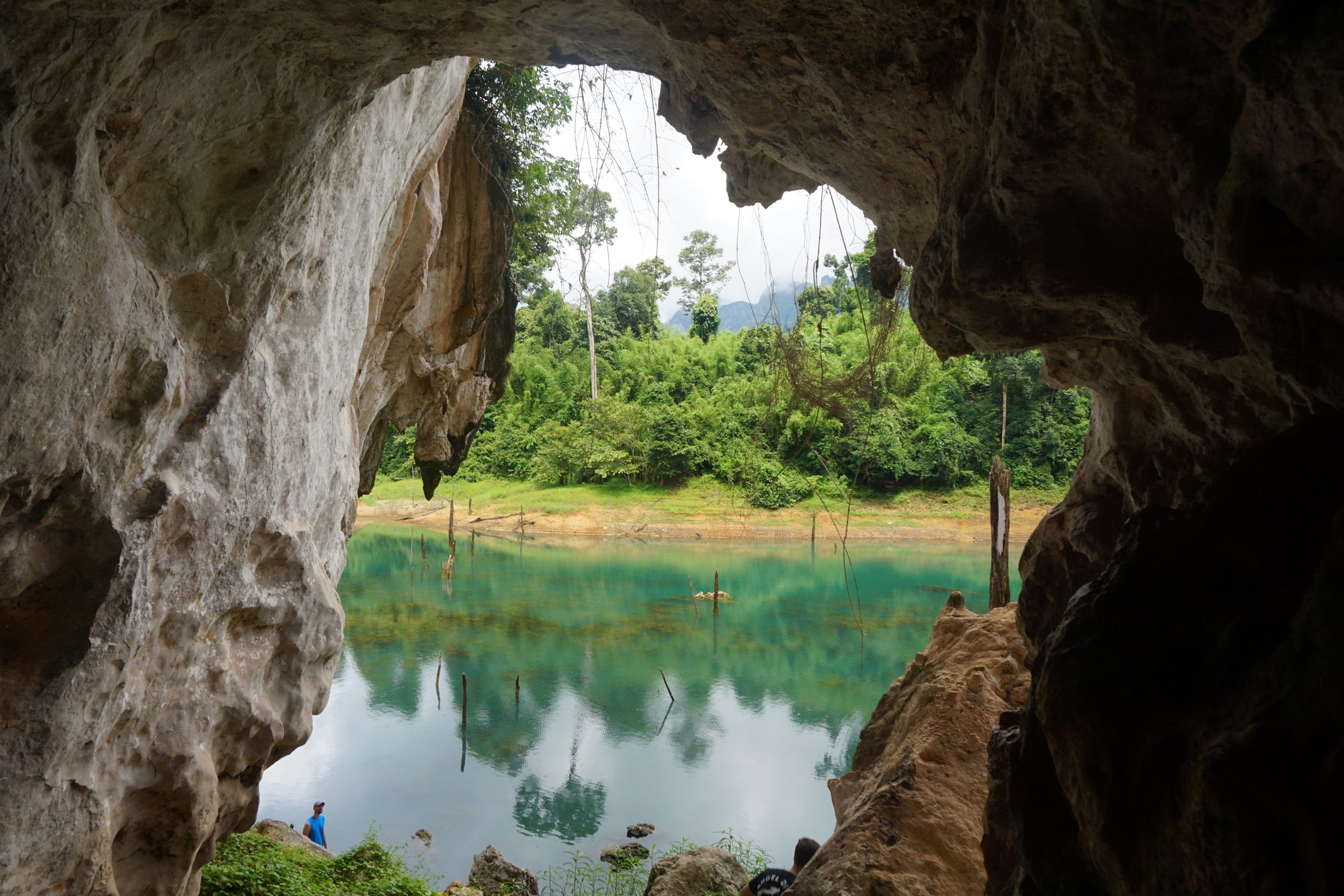Na een frisse duik in het meer en een Thaise lunch, staat er een jungle trekking naar een grot op het programma. Wandelend door het groene regenwoud, wadend door riviertjes en glibberend door de modder komen we na 45 minuten lopen aan bij de ingang van de grot. Het bijzondere van de grot is dat er een waterval in de grot is en dat je bij sommige delen tot je kin in het water staat om bij die waterval te komen. Iedereen laat waardevolle spullen achter, krijgt een hoofdlampje op en maakt zich klaar voor een avontuur. Tussen neus en lippen door vertelt de gids nog even dat er gerust dikke slangen en spinnen in de grot kunnen zitten.