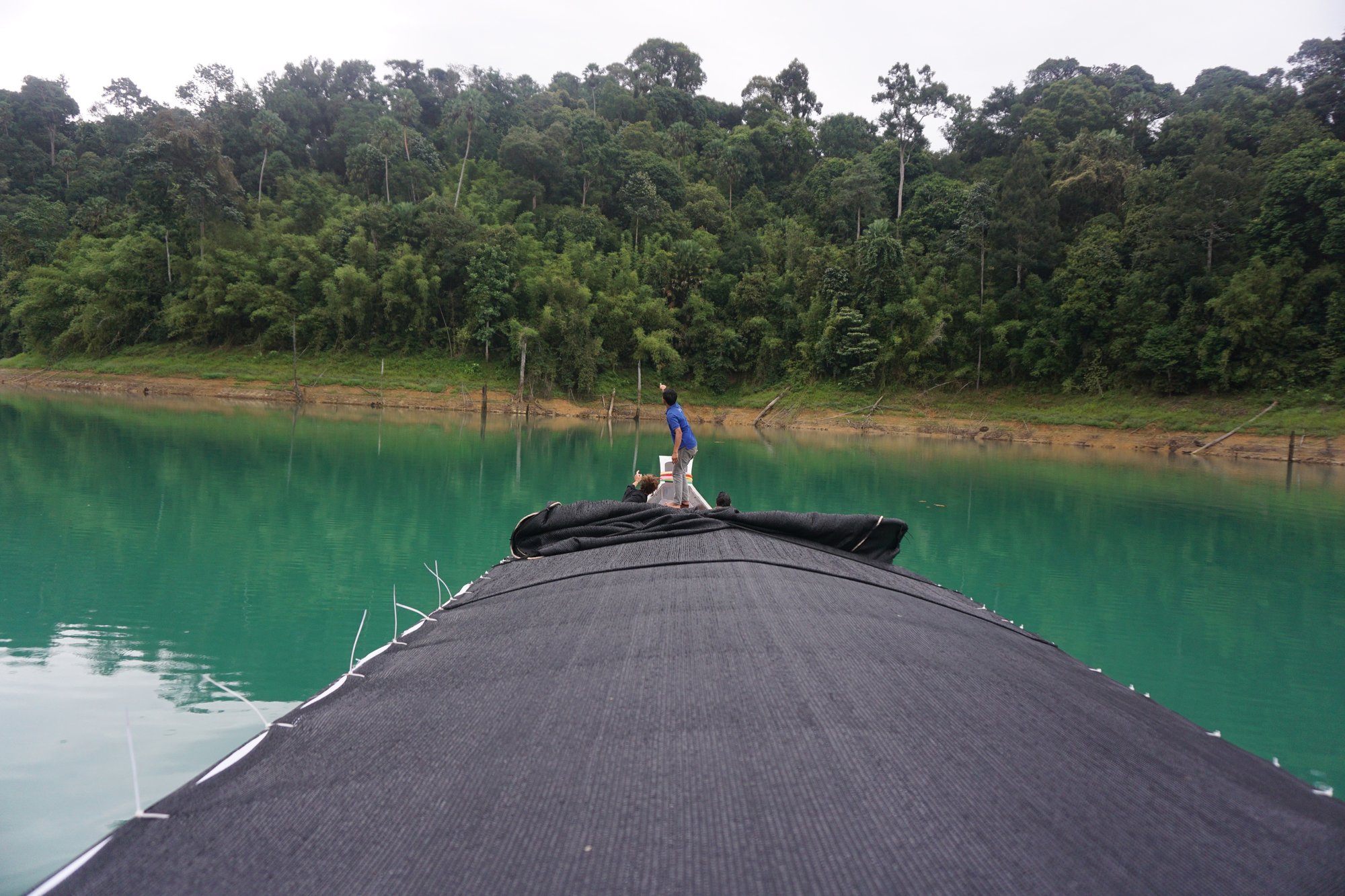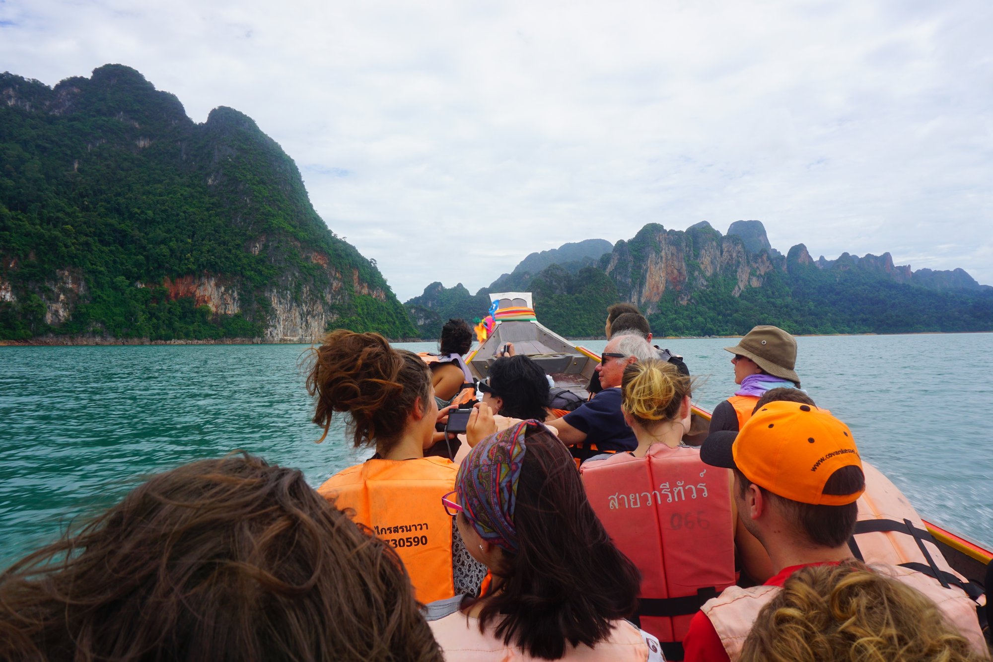 Rond 9 uur 's ochtends worden we opgehaald en met zo'n 8 andere mensen in een minibusje gestopt. Het is ongeveer een uur rijden naar de andere ingang van het nationaal park, vanwaar je met de boot het meer op gaat. Helaas gebeurt bij de pier precies datgene waar we bang voor waren. Onze groep wordt samengevoegd met een groep uit een andere minibus en met meer dan 20 man moeten we op één longtailboot. En dat is behoorlijk krap... Vervolgens varen we met hoge snelheid over het prachtige meer. Doordat we zo snel varen, voelt het vooral als een manier om van A naar B te komen in plaats van een leuke boottocht in de mooie natuur. Ook doordat de boot zo vol zit, is het lastig om op je gemak van het landschap te genieten. Een foto maken zonder tien andere mensen erop is al helemaal een uitdaging. ;-) Het is onwijs zonde, want het landschap hier is oogverblindend mooi.