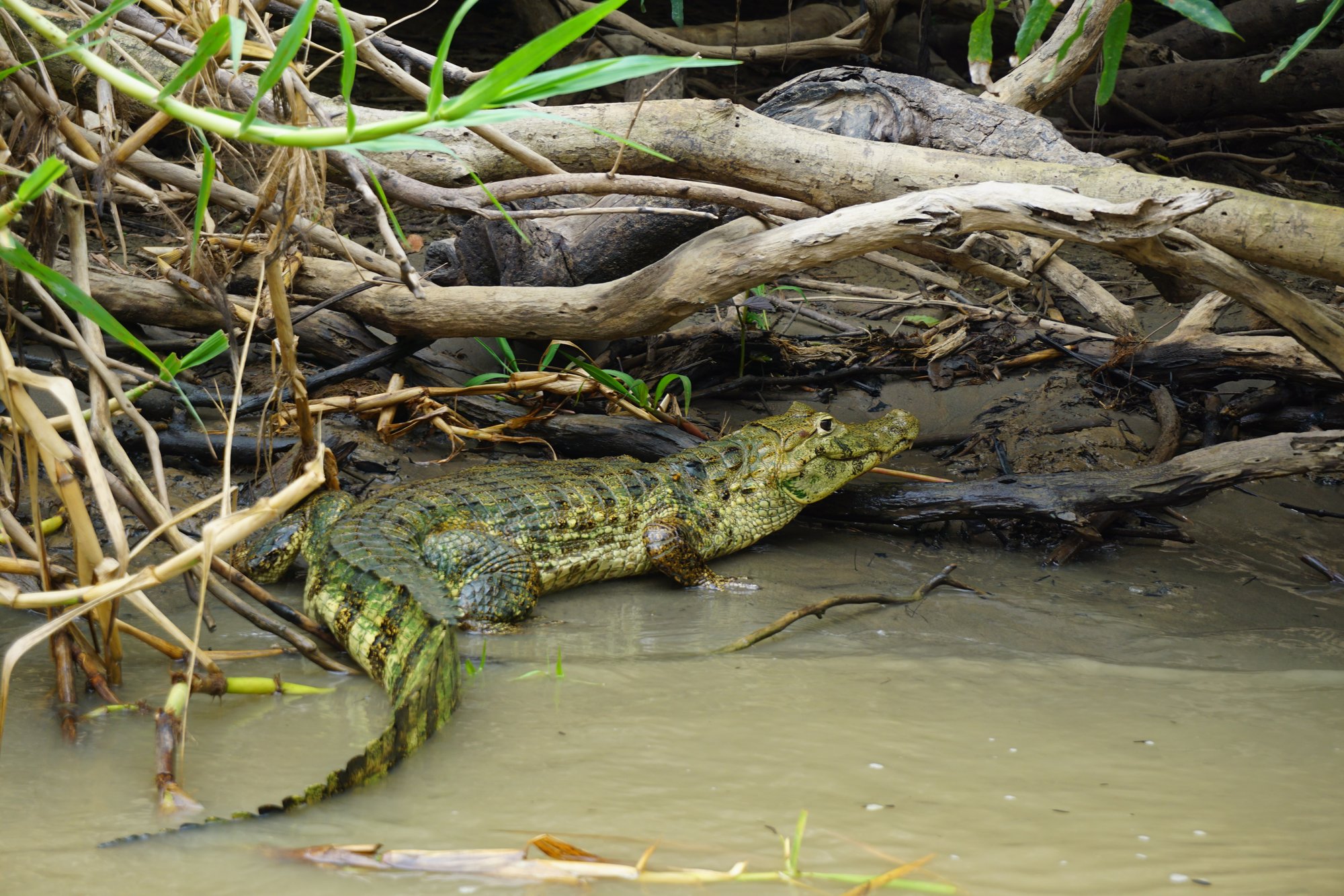 In de waterpoelen zien we opnieuw super veel kaaimannen. Het is echt ongelooflijk hoe goed deze beesten zich kunnen verstoppen, maar tijdens de tour worden we steeds beter in het ontdekken van de krokodillen. Na een paar uur wandelen zien we eindelijk een slang, yes! Het is helaas geen anaconda, maar een 'neppe cobra' zoals onze gids het noemt. De slang ziet eruit als de gevaarlijke cobra, maar deze slang is niet giftig. Toch houden we maar gepaste afstand. ;-)