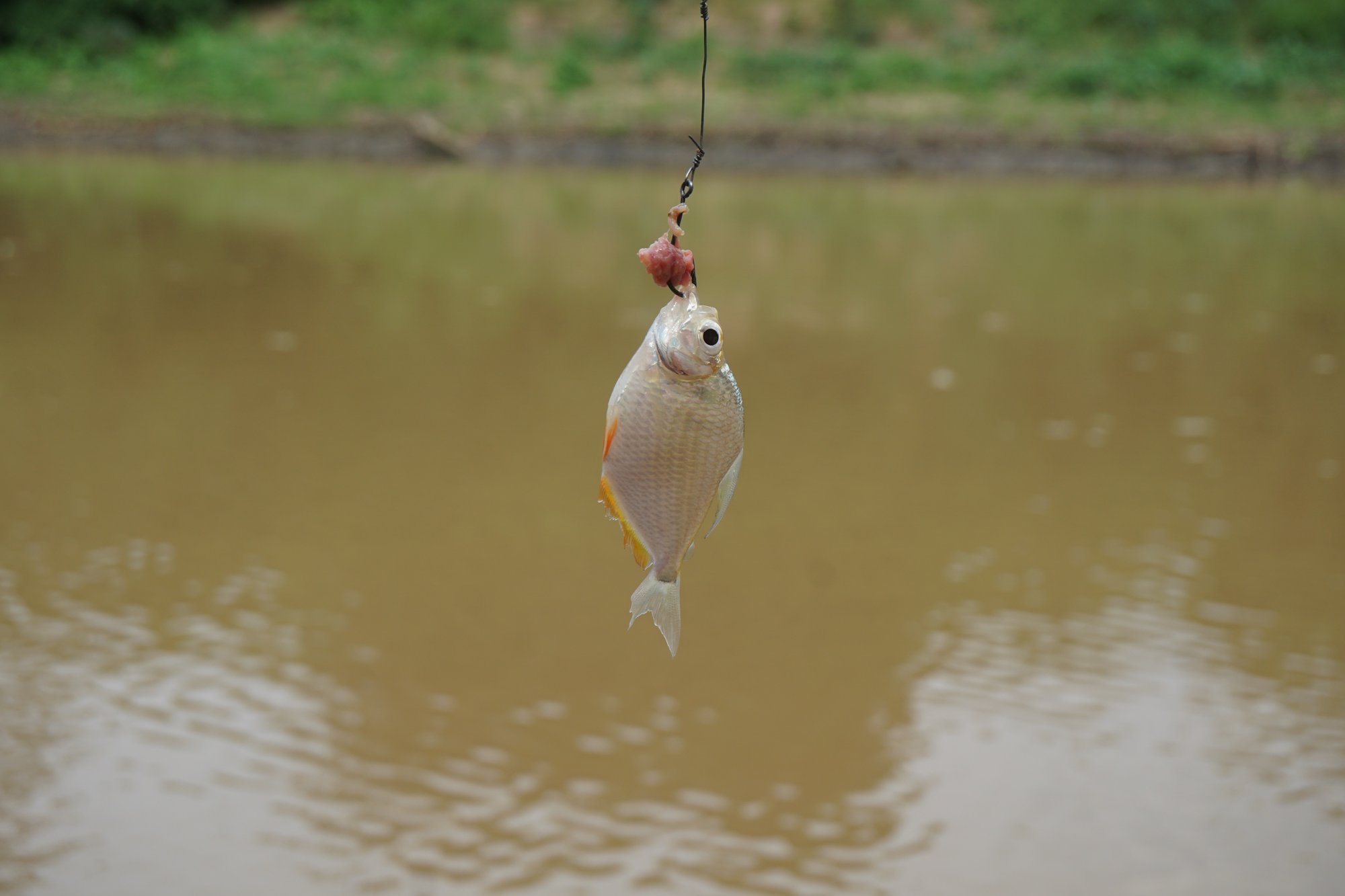 Maar, de aanhouder wint zeggen ze hè. Ik heb het vissen allang opgegeven, maar Ronny houdt vol. En met resultaat. Aan het einde van de middag hangt er een kleine piranha aan zijn haak!