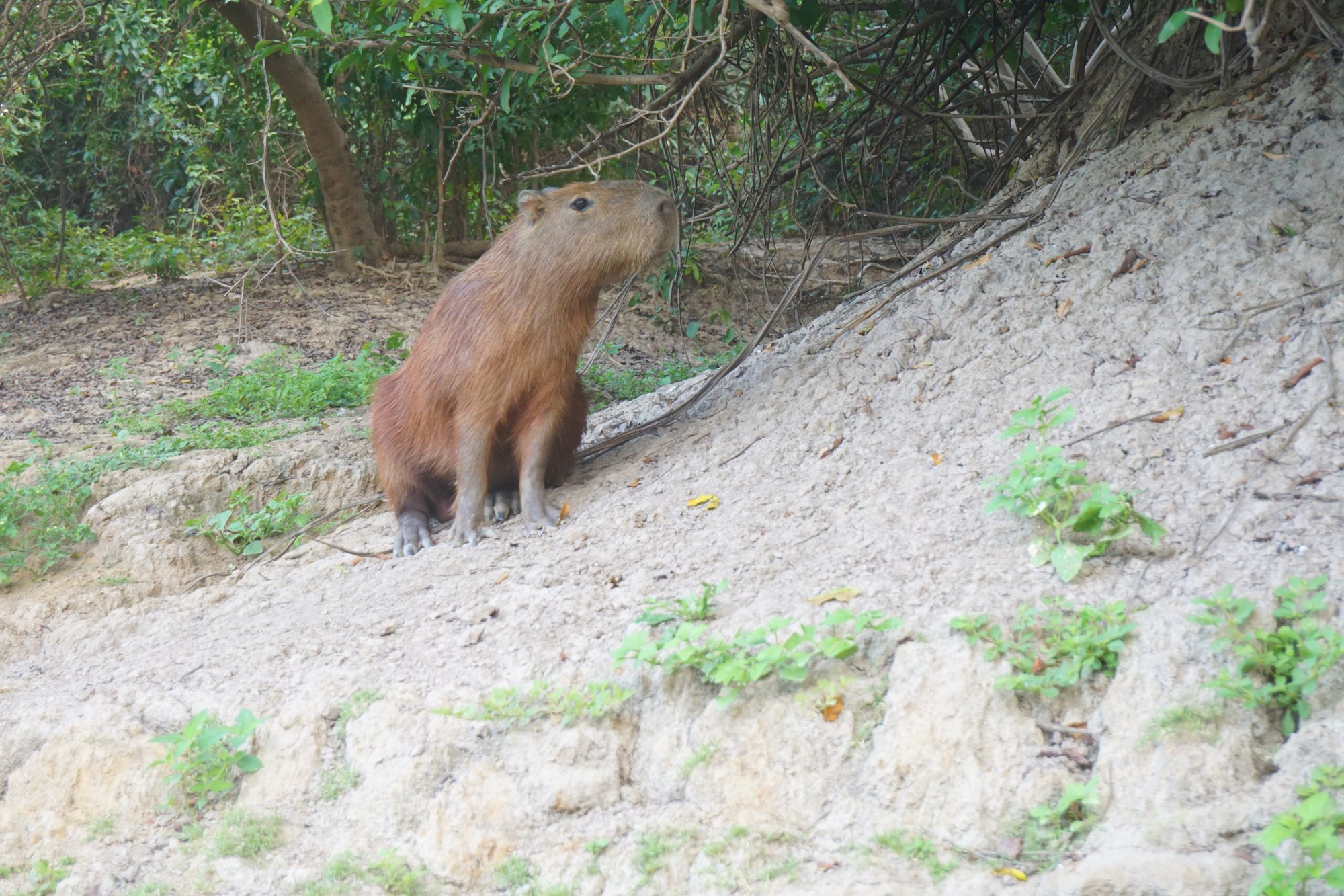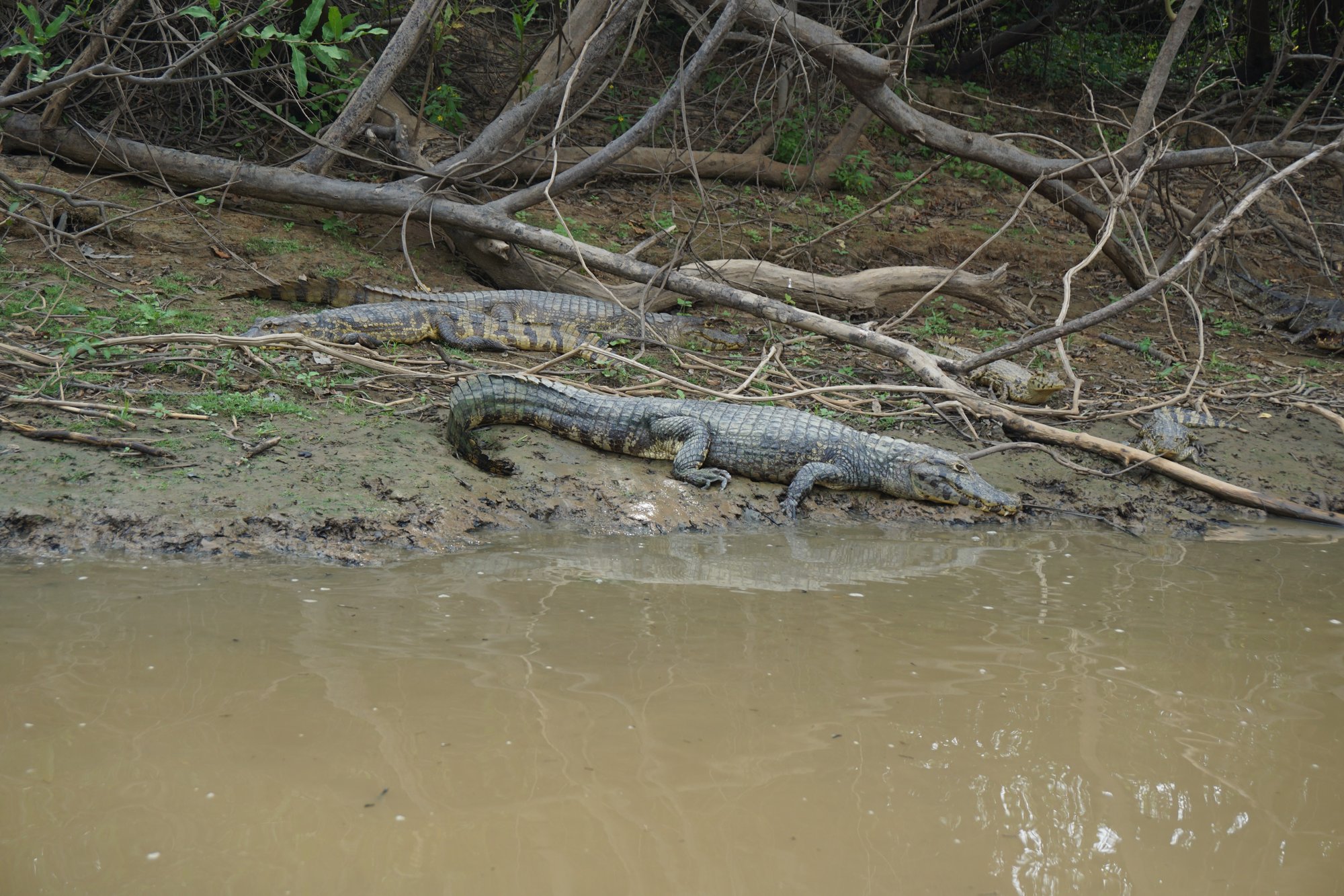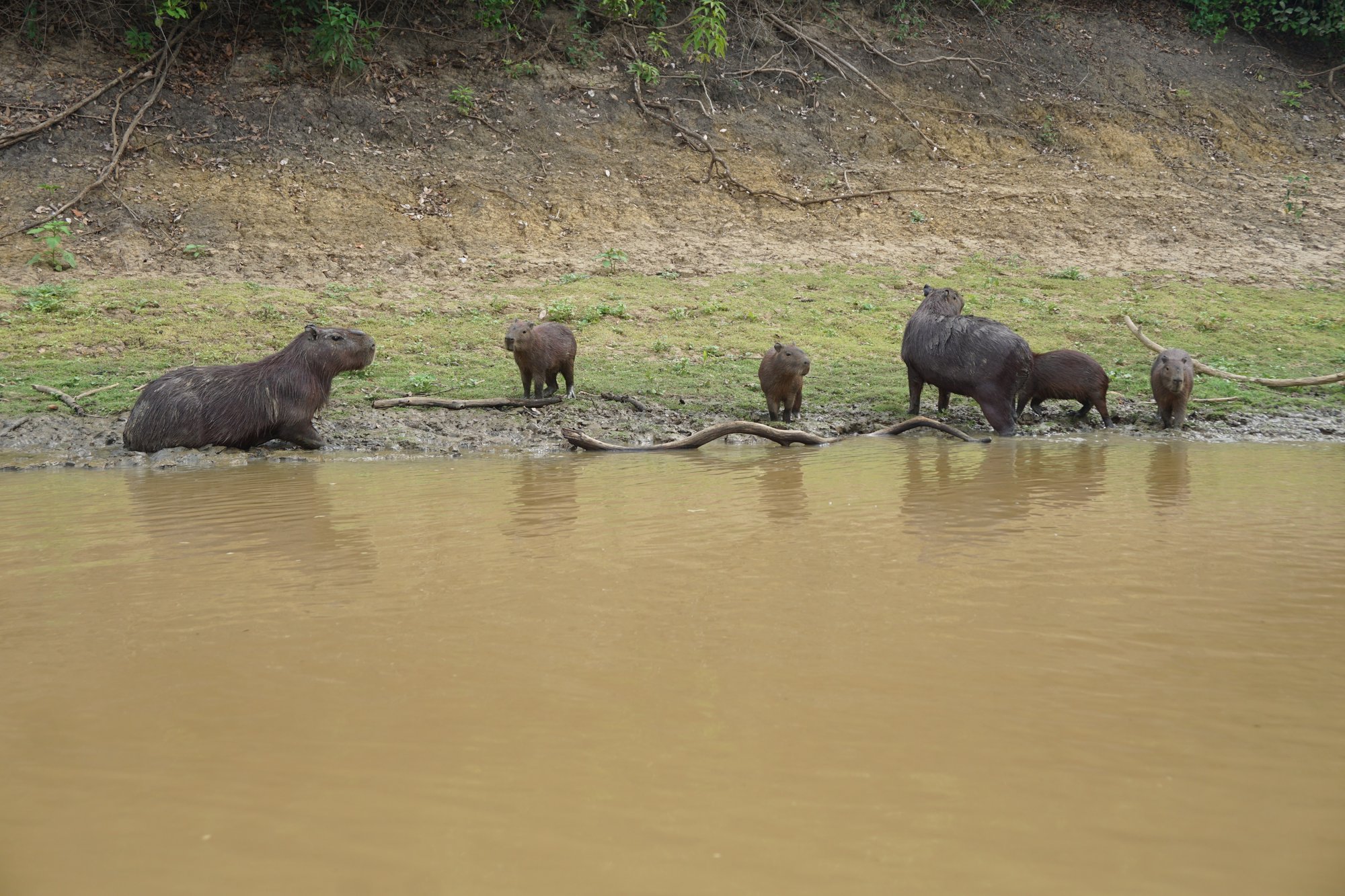 Na 3 uur rijden lunchen we in een klein dorp en daarna stappen we op een bootje. Tijdens de 3 uur durende boottocht naar de lodge zien we al onwijs veel dieren. Allerlei soorten vogels, apen en capibara's, maar vooral de hoeveelheid krokodillen valt op. Wow, de bruingekleurde rivier zit er echt vol mee! Ook de capibara's zijn erg leuk. Dit is het grootste knaagdier ter wereld en ze zien eruit als een mix tussen een cavia en een varken. Ik vind ze lief! Regelmatig zien we een familietje langs de waterkant met schattige jonkies.