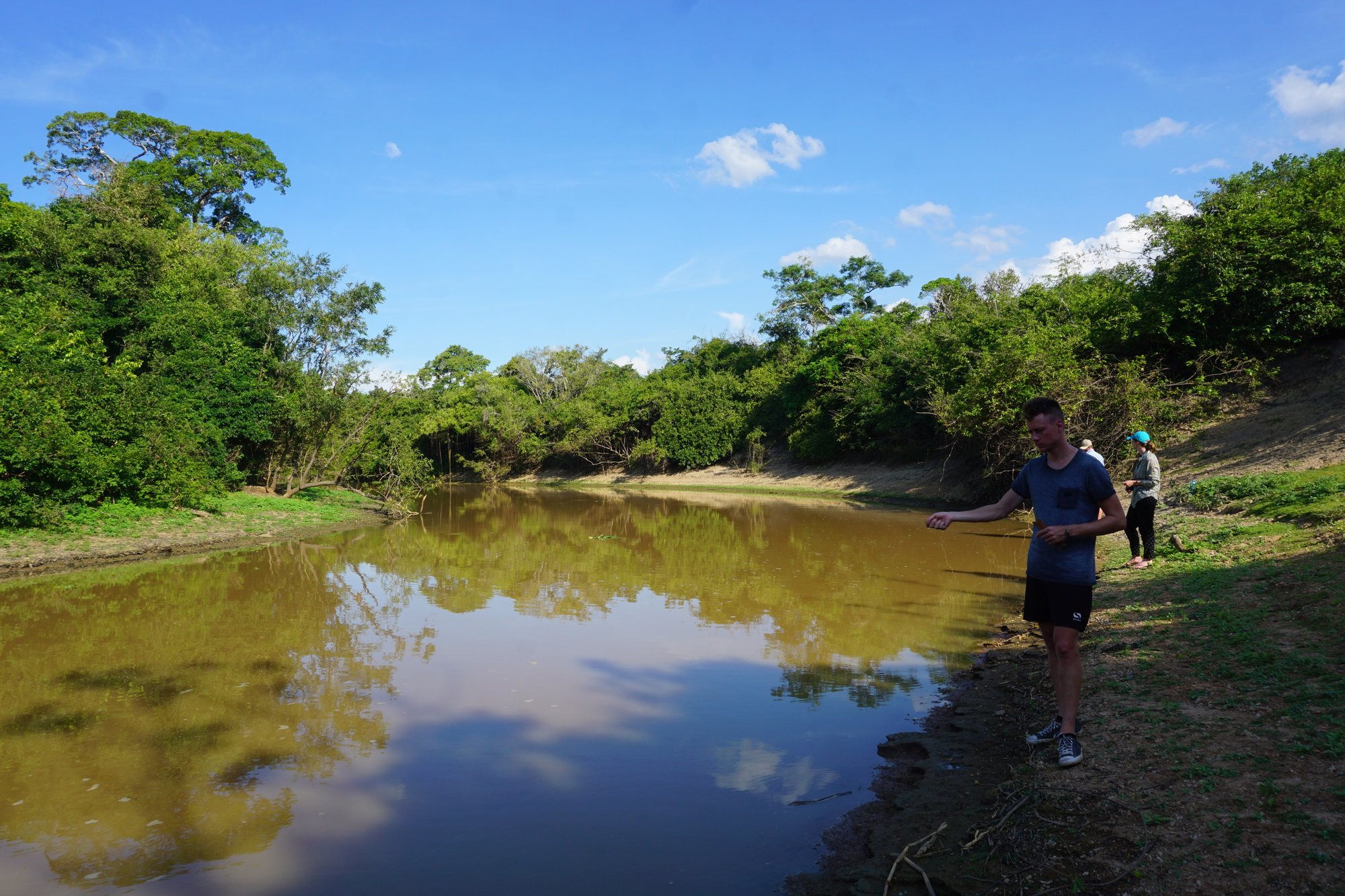 Na de lunch en een welverdiende siësta gaan we vissen. En niet zomaar vissen, nee we gaan piranha's vangen! Althans, dat is de bedoeling. Met een stukje vlees aan ons haakje is het veel misgrijpen. We voelen de piranha's wel knabbelen aan het vlees, maar ze zijn slim genoeg om niet in het haakje te bijten! Helemaal rustig staan we ook niet op de oever. Op enkele meters achter ons liggen de krokodillen in de bosjes en soms zwemt er eentje wel heel dichtbij langs. Bij één iemand uit de groep wordt het vlees aan zijn vishaak zelfs opgesmikkeld door een kaaiman!