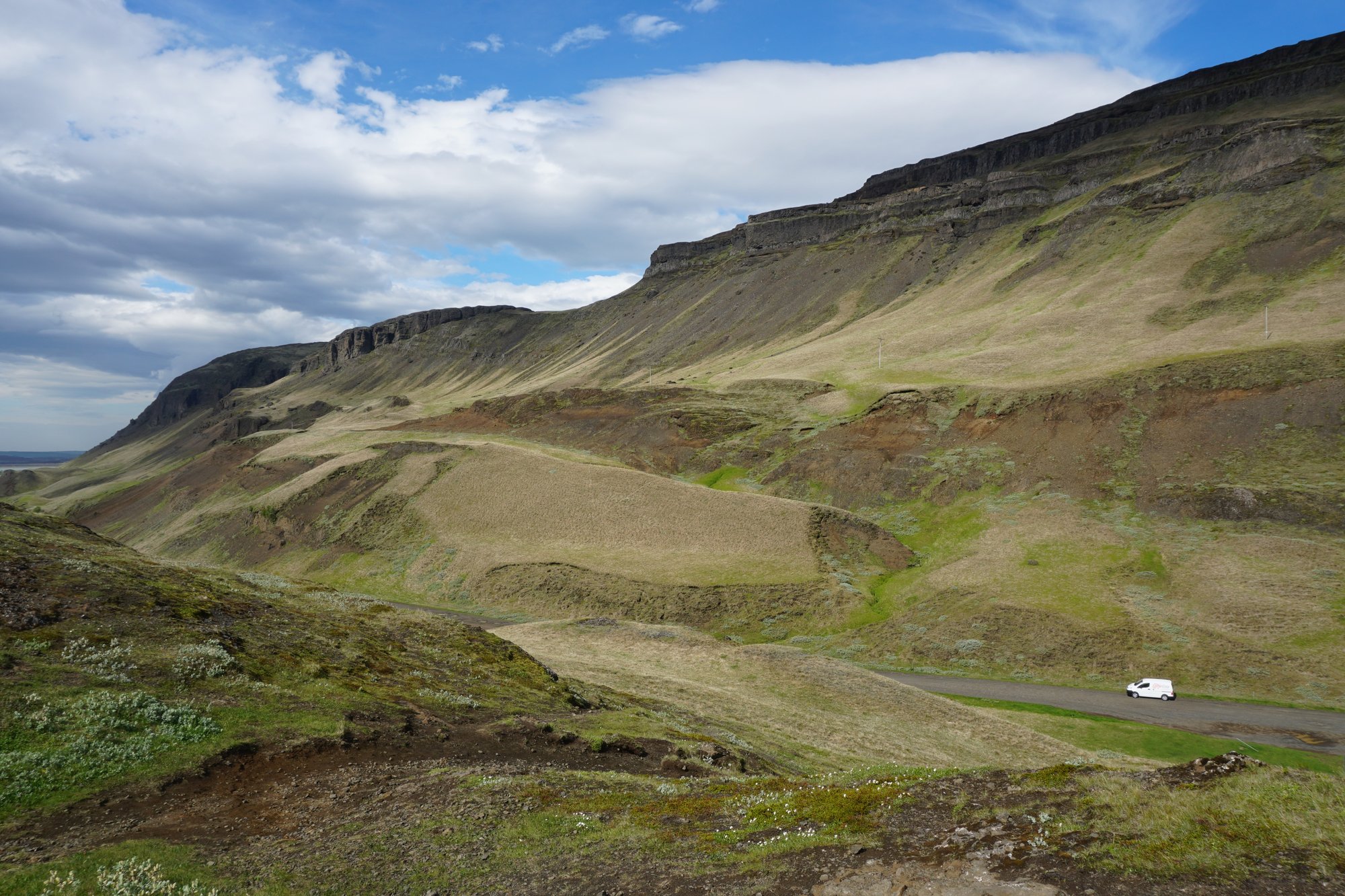 Als je de geasfalteerde weg 32 volgt, kun je een heel stuk het binnenland van IJsland inrijden. We volgen deze weg en zien aan onze rechterkant de imposante vulkaan Hekla liggen. Vanaf het Gaukshöfdi uitzichtpunt heb je perfect zicht op de besneeuwde vulkaan en de rivier die ervoor ligt. Wauw! Je moet voor dit uitkijkpunt een stukje over een behoorlijk steil en brokkelig pad rijden. In eerste instantie vond ik het pad er maar onveilig uit zien, maar eigenlijk viel het best mee. Het fenomenale uitzicht maakte het korte stukje billen knijpen snel goed. Ik denk dat de foto’s genoeg zeggen in dit geval. ;-)