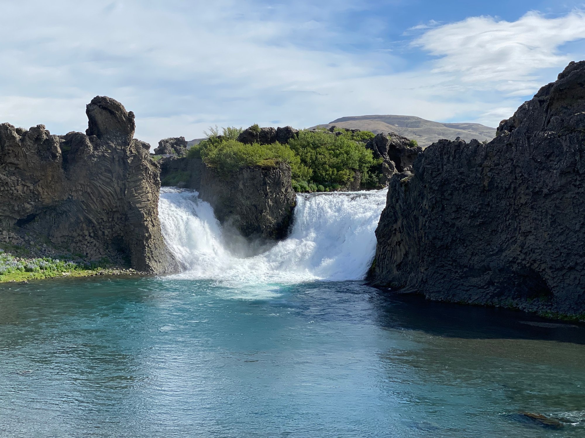 Na genoten te hebben van deze topplek volgen we weg 32 verder landinwaarts en komen we bij de Hjálparfoss waterval. Wat waait het hier enorm hard zeg. Het is duidelijk dat we dichterbij het ruige binnenland van IJsland komen. Ook is er geen enkele andere auto op de parkeerplaats bij de waterval. Boffen! Via een wandelpad lopen we een stukje naar beneden om de waterval van dichterbij te bekijken. Leuke stop!