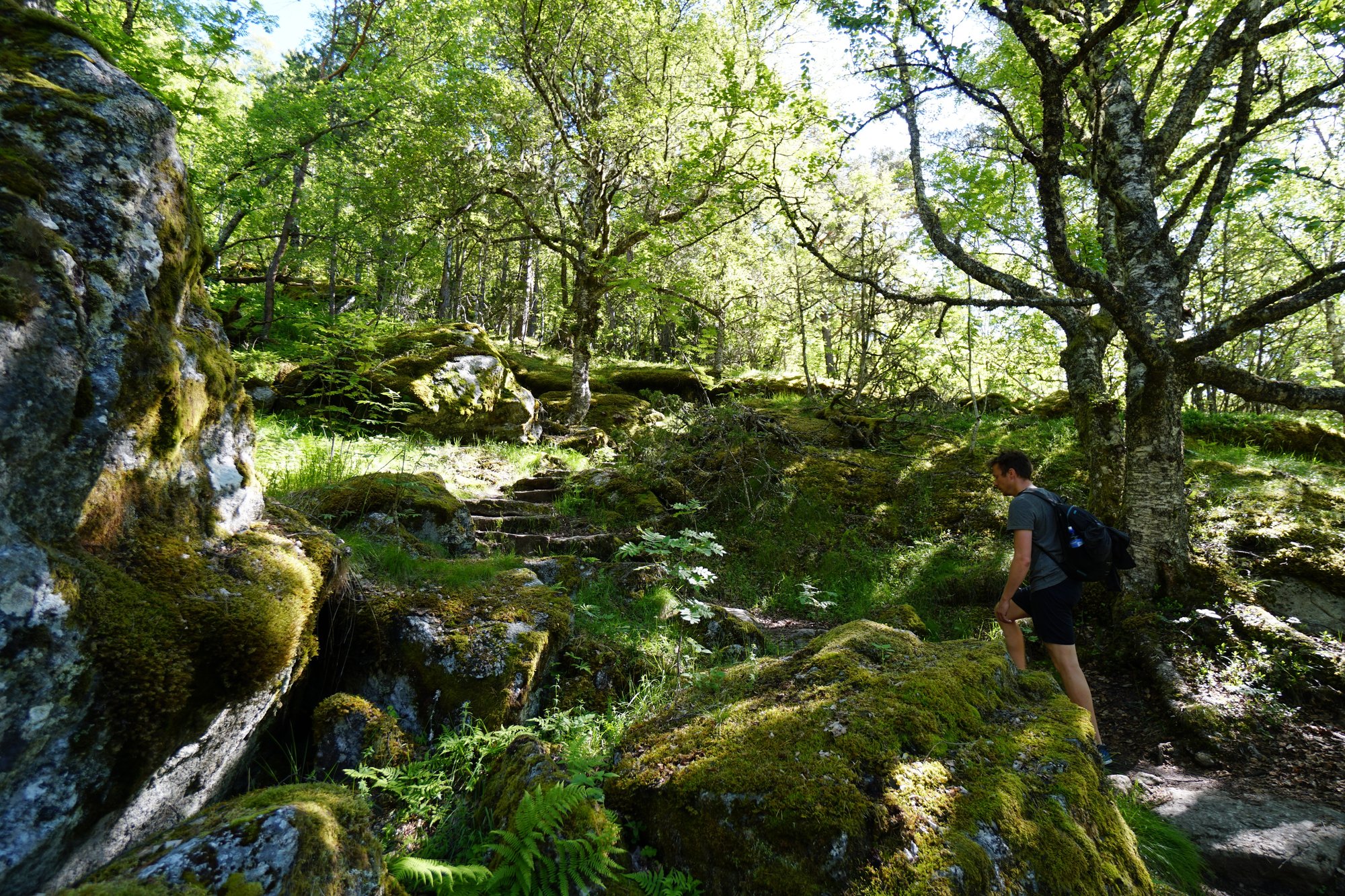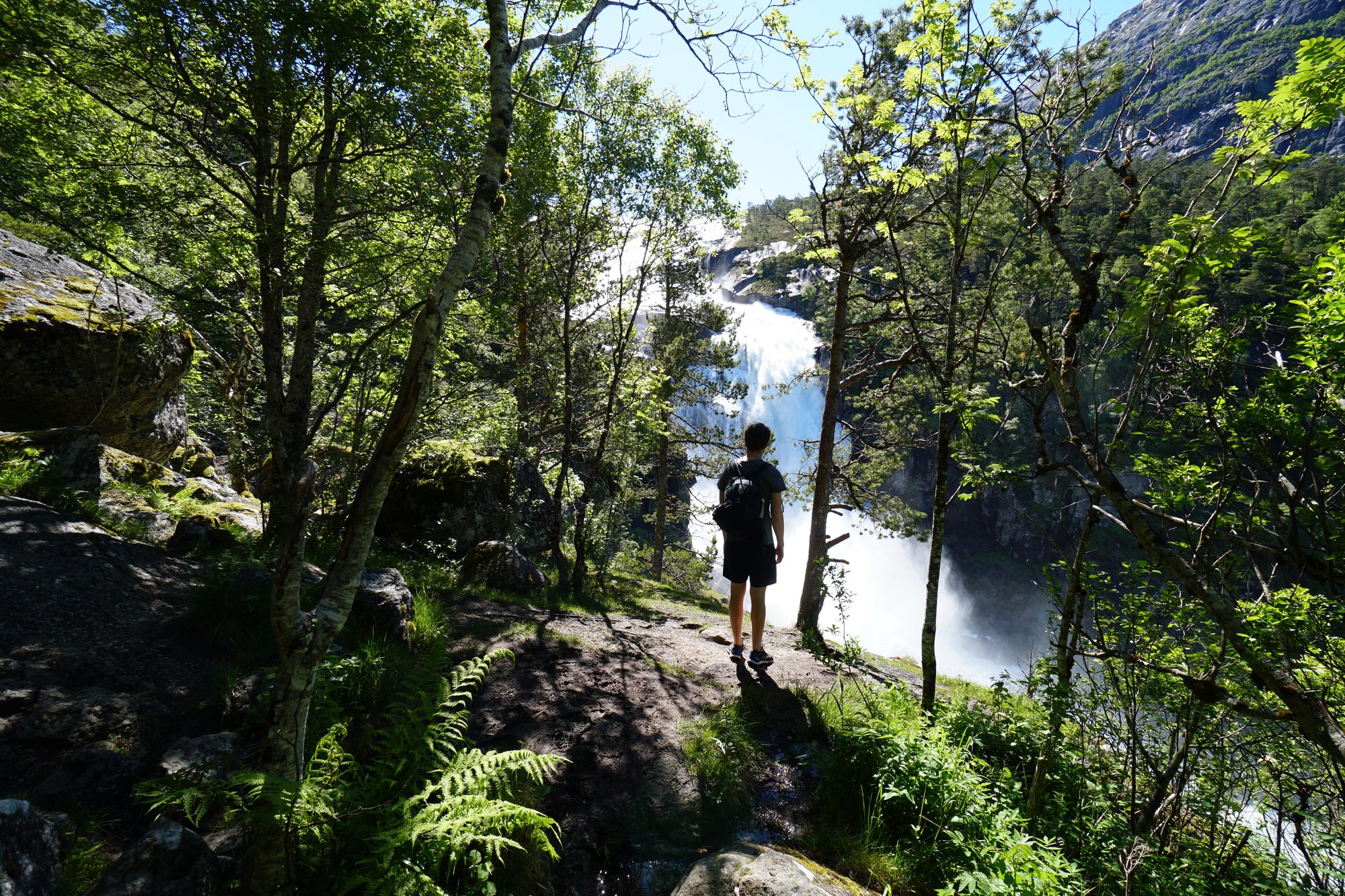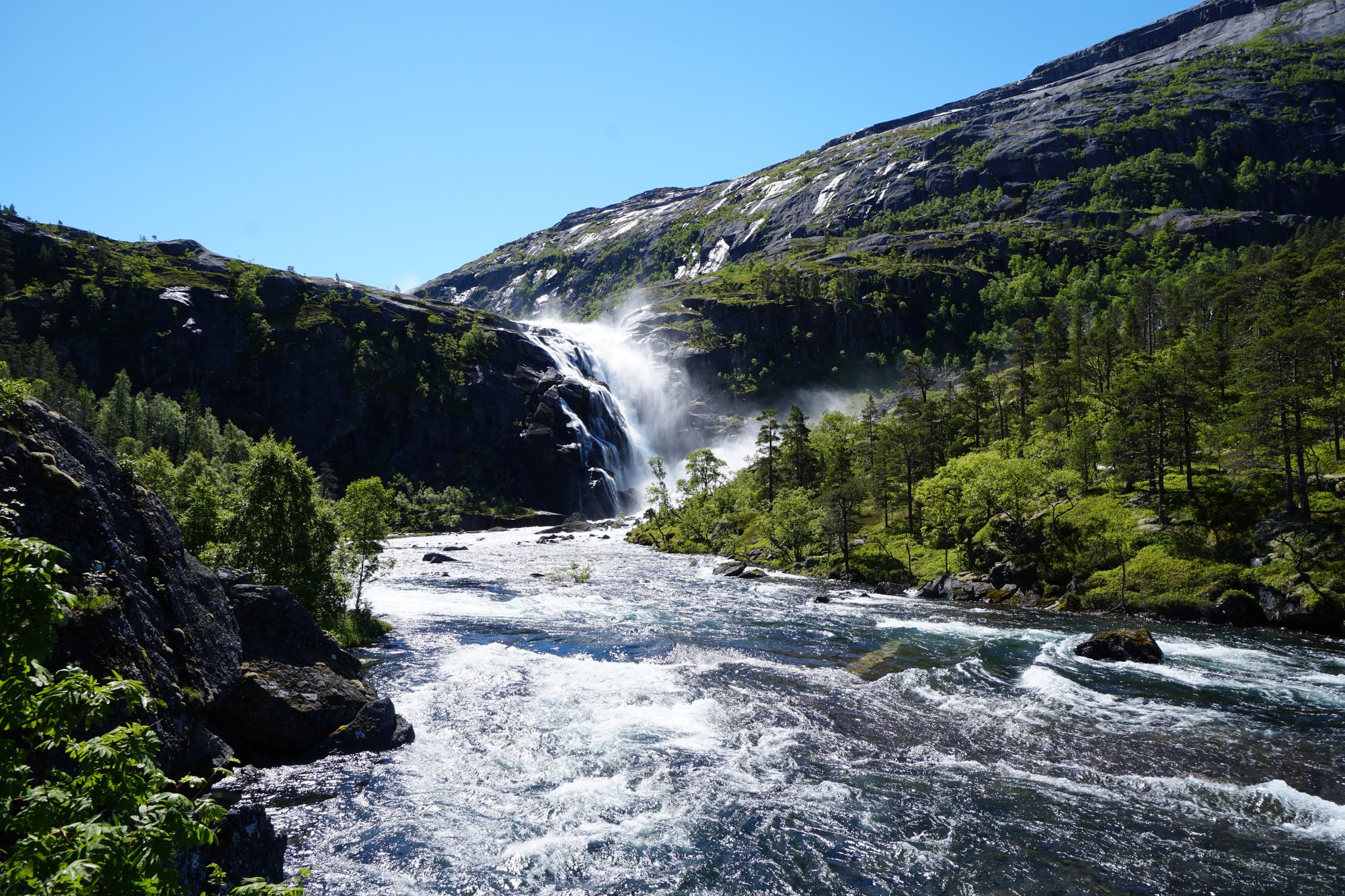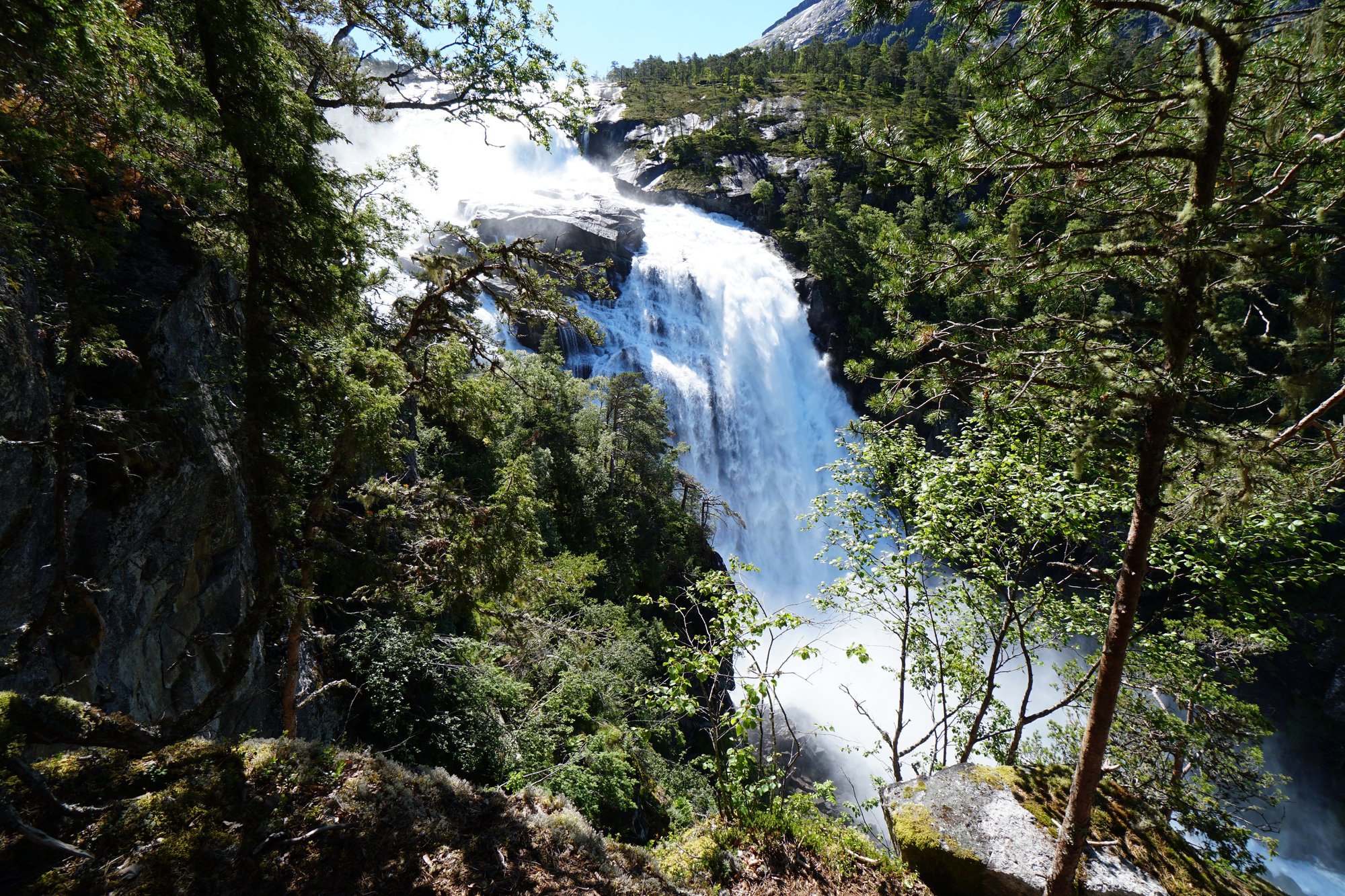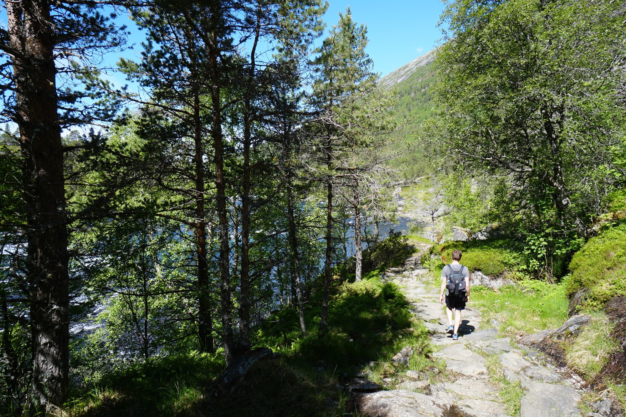 Na Tveitafossen blijkt het makkelijk inkomen klaar te zijn. Langs een grote pijp waar ze water doorheen laten stromen om elektriciteit op te wekken klimmen we over natte rotsen omhoog. Het duurt niet lang voordat we de volgende waterval alweer horen. Tussen de bomen door vangen we af en toe al een glimp op van Nyastølfossen. De twee watervallen liggen maar 1,2 kilometer uit elkaar, maar intussen zijn we wel 220 meter in hoogte gestegen.