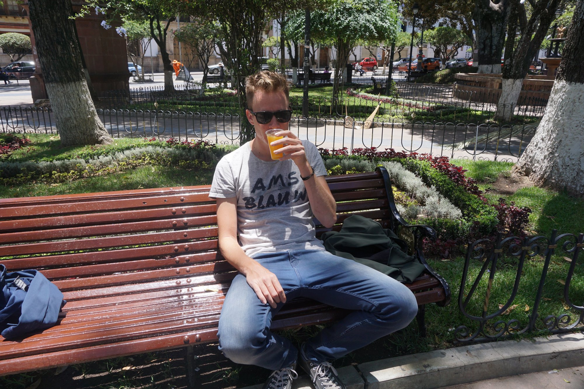 In Sucre kun je je urenlang vermaken door simpelweg te struinen door de witte straten of op een bankje te zitten in één van de groene parken / pleinen. Er is volop levendigheid en altijd wel iets om naar te kijken. Vervelen deden we ons niet! Iedere ochtend begon voor ons met een kopje koffie bij onze favoriete koffiezaak (Cafe Time & Coffee), waarna we met een verse jus d'orange - die je voor een halve euro koopt op straat - onszelf vermaakten op een bankje op het Plaza 25 de Mayo.