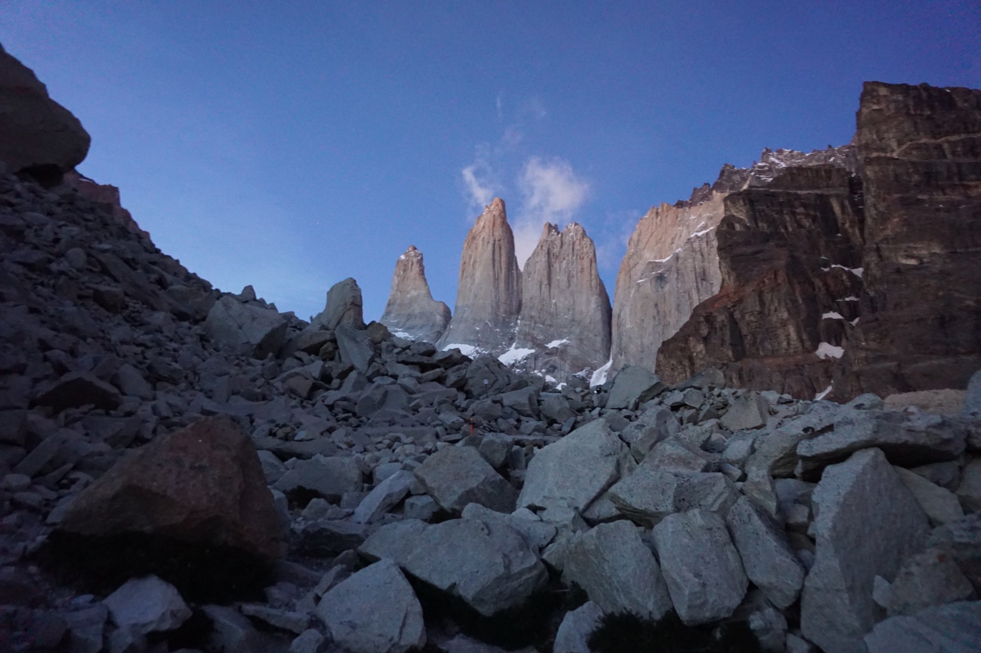 We zijn de hele weg vanaf de camping al wel aan het klimmen, maar het laatste deel wordt het echt steil. We hebben nu ook niet meer de beschutting van het bos. De wind is ijzig koud! Over grote rotsblokken zoeken we onze weg naar die wereldberoemde plek in Patagonië. Eenmaal daar zien we dat we gewoon de eerste zijn! Het is nog donker en de zonsopkomst is pas over een half uurtje. Hebben we toch sneller gelopen dan we hadden gedacht!