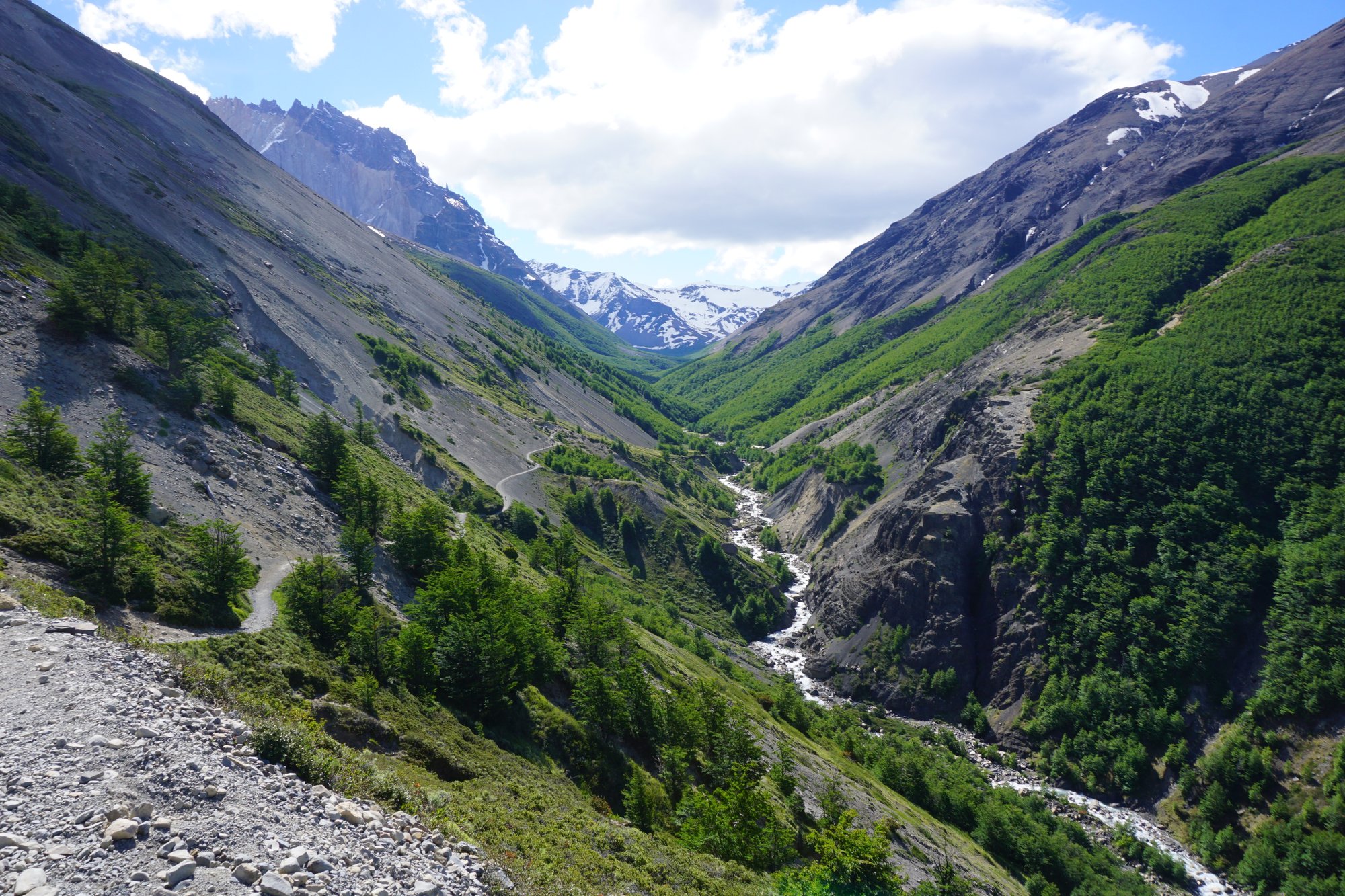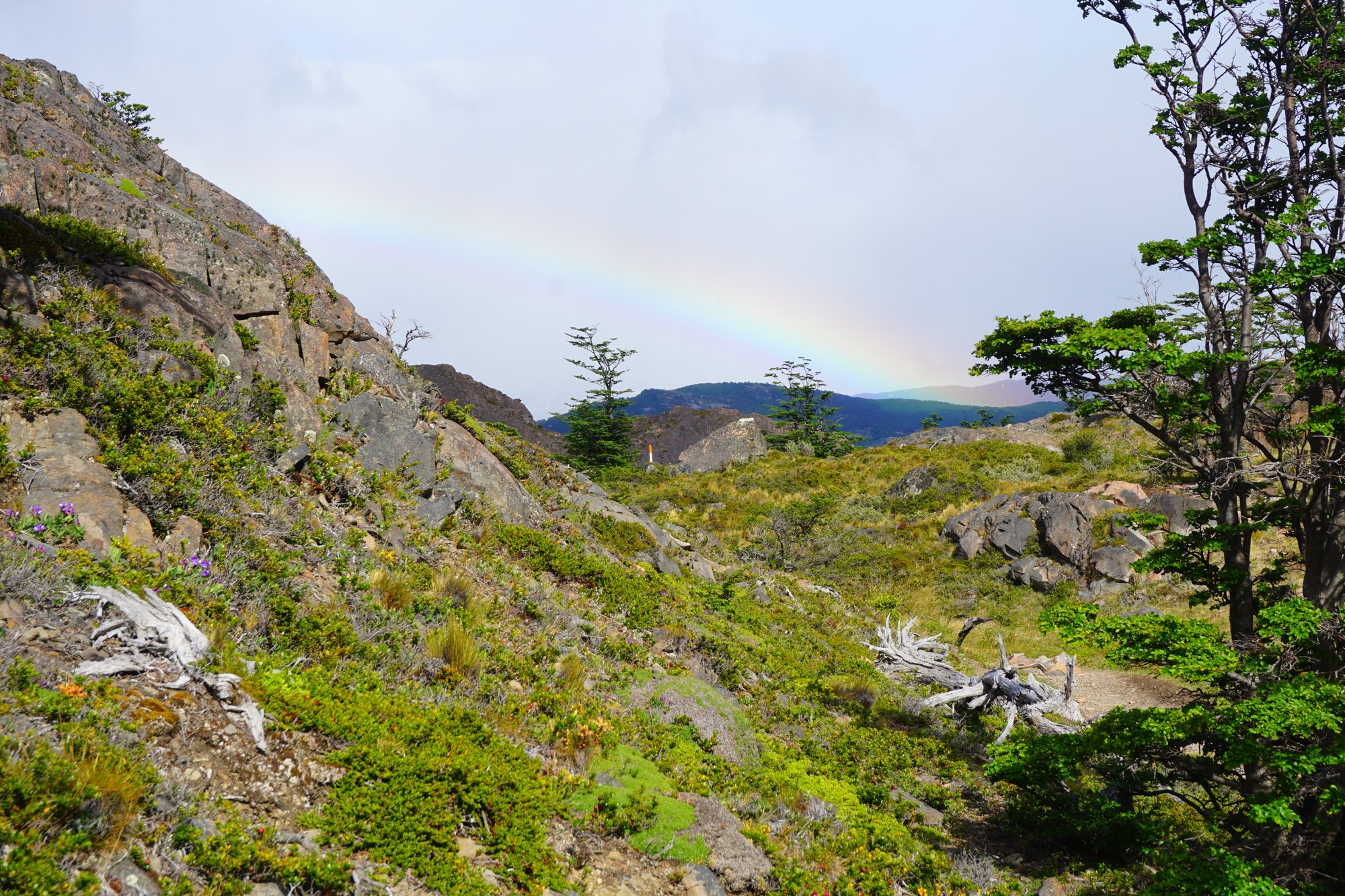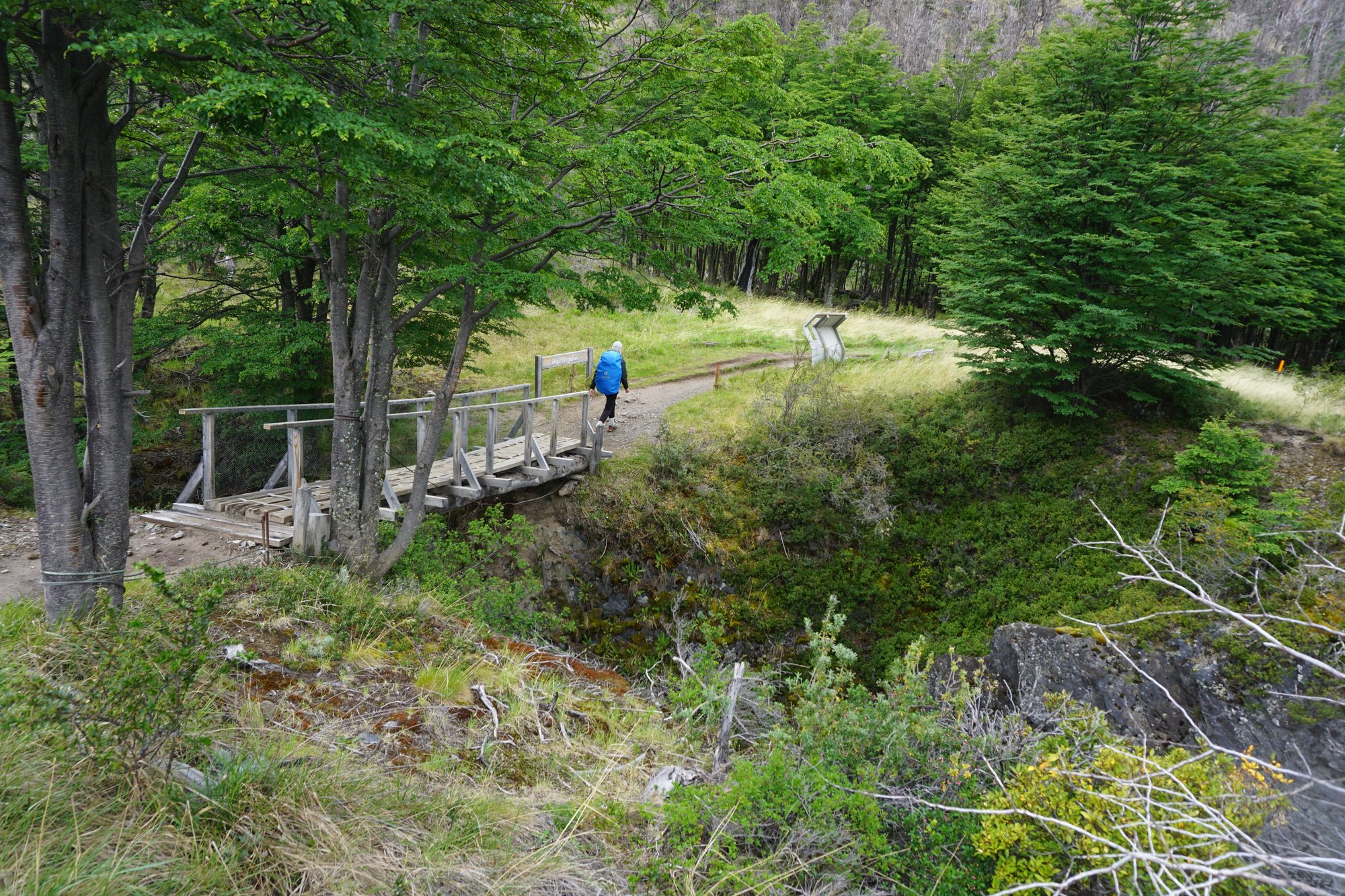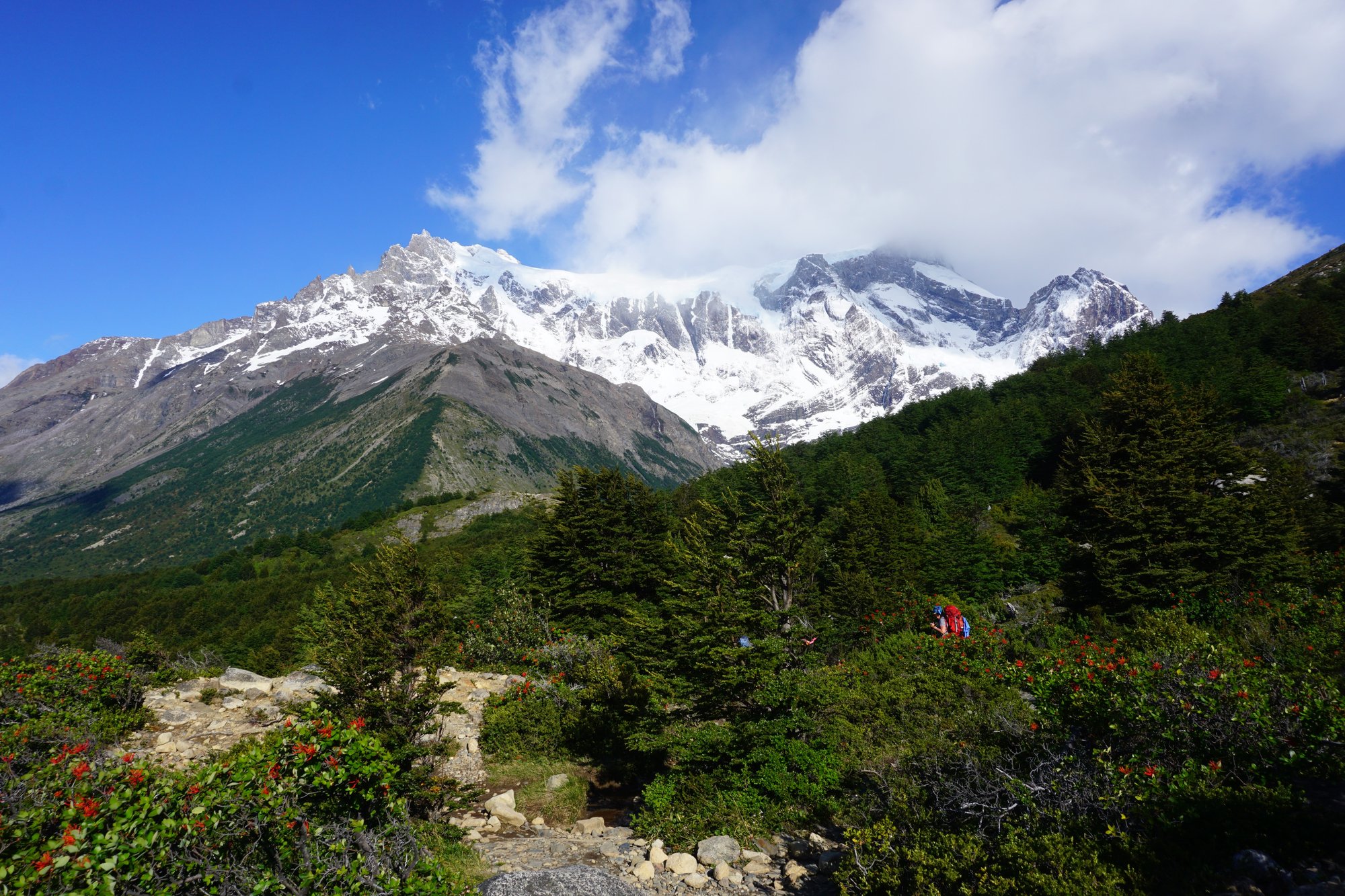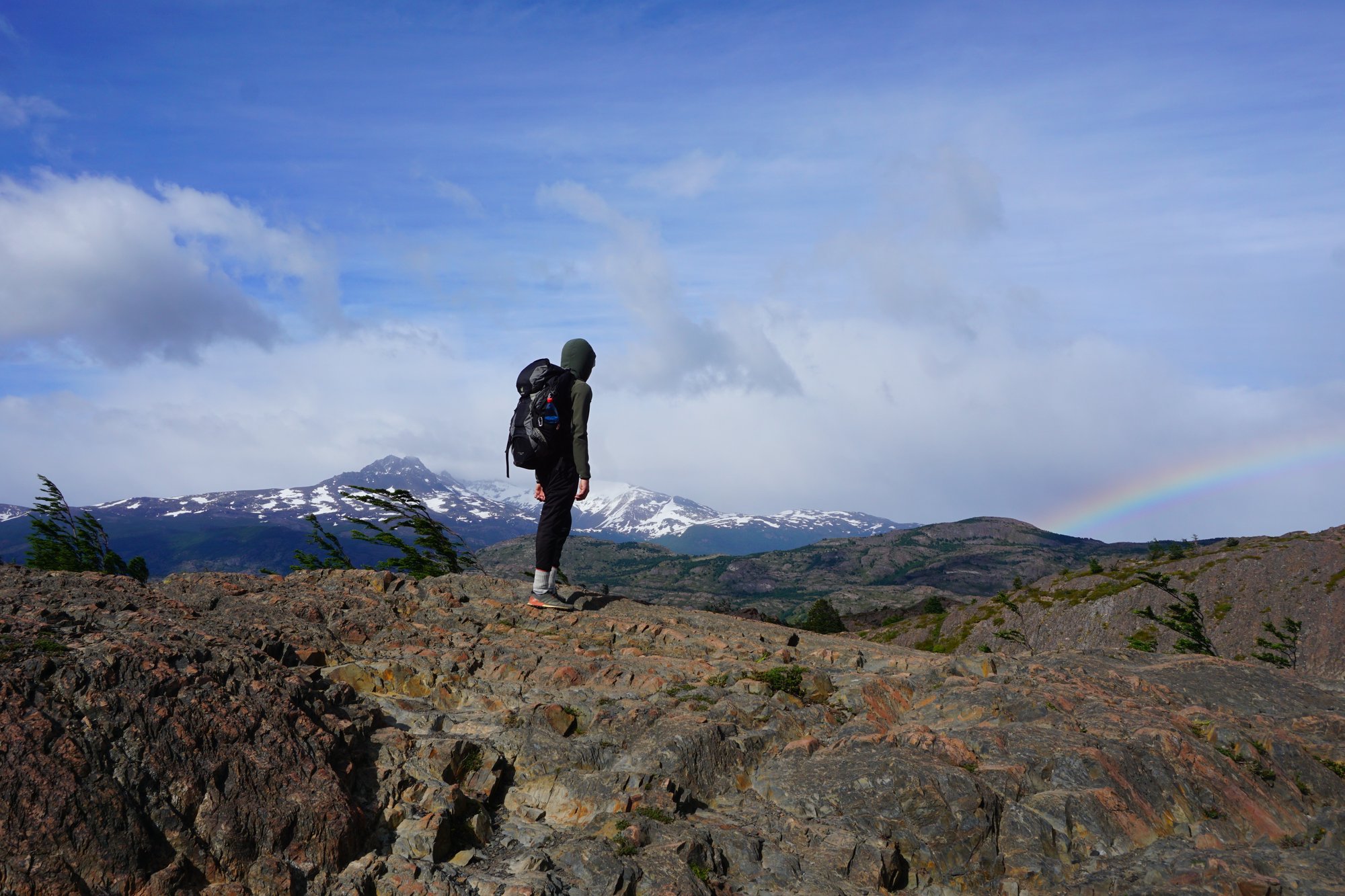 Een gedeelte van de trail is door kaal en onbeschut gebied. Hier zorgt de harde wind weer regelmatig voor wat gewiebel, zeker nu we ook nog ieder 12 kilo op onze rug dragen. Maar er zijn ook delen dat we tussen de groene bomen en struiken lopen. Net voordat we bij camping Italiano aankomen, lopen we een hangbruggetje op. Als we dan naar links kijken, valt onze mond echt open. Ineens hebben we een vrij uitzicht op een imposante berg die bedekt is met een dikke laag sneeuw. Wow!