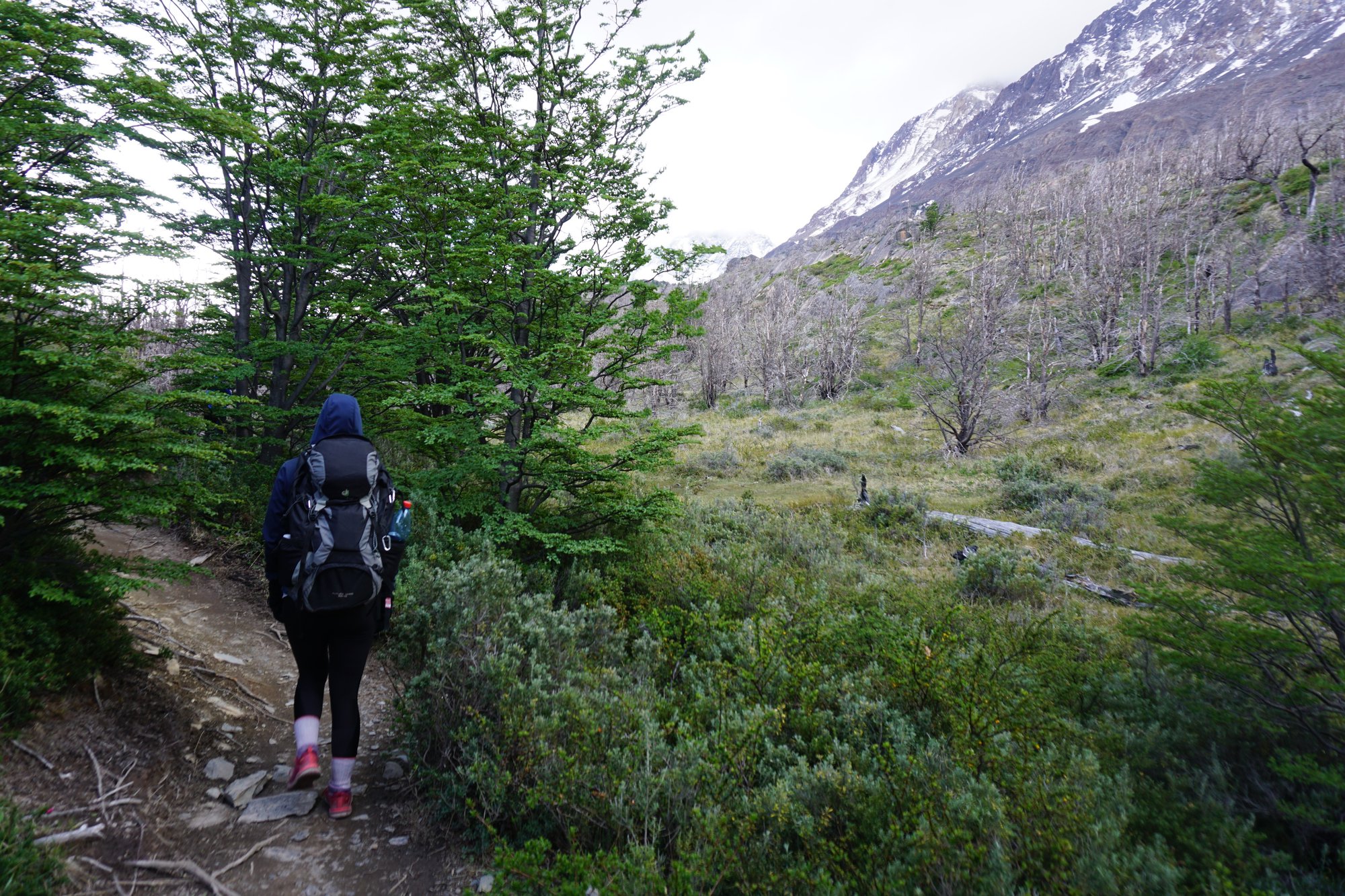 We lopen terug naar de camping en stoppen daar voor onze lunch: crackers met pate. Tja, het eten is niet heel hoogstaand de komende dagen. Het moet vooral praktisch zijn. ;-) Daarna moeten we dezelfde weg terug wandelen. Zon, regen, wind en kou wisselen elkaar constant af. Het ene moment trekken we onze regenjas aan, even later wil je je handschoenen weer uit. Zo blijven we bezig. ;-) Ik had al wel gelezen dat je in Patagonië 4 seizoenen in één dag kunt hebben, maar nu weet ik ook precies wat ze hiermee bedoelen!