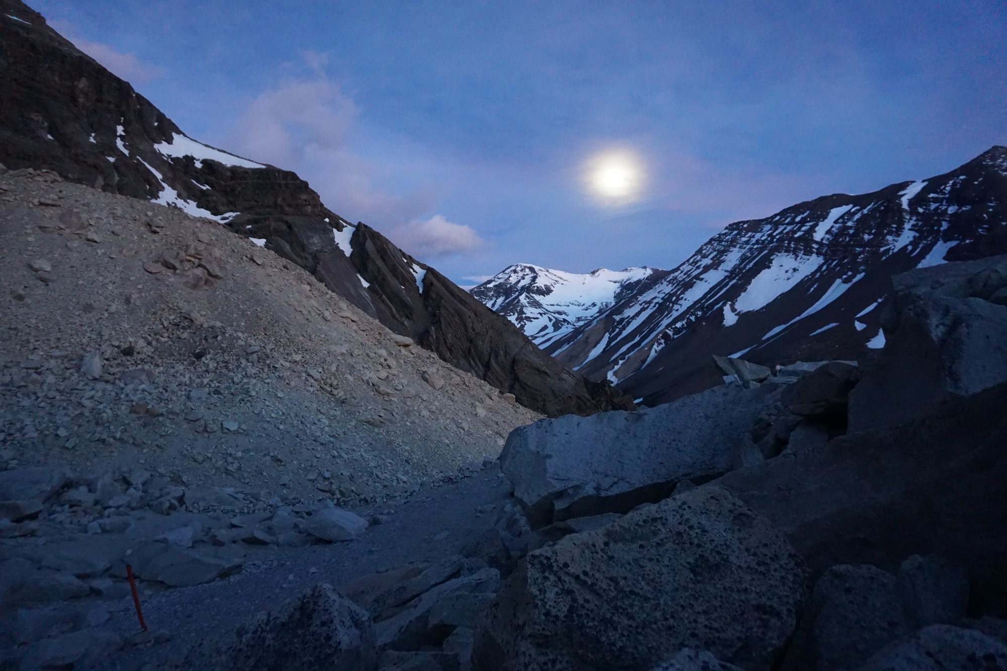Die avond kruipen we op tijd ons bed in, want we hebben een paar pittige dagen voor de boeg. In slaap komen blijkt niet alleen lastig door de kou, maar vooral ook door de wind. Het tentzeil klappert continu en doordat we zo dicht tegen de tent aan liggen, voelen we de wind tegen onze rug drukken. Soms regent het of onweert het er ook nog bij... Niet echt de ideale omstandigheden om in slaap te vallen!