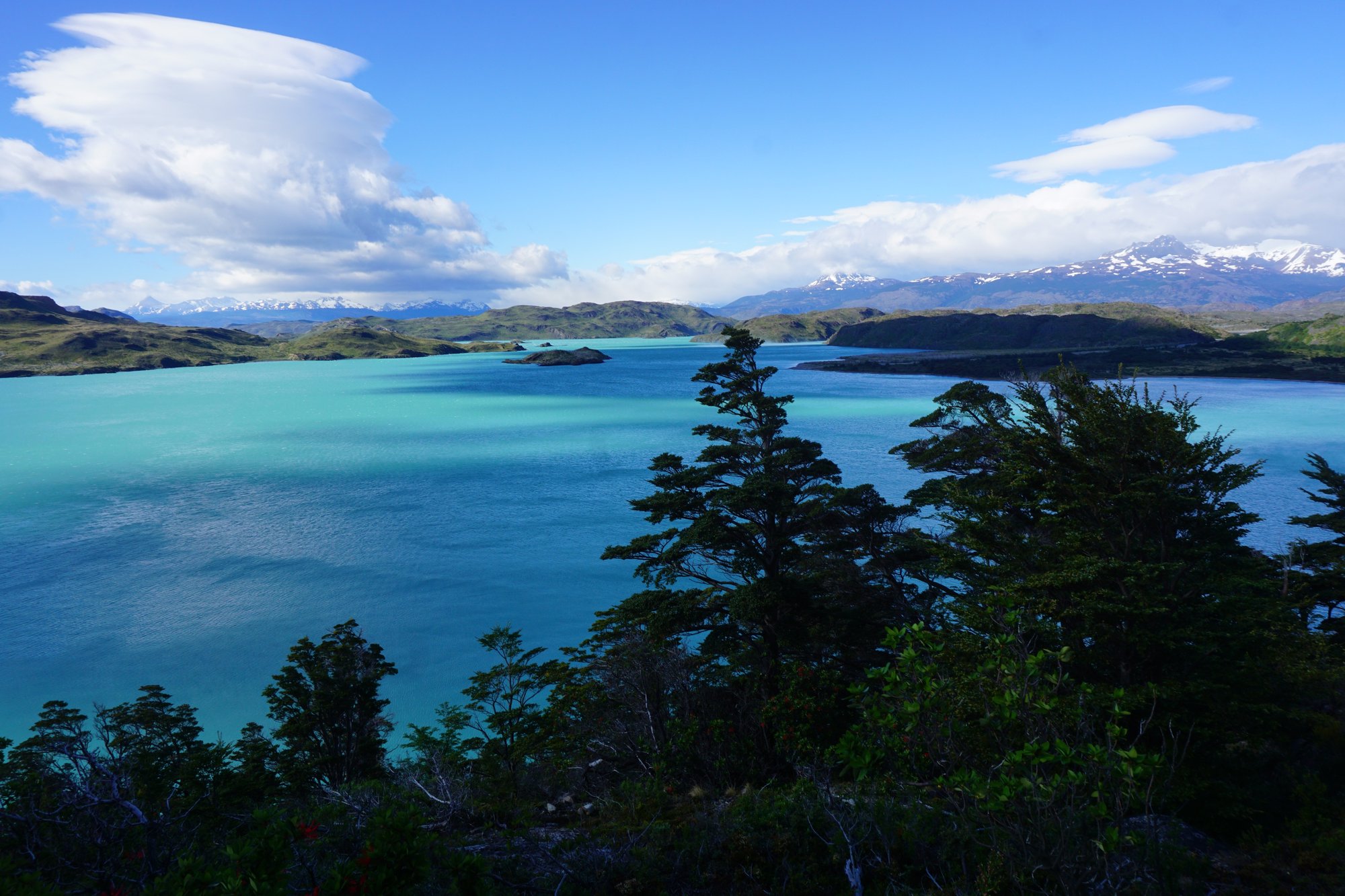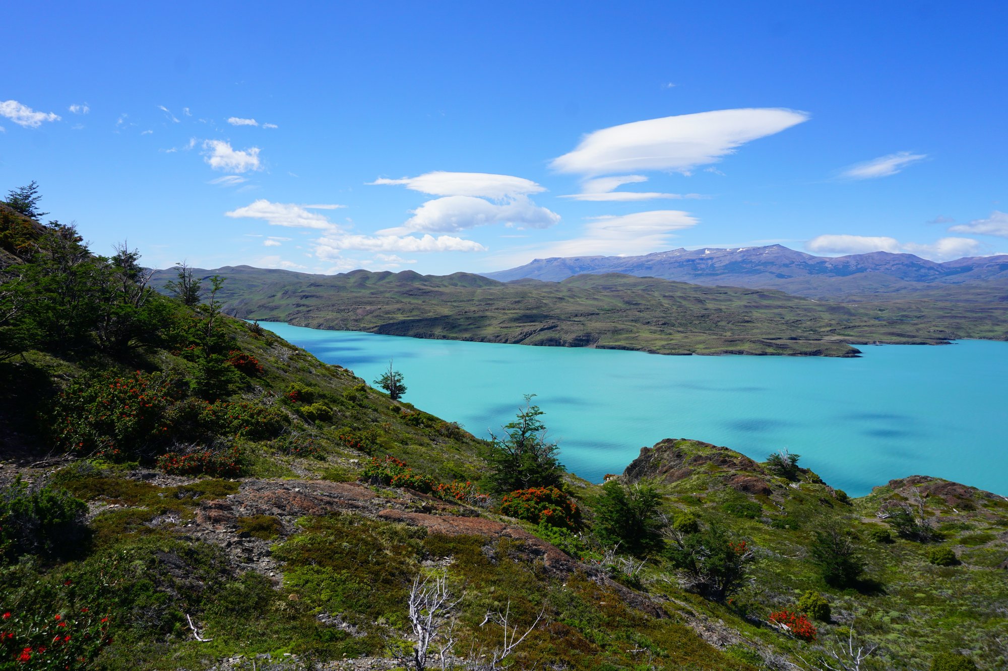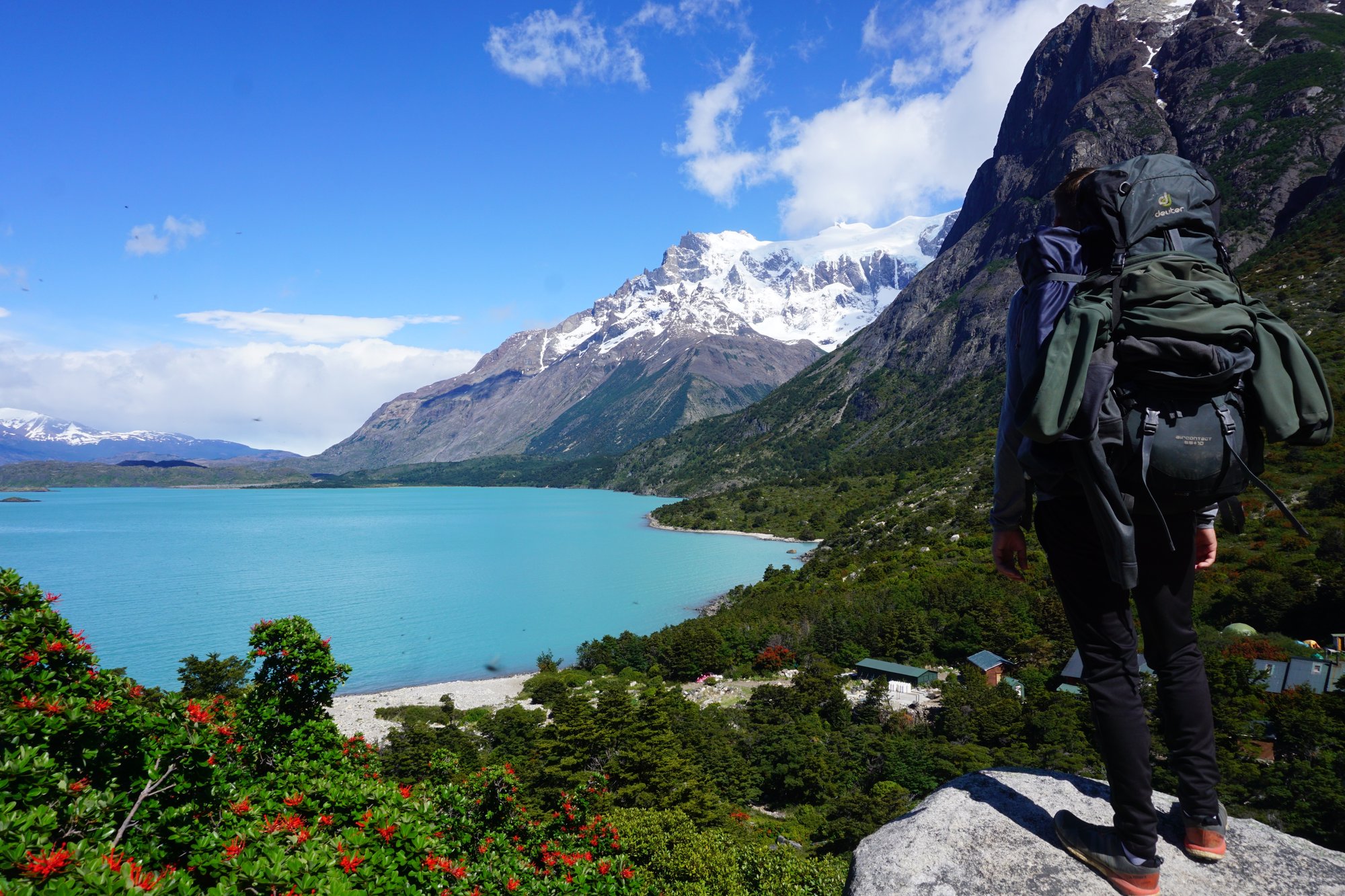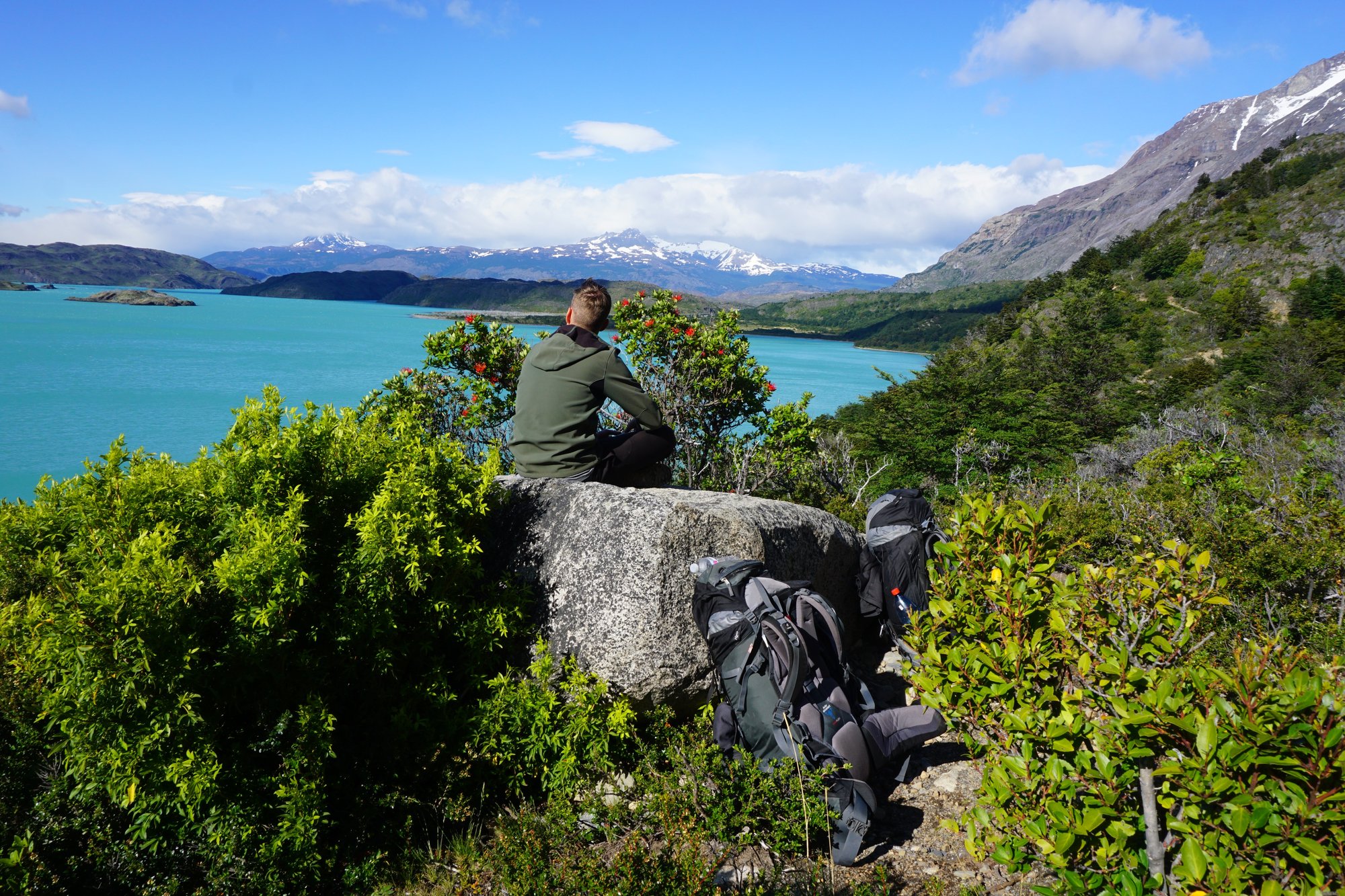 Al na enkele minuten lopen merken we hoe fijn het is als je in het zonnetje kan lopen en je niet de hele tijd die harde wind in je gezicht hebt. Alles ziet er direct leuker en gezelliger uit. We lopen bijna de hele dag langs het grote Nordernskjöld meer. Het water is blauw, in de struiken zitten rode bloemetjes en we kunnen na een tijdje zelfs in ons t-shirt lopen. Wat een contrast met de afgelopen dagen waar we we met onze muts, sjaal en handschoenen liepen en het landschap soms juist zo kaal en grijs was. Torres del Paine heeft meerdere gezichten, dat is duidelijk!