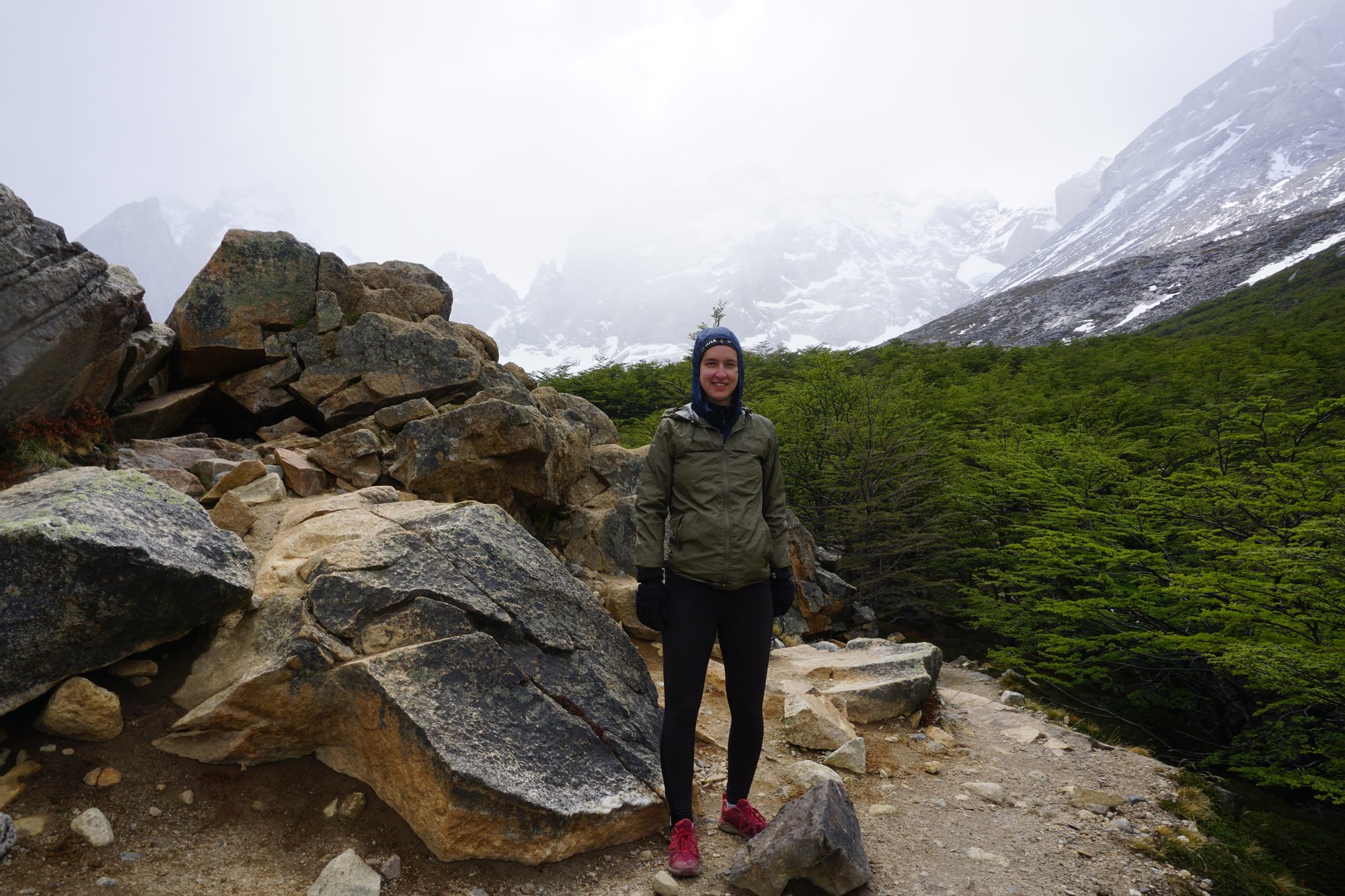 Maar, we zijn er nog niet. Het laatste deel tot het uitzichtpunt is weer echt pittig. We moeten nu klimmen met handen en voeten over grote rotsblokken. Eindelijk zijn we dan op het hoogste punt van vandaag: Mirador Britanico. Het is absoluut een topplek, maar helaas is het helemaal dichtgetrokken en zijn de bergen nu veel minder goed zichtbaar. Het waait hard en het begint te regenen. Als we hier even stil zitten, krijgen we het al snel erg koud en dus blijven we niet te lang. We hebben nog een lange weg terug voor de boeg!