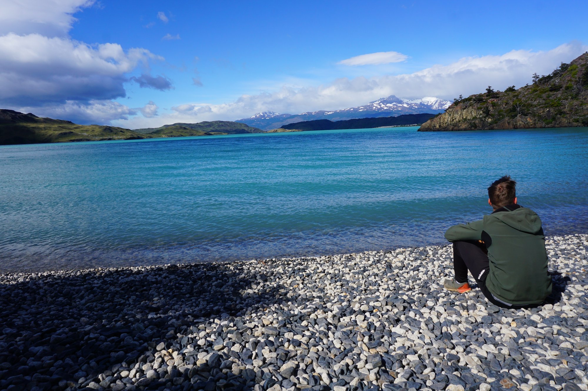 Ons eerste doel is camping Italiano: 7,5 kilometer verderop. Het weer wisselt iedere 5 minuten. Soms regent het even, dan komt de zon weer door. Aan onze rechterkant zien we het blauwe Sköttsberg meer en als we naar links kijken zien we enorme bergen met sneeuw op de toppen. Geen vervelend landschap om doorheen te lopen! ;-)