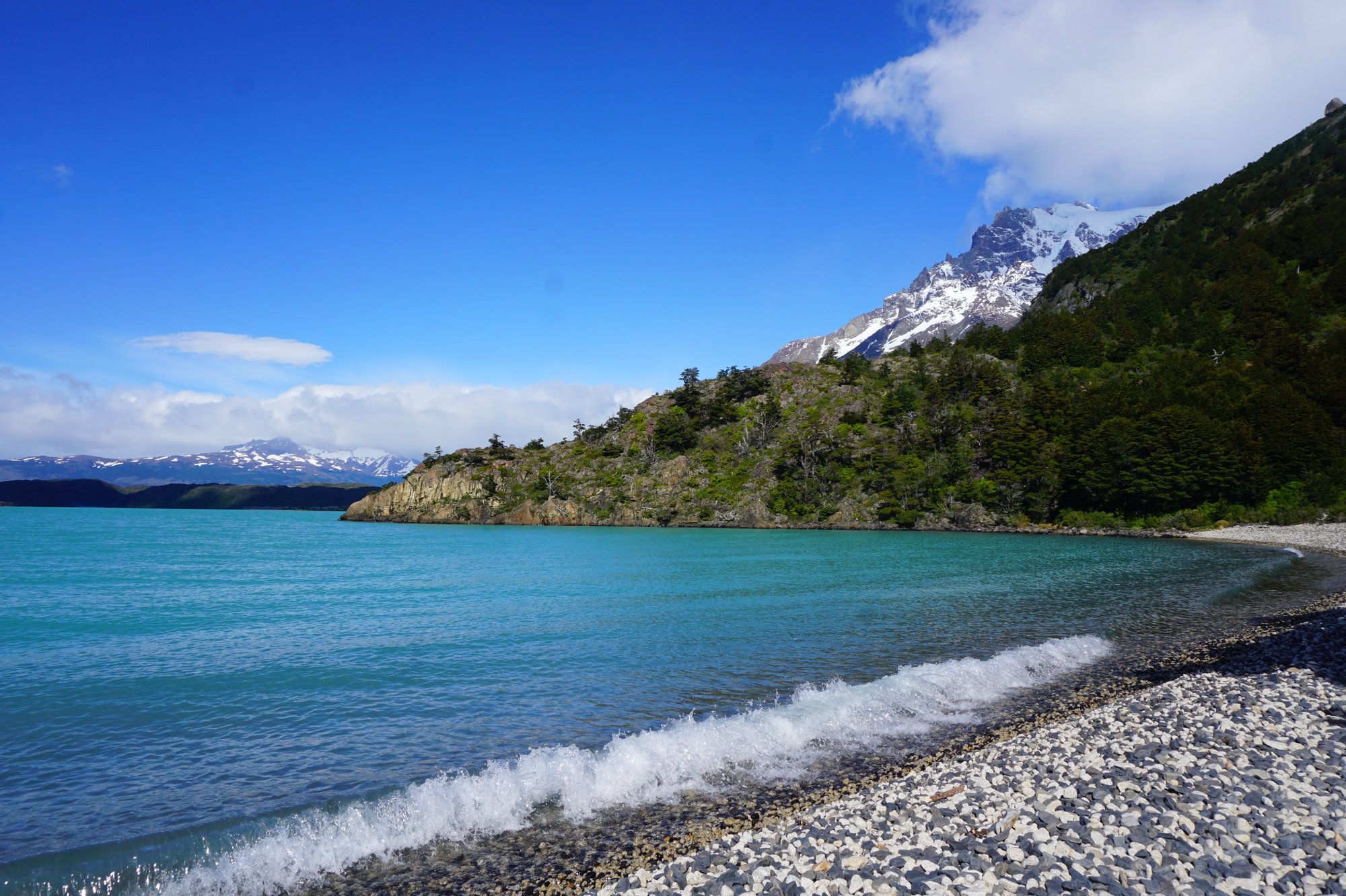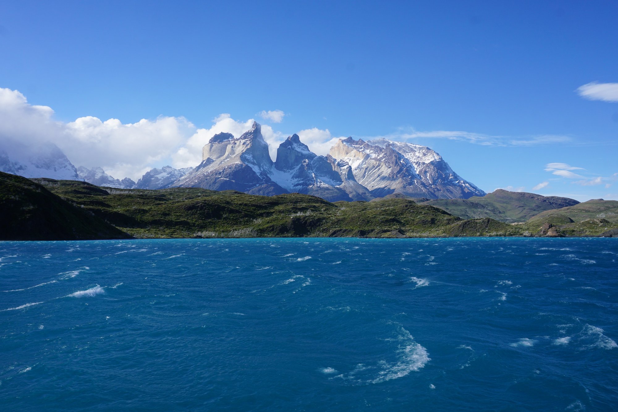 Wij stappen niet uit bij de hoofdingang, maar pas bij het punt vanaf waar de boot naar de camping Paine Grande gaat. Op deze camping gaan we onze eerste nacht in een tentje in Patagonië beleven, ik ben benieuwd! De boottocht naar de camping is prachtig. Vanaf het dak word je nat gespetterd door het ijskoude water, maar het uitzicht laat je dat helemaal vergeten.