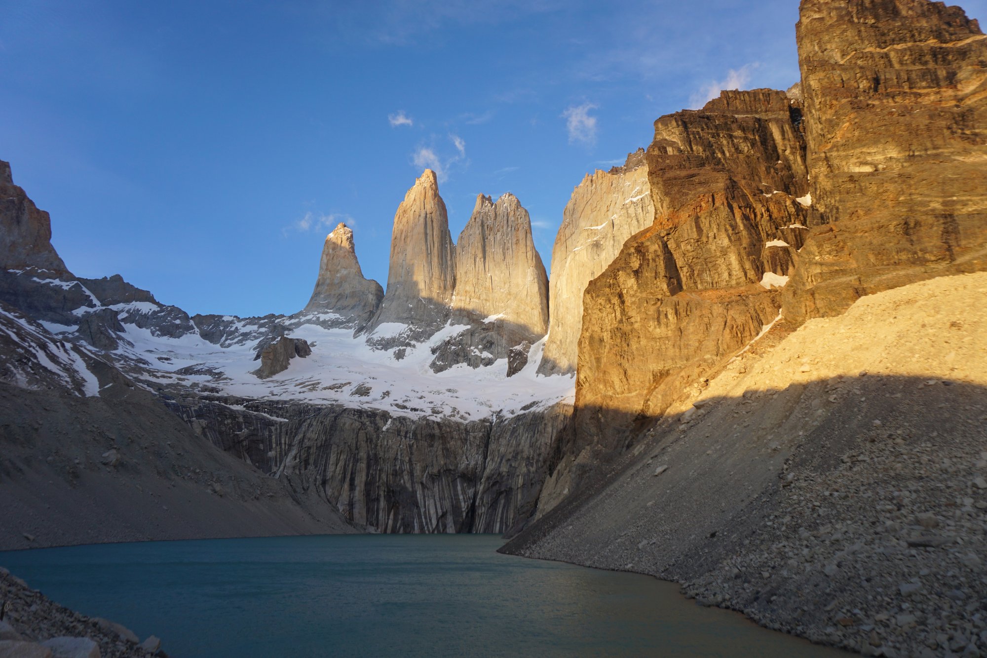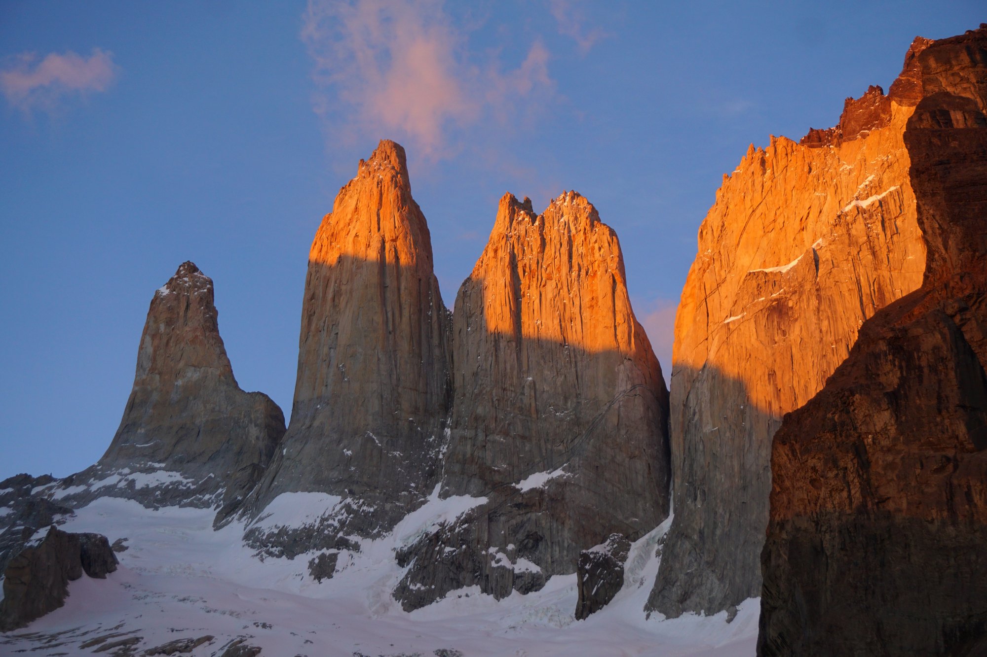 We zoeken een goede plek op de rotsen en zitten te wachten tot het natuurspektakel begint. Het is - zeker op dit tijdstip - zó koud hier. De minuten kruipen voorbij... Maar daar komt 'ie dan. Langzaam komt de zon op en geleidelijk worden de 3 puntige rotsen van Las Torres verlicht. Het gedeelte waar de zon op schijnt kleurt helemaal oranje. De rest van de rotsen blijft grijs. De strakke lijn tussen het oranje en grijze deel zakt steeds verder naar beneden. Een onwerkelijk plaatje! En zo bijzonder om dit al zó vaak op internet gezien te hebben en dat we hier nu zelf zitten.