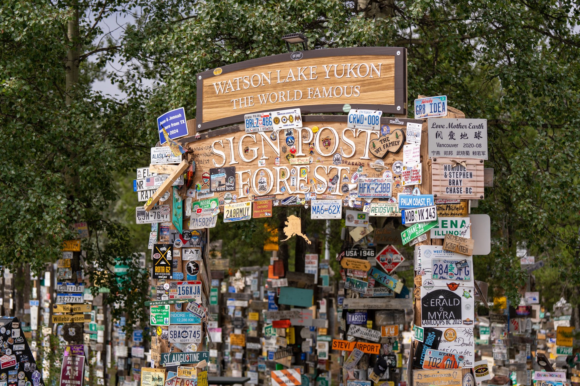 In Watson Lake doen we wat klusjes (tanken, water vullen, boodschappen) en bezoeken we het Signpost Forest. Dit bos van wegwijsbordjes is ontstaan in de tijd dat de Alaska Highway aangelegd werd. Een militair die in de regio aan het werk was had heimwee en hing daarom een bordje op met een verwijzing naar zijn eigen woonplaats. Dat heeft de toon gezet voor wat nu is uitgegroeid tot Signpost Forest. Ontelbaar veel bordjes met plaatsen uit de hele wereld!