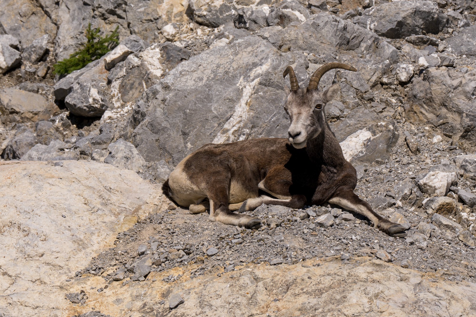 De volgende 100 kilometer van Stone Mountain Park tot Muncho Lake zijn een traktatie van de natuur. We rijden tussen de bergen, overal staan bloemetjes in bloei en naast ons kronkelt een blauwe rivier. We spotten ook nog wat wildlife aan dit deel van de route: 4 wapitiherten en wel meer dan 20 dunhoornschapen. Dat is een soort mix van een schaap en een geit en dan met grote hoorns. Cool om te zien!