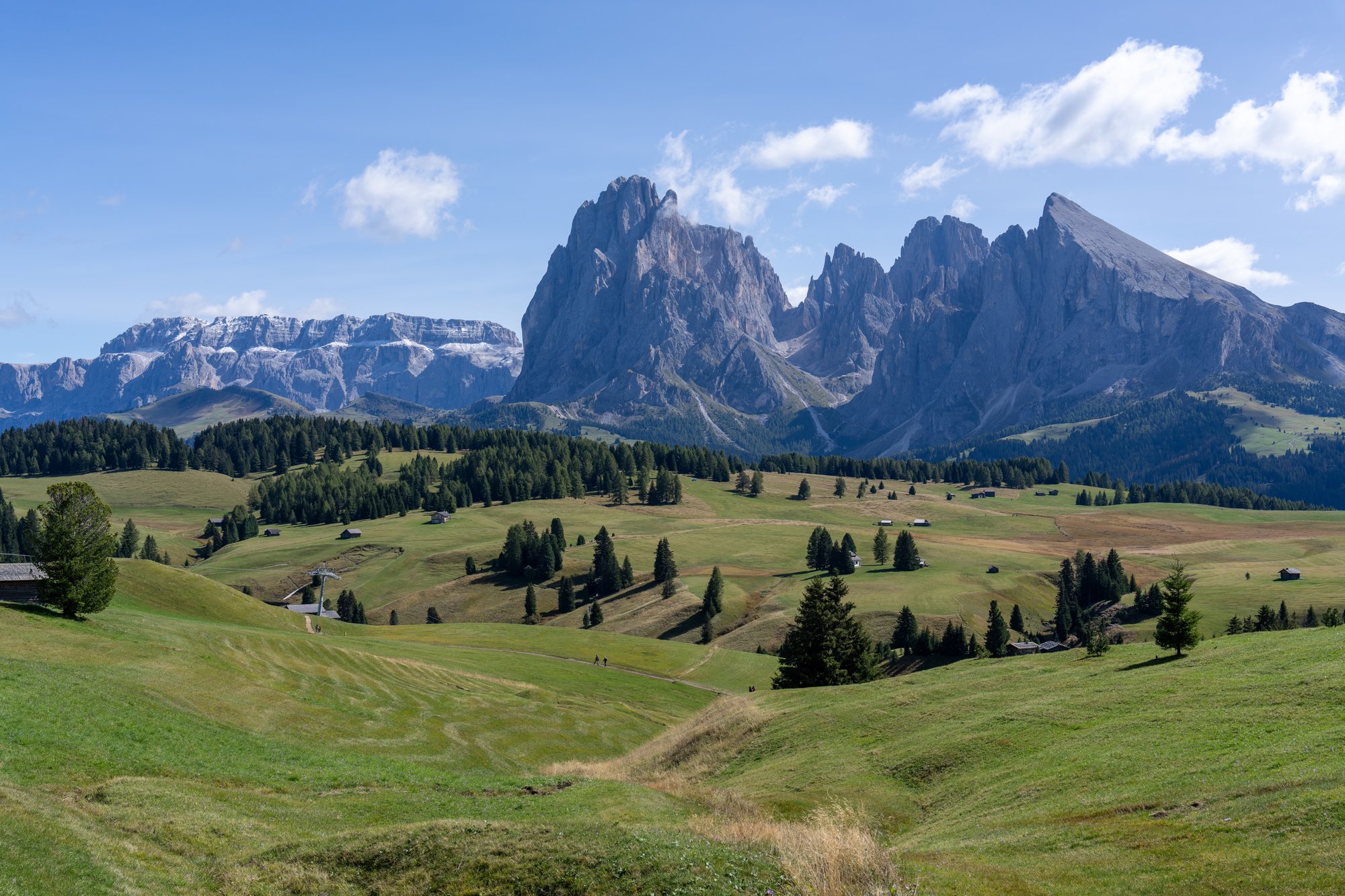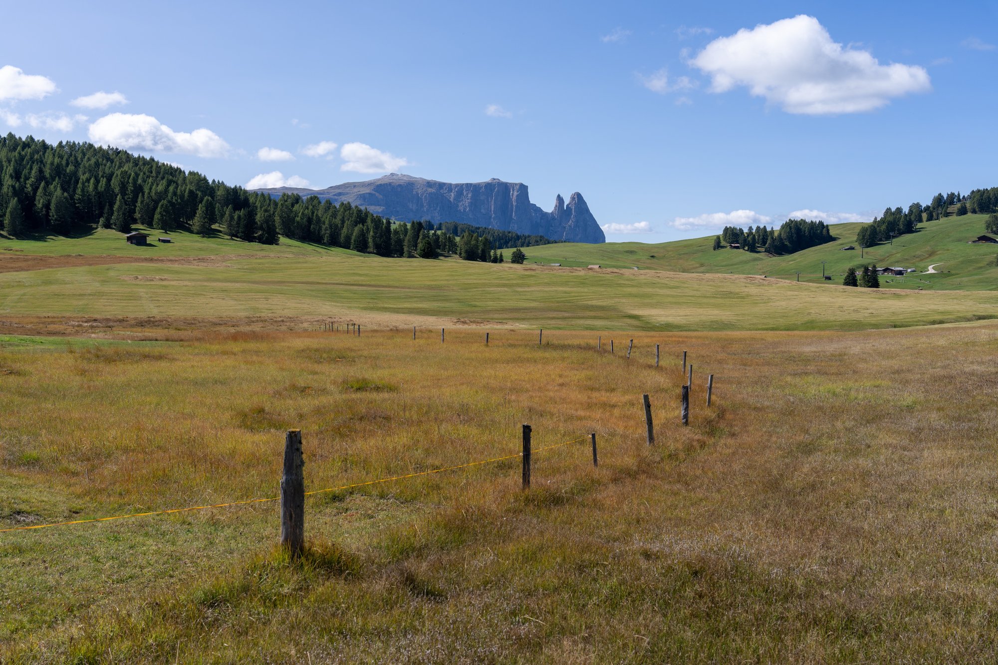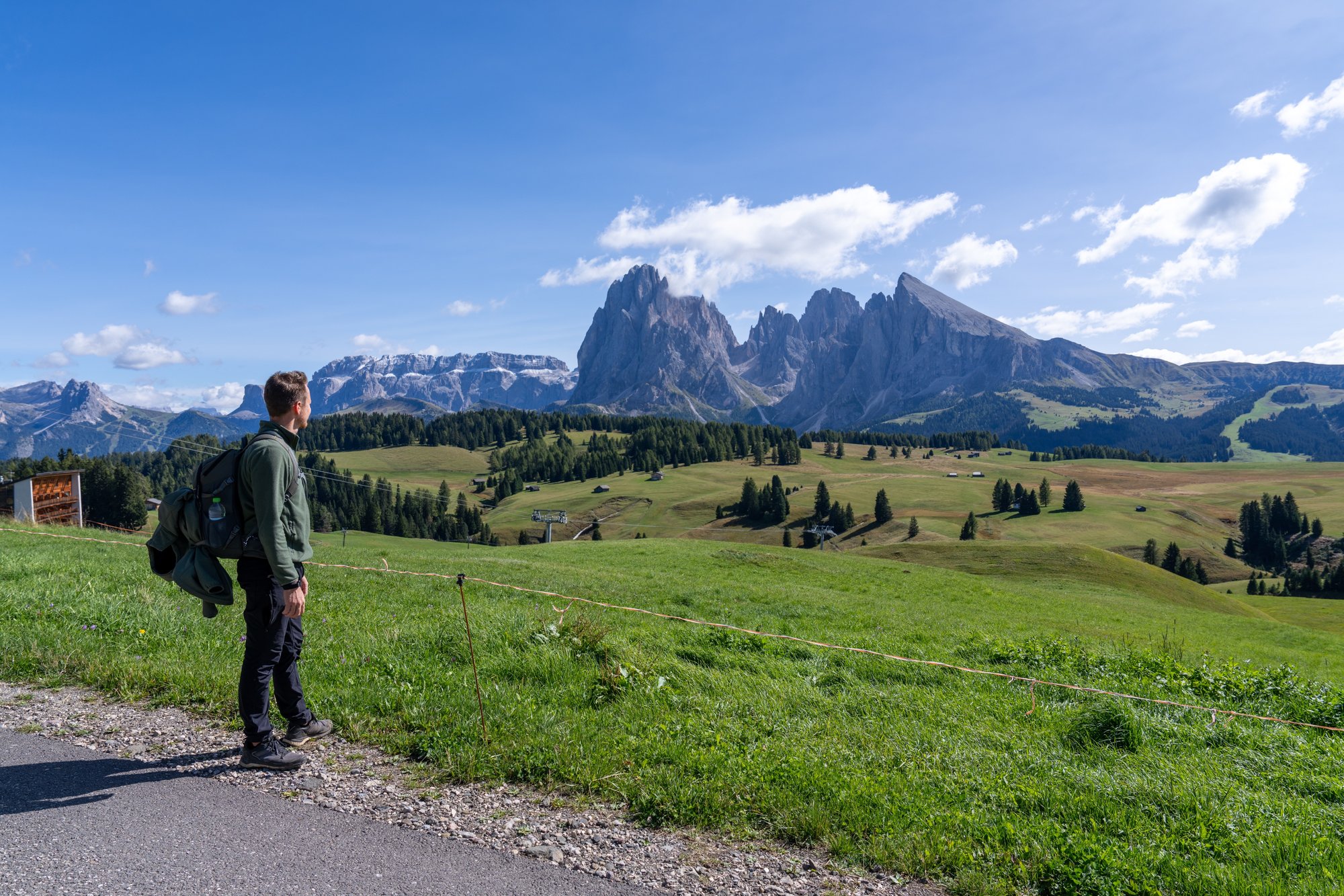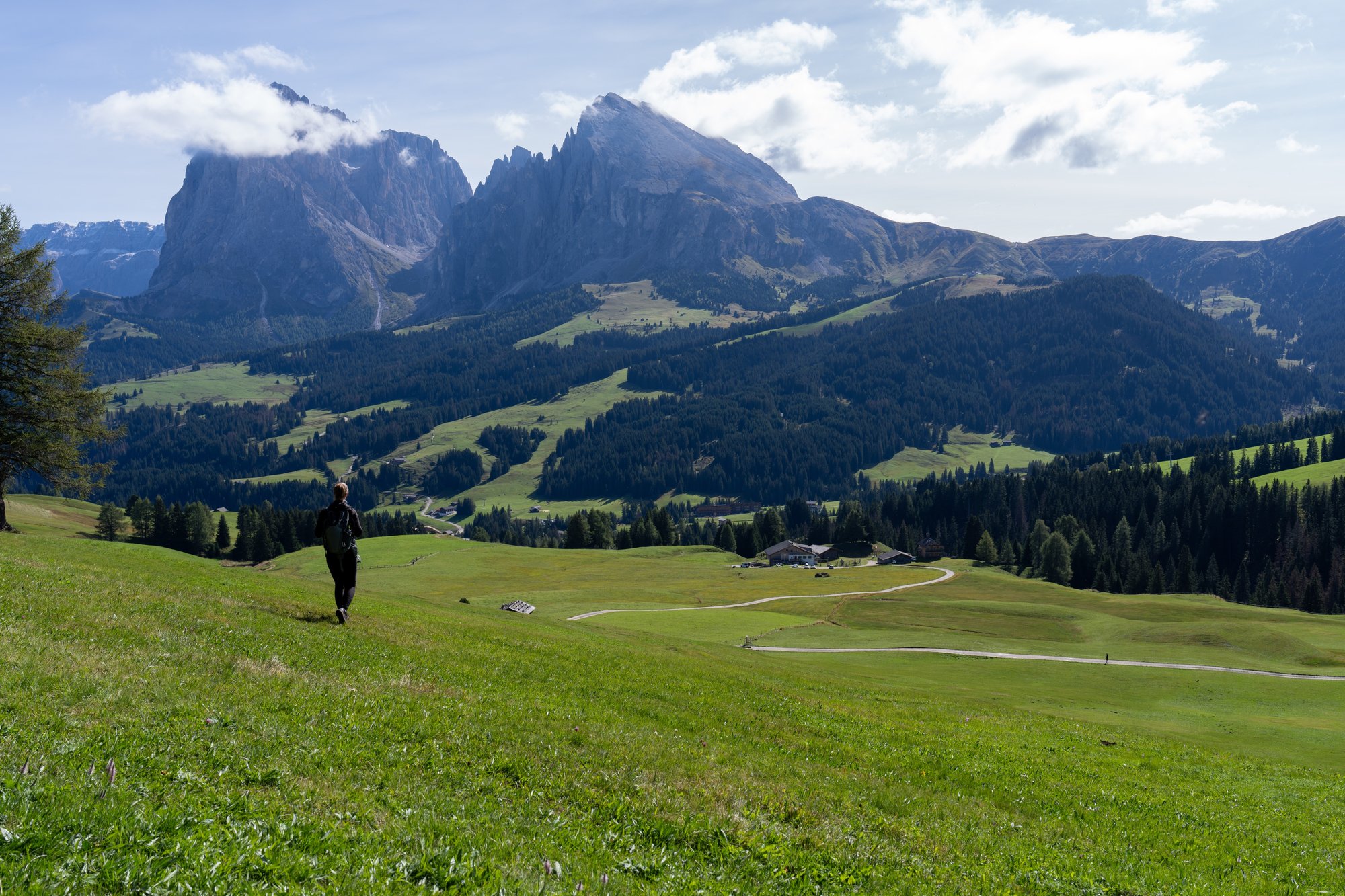 Iets verderop staan we op één van de glooiende heuvels van Alpe di Siusi en kunnen we ineens over een heel ander gedeelte van de bergweide kijken. Als we nu achterom kijken, dan steken de grijze Sassolungo bergen recht omhoog vanuit het gras. Ziet er mooi uit!