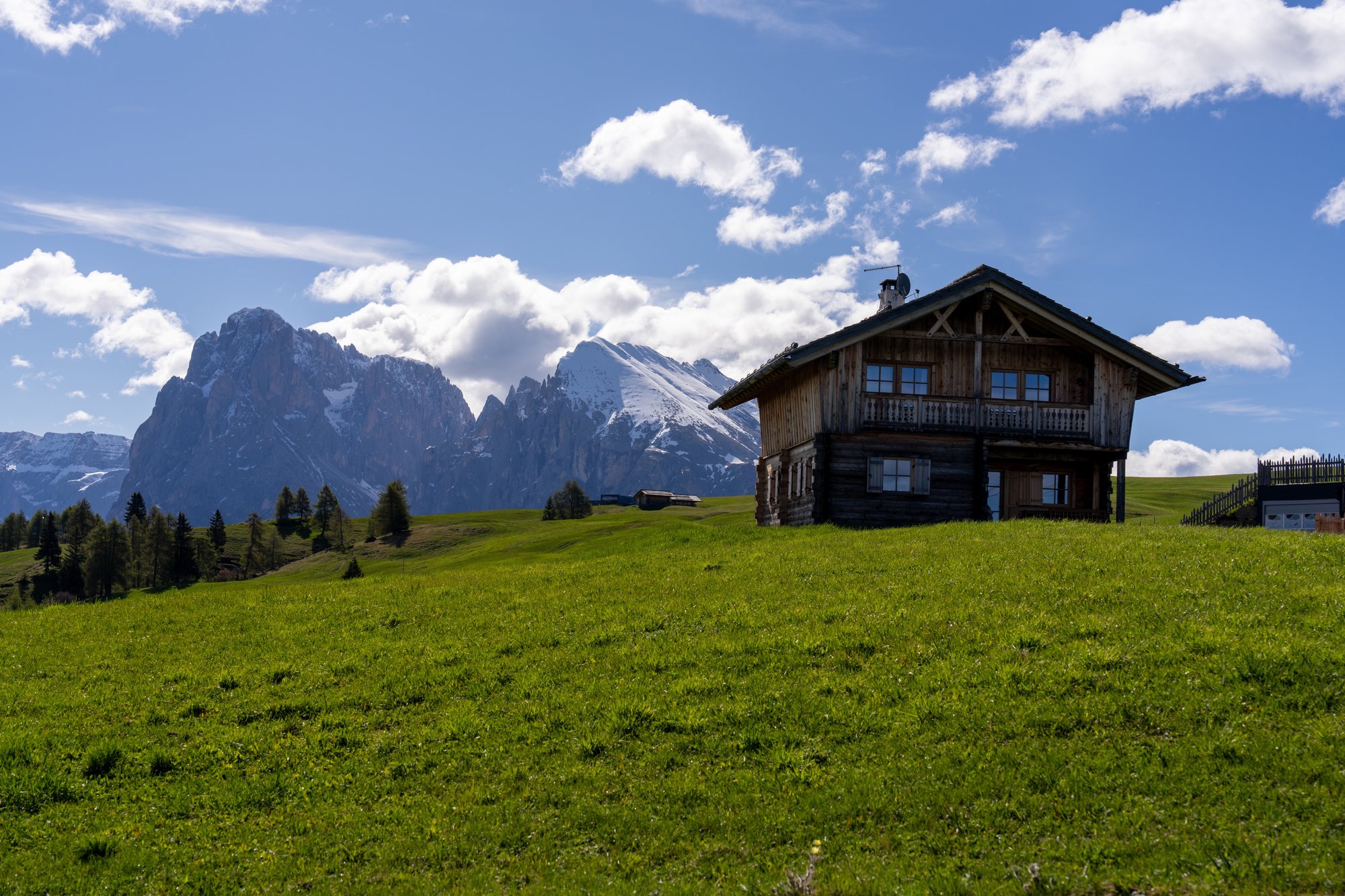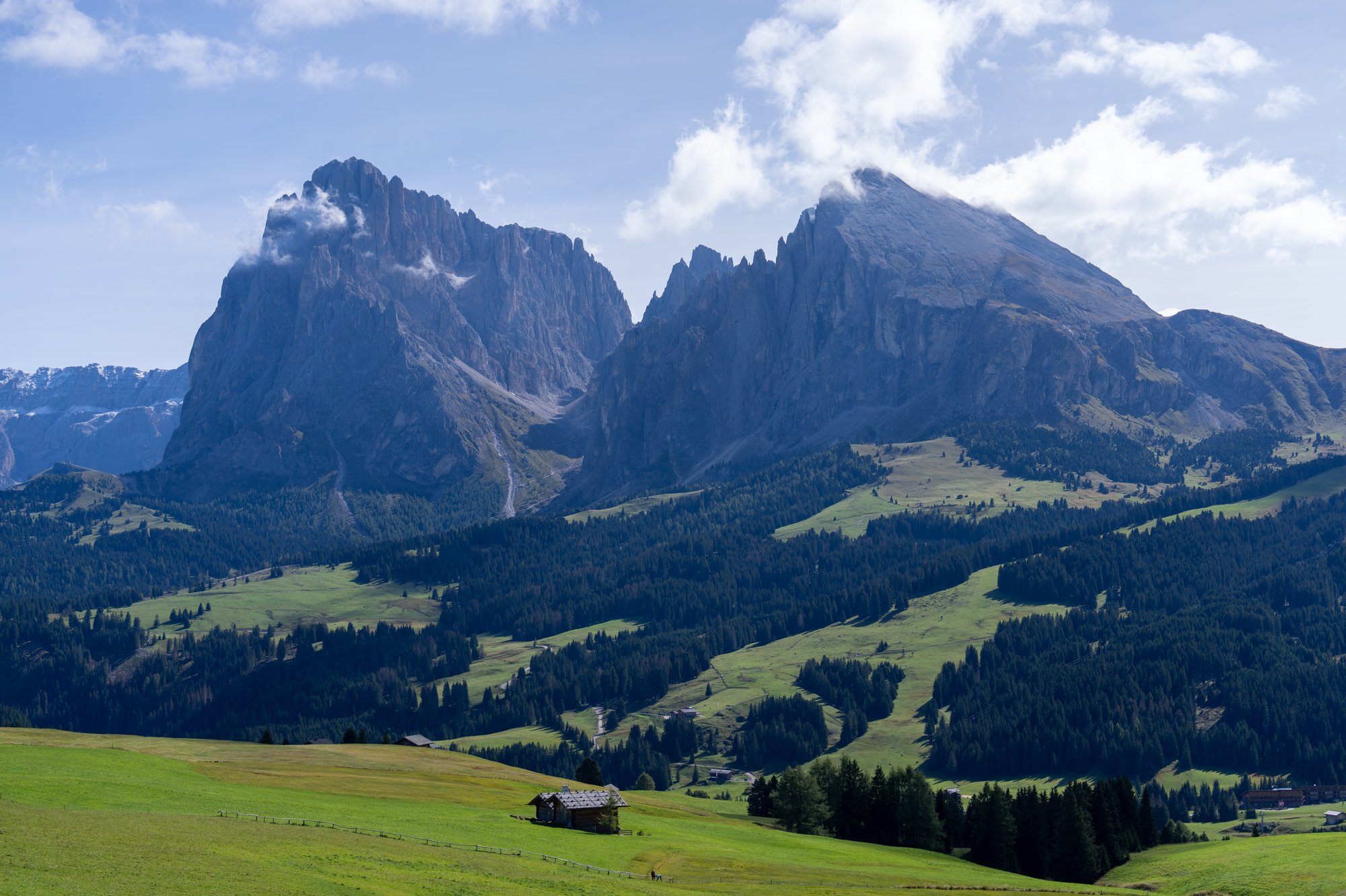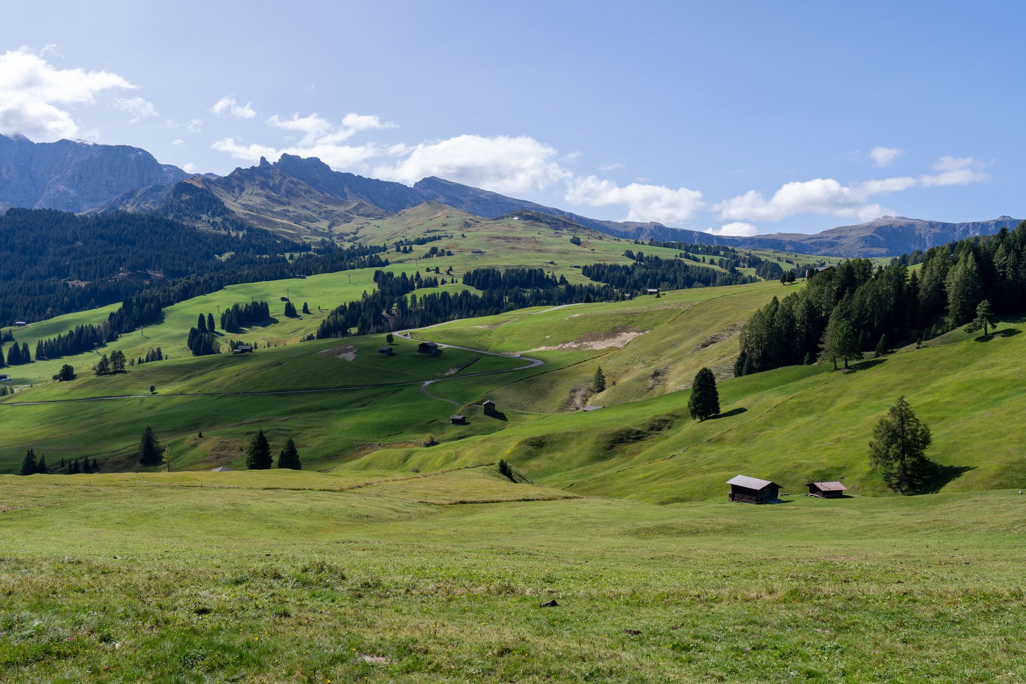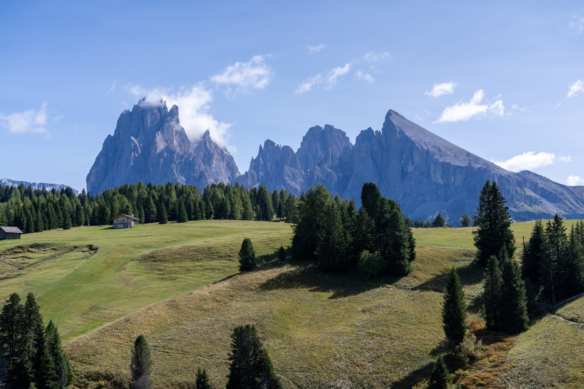 Rond half 2 bereiken we het volgende hoogtepunt van vandaag: de fotospot vlakbij de Adler Lodge. We hadden even onze twijfels, maar moeten andere bloggers inderdaad gelijk geven: dit is de beste plek om Alpe di Siusi vast te leggen. Vanaf hier zie je namelijk alles waar de Seiseralm bekend om is: de glooiende heuvels, houten hutjes en rauwe bergen. We zijn blij dat we de route in deze volgorde hebben gelopen, want in de ochtend zou je hier tegen de zon in fotograferen.