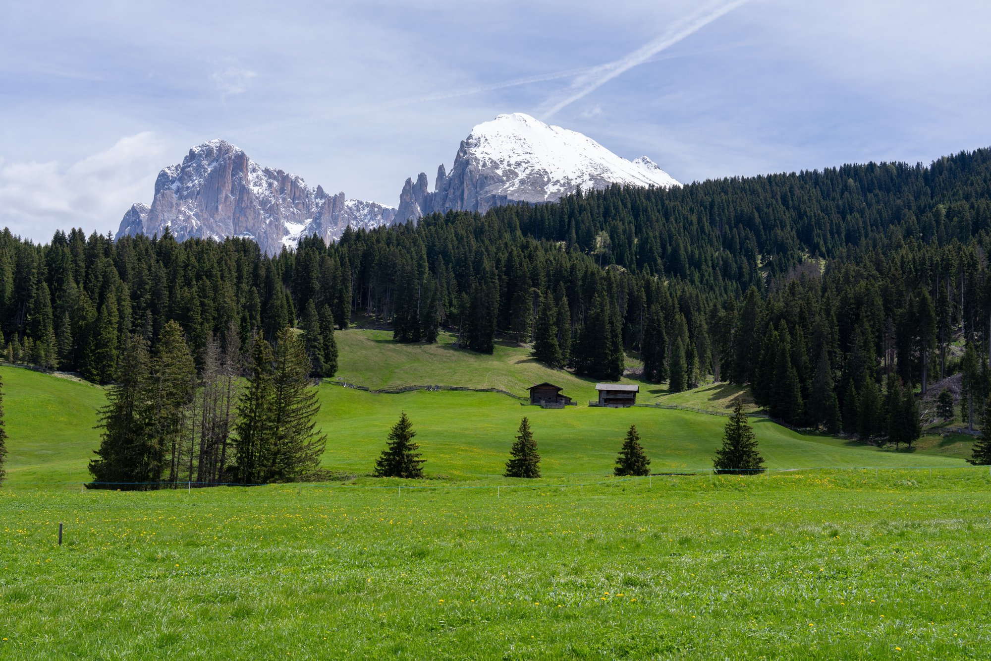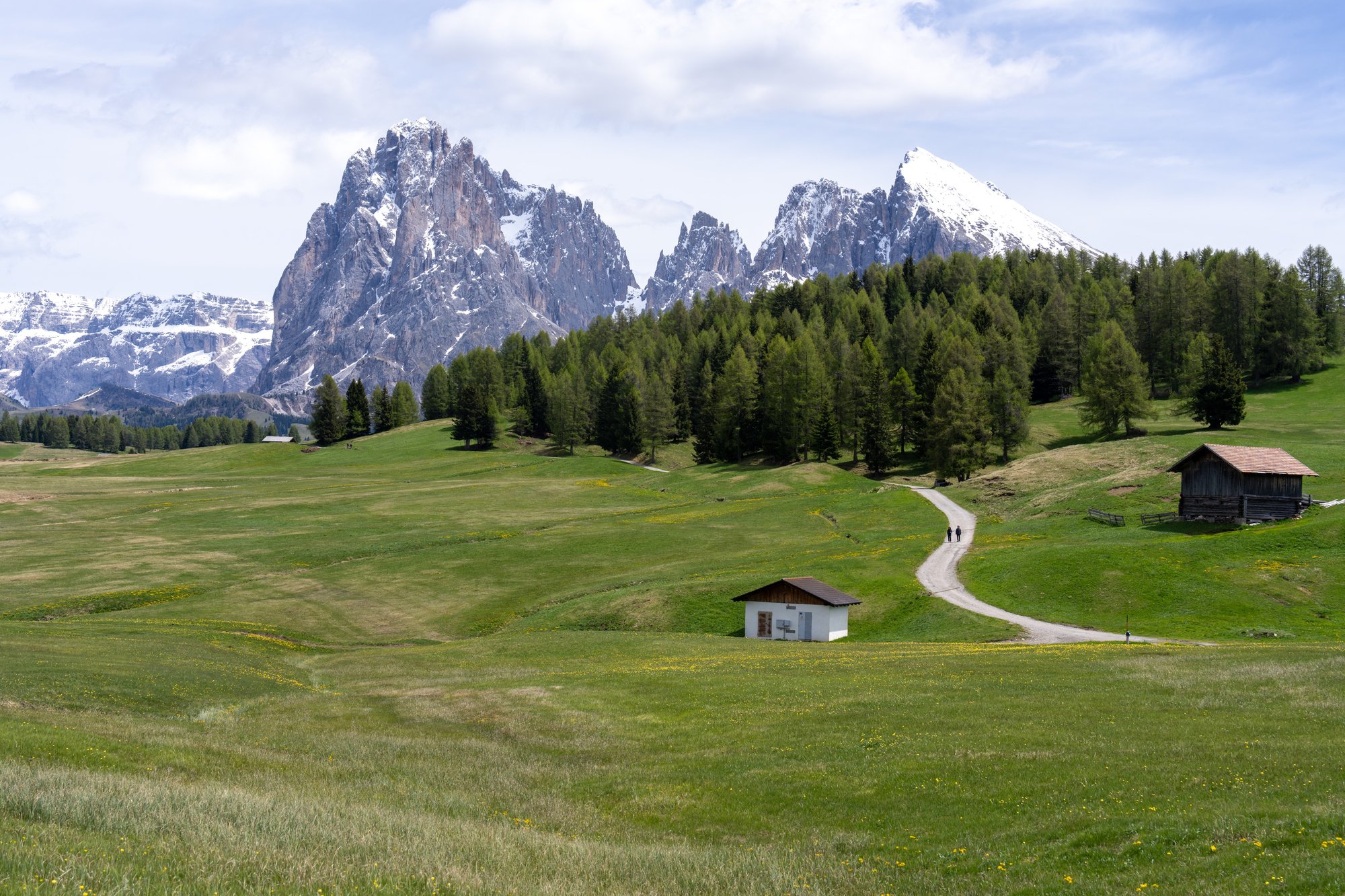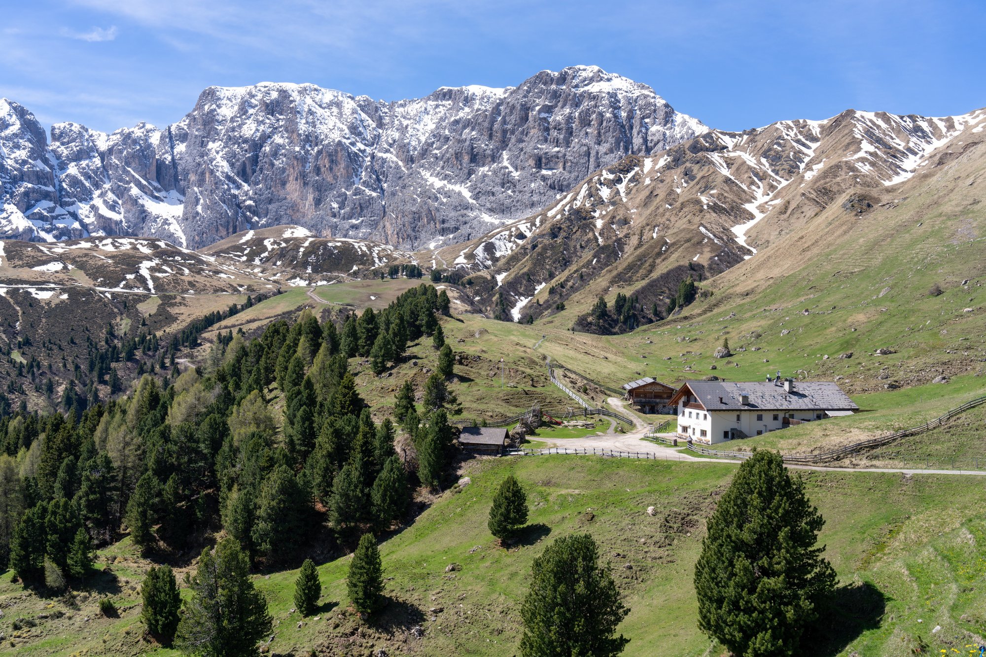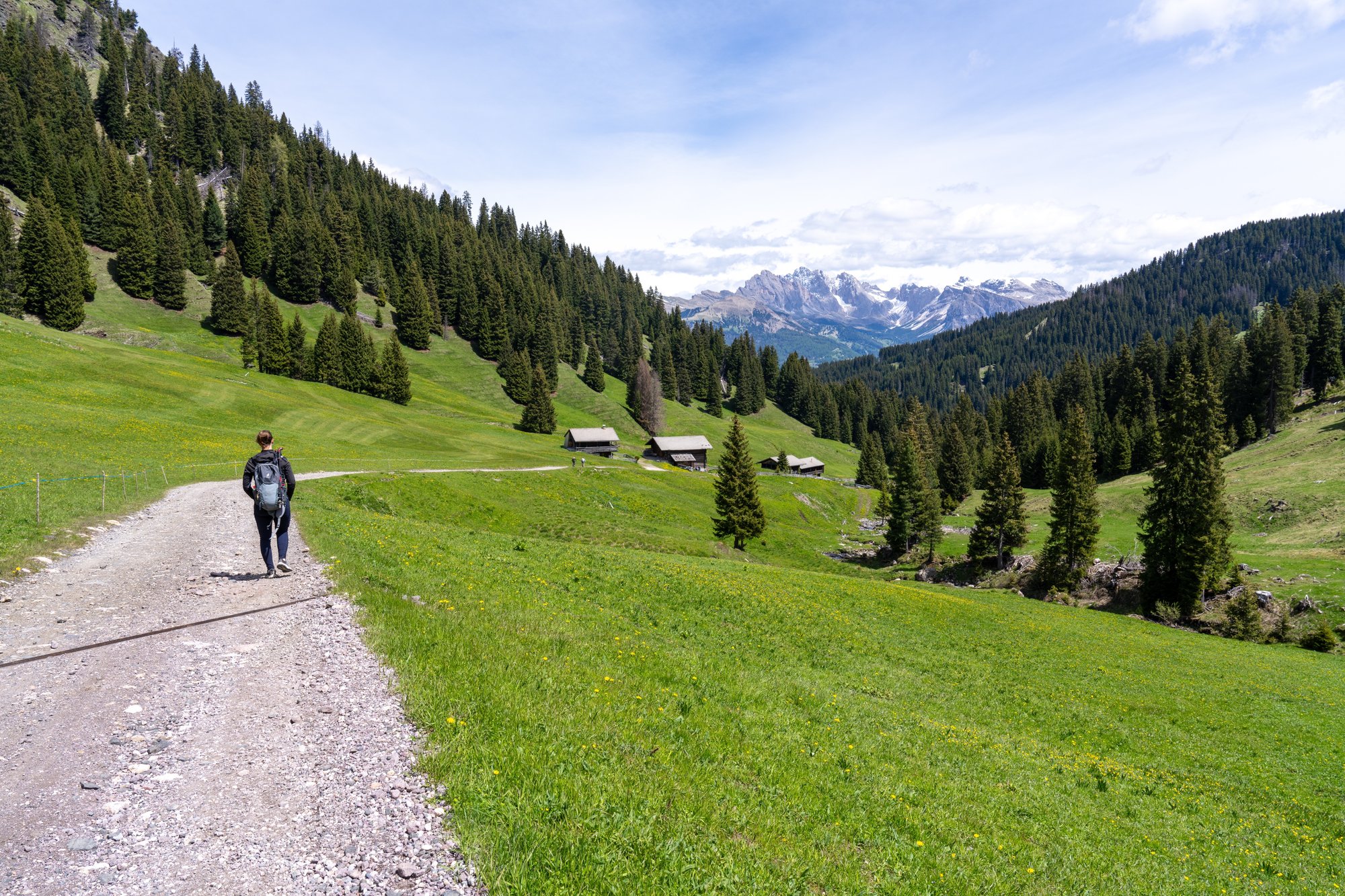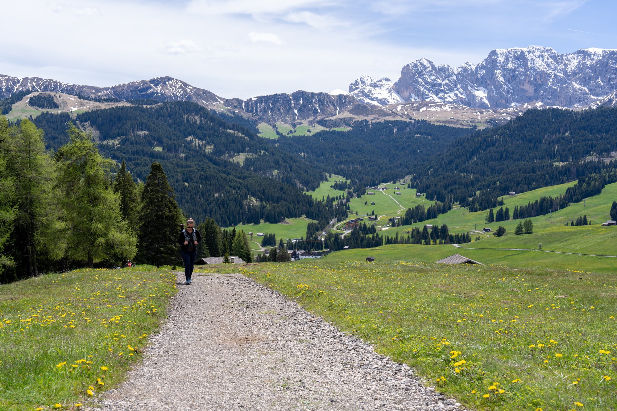We lopen de grassige alm op, richting Alpenhotel Panorama. Veel berghutten hebben hun deuren nog niet geopend voor het zomerseizoen, maar dit hotel zou wel open moeten zijn. En wij hebben wel zin in een bakje koffie na onze vroege wekker vanmorgen. Het eerste stuk volgen we een geasfalteerd weggetje waar nog verbazingwekkend veel verkeer overheen rijdt. Best irritant eigenlijk, want de weg is zodanig smal dat wij steeds in de berm moeten gaan staan. Onderweg openen de uitzichten op Seceda en Sassolungo zich voor ons en ook al weet je al wat er komt, dat blijft ongekend mooi. Een kopje koffie with a view!