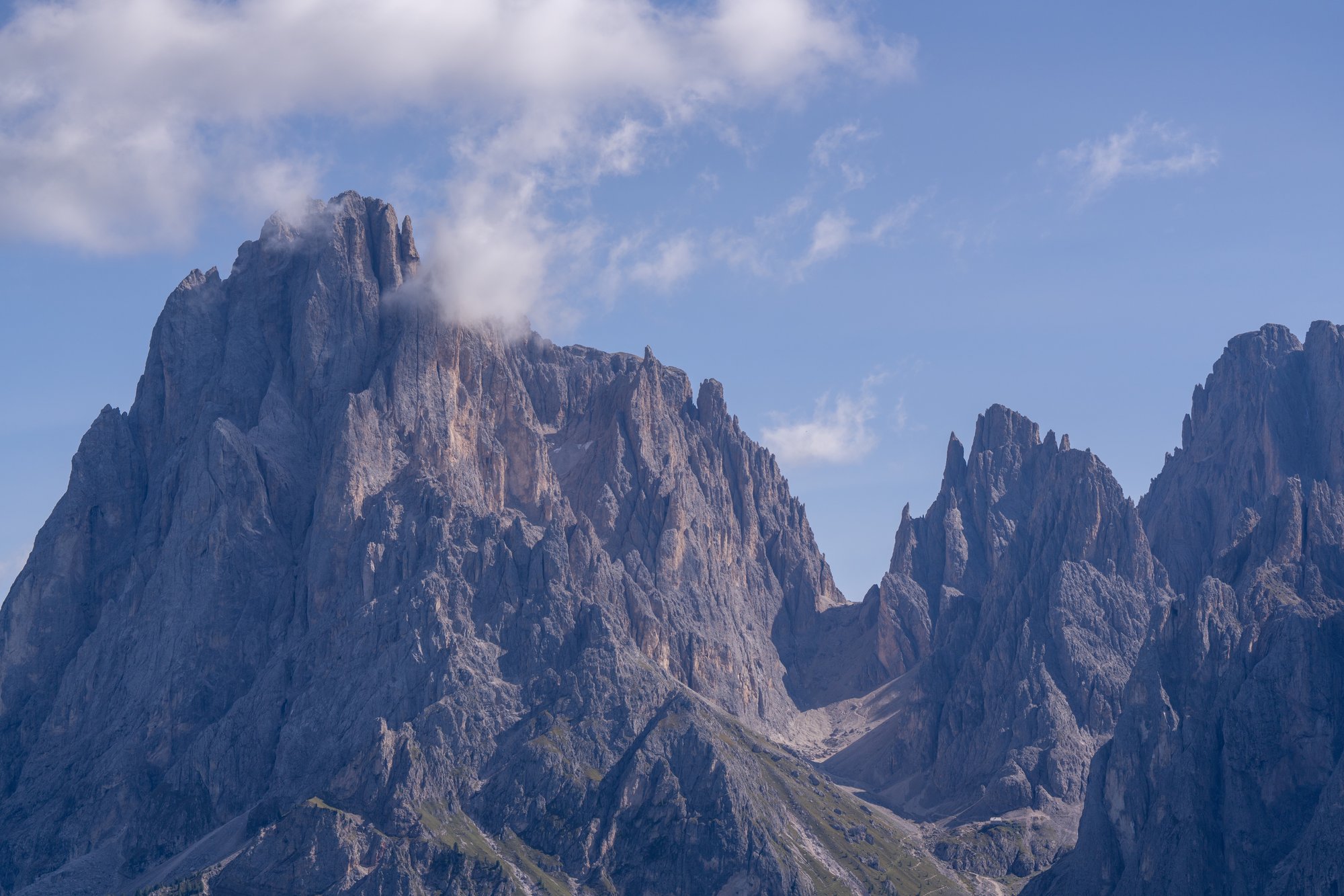 Onze blik valt continu op de Sassolungo. Tijdens dit deel van de hike heb je bijna continu vrij zicht op deze kolos van een berg. Dit keer ligt er nog sneeuw bovenop en dat maakt het geheel nog interessanter. Ondertussen komen we dichterbij de berghut en de hogere bergen die daarachter liggen. Deze bergen scheiden Alpe di Siusi van de Rosengarten bergketen. Dat is het gebied waar je de majestueuze Vajolet Towers vindt.
