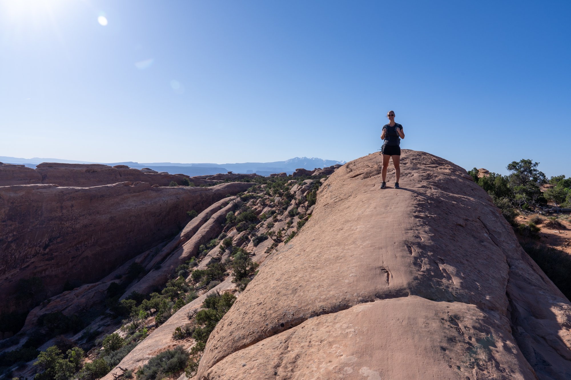 Het is 2,5 kilometer hiken naar Delicate Arch en zo’n 160 meter klimmen. Valt mee, zou je zeggen. Toch wordt deze hike geclassificeerd als pittig. Dat komt waarschijnlijk door de hitte. Je hebt onderweg namelijk nergens schaduw en de zon is meedogenloos in Arches National Park. Dat voelen we zelfs om half 5 nog.