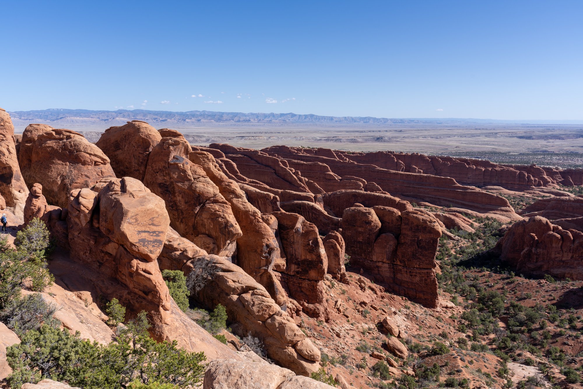We rijden direct het hele park door om een parkeerplaats te bemachtigen bij Devil’s Garden Trail. Het wandelpad dat naar Landscape Arch en Double O Arch leidt is populair en dat betekent dat je op tijd moet zijn om te kunnen parkeren. Zelfs met de grote parkeerplaats. Het is inmiddels bijna 8 uur als we aan de hike beginnen en we zijn lang niet de eerste. De drukte begint al vroeg in Arches National Park, dat is duidelijk.