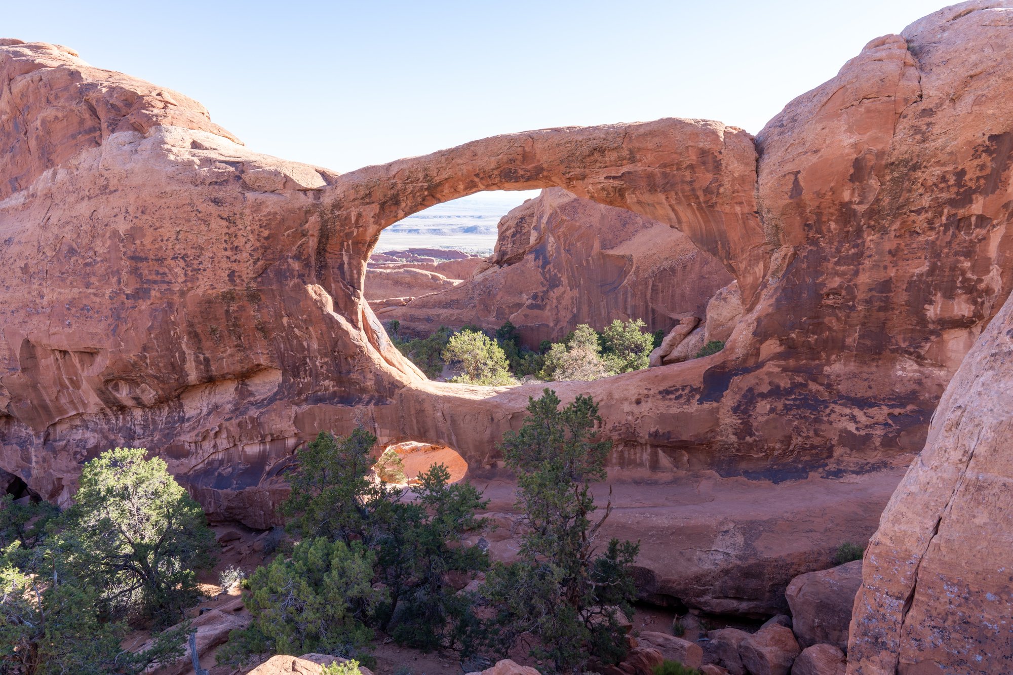 Iets minder dan een uurtje na onze start arriveren we bij Double O Arch. Hier zie je 2 ronde bogen boven elkaar. Klim door de onderste boog heen (even lastig, maar lukt wel!) voor het mooiste zicht op Double O Arch.