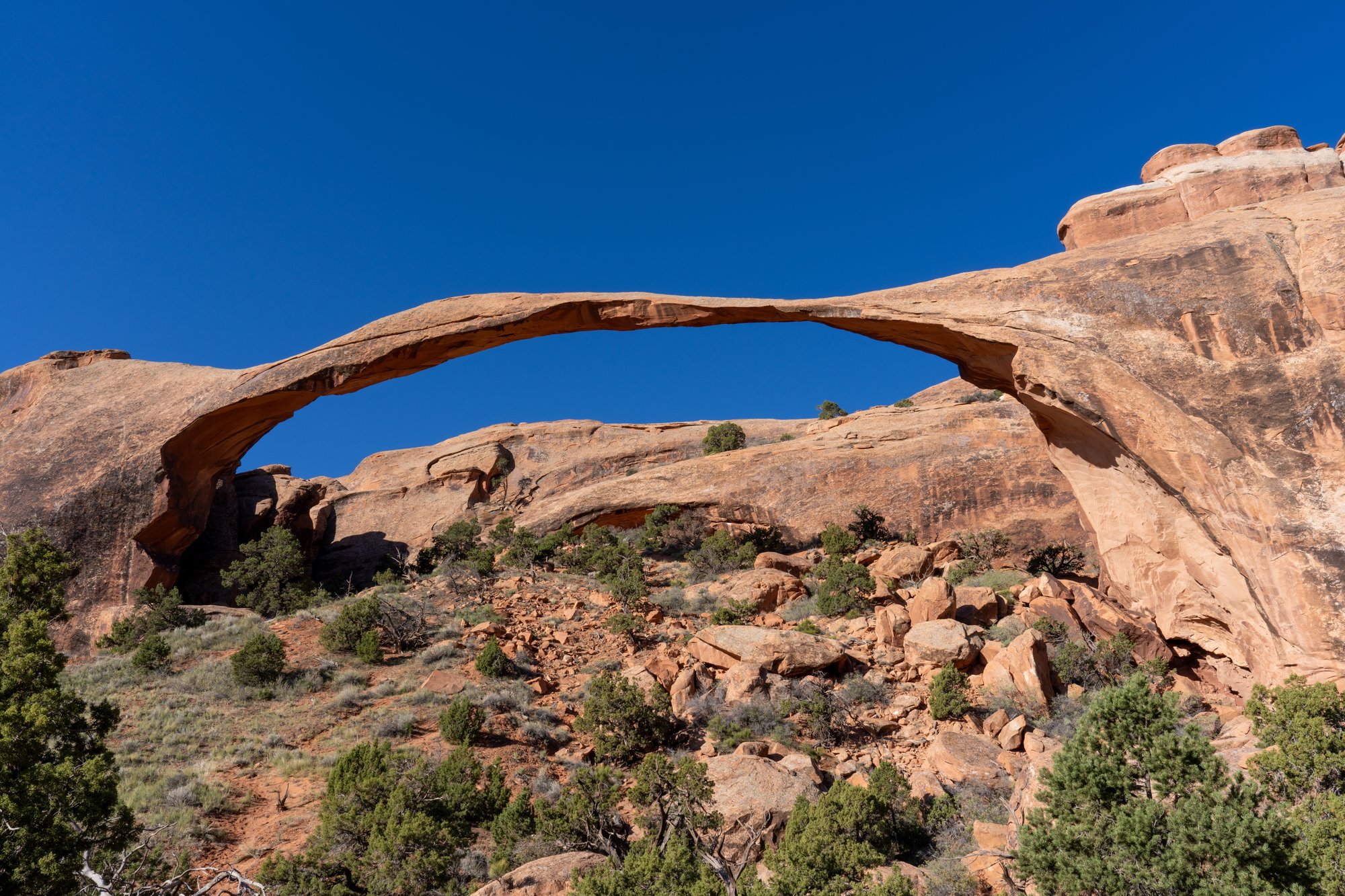 De eerste highlight op deze hike is Landscape Arch. Via een vlak gravelpad zijn we in 20 minuutjes bij de fragiel uitziende boog. Landscape Arch is in 1991 deels ingestort en er resteert nu enkel nog een heel smal boogje. Het ziet eruit alsof het ieder moment kan doorbreken, maar Landscape Arch houdt zich in deze staat al meer dan 30 jaar staande. Wie weet blijft het nog wel honderden jaren zo. Of breekt hij morgen af. Wie zal het zeggen!
