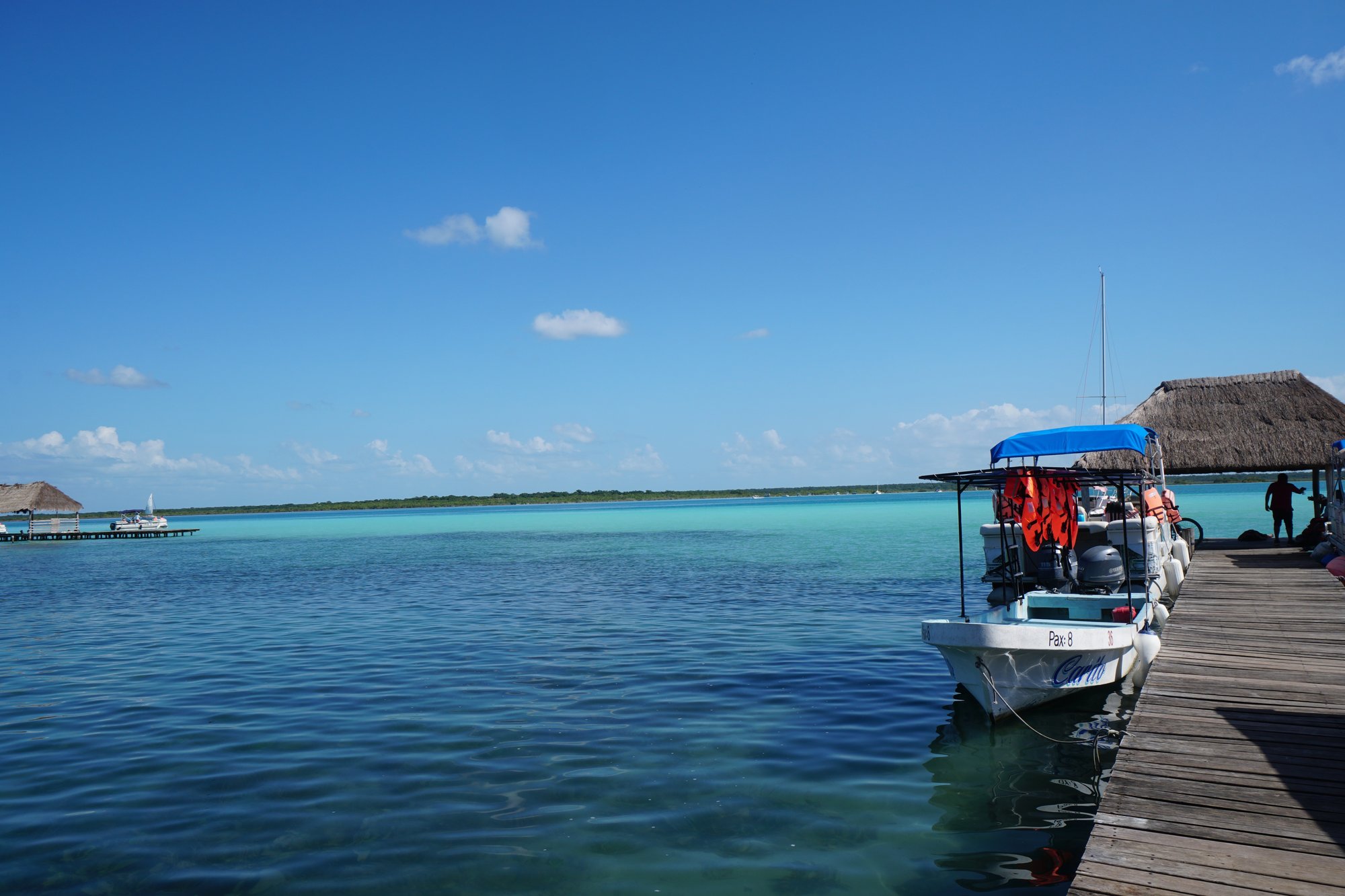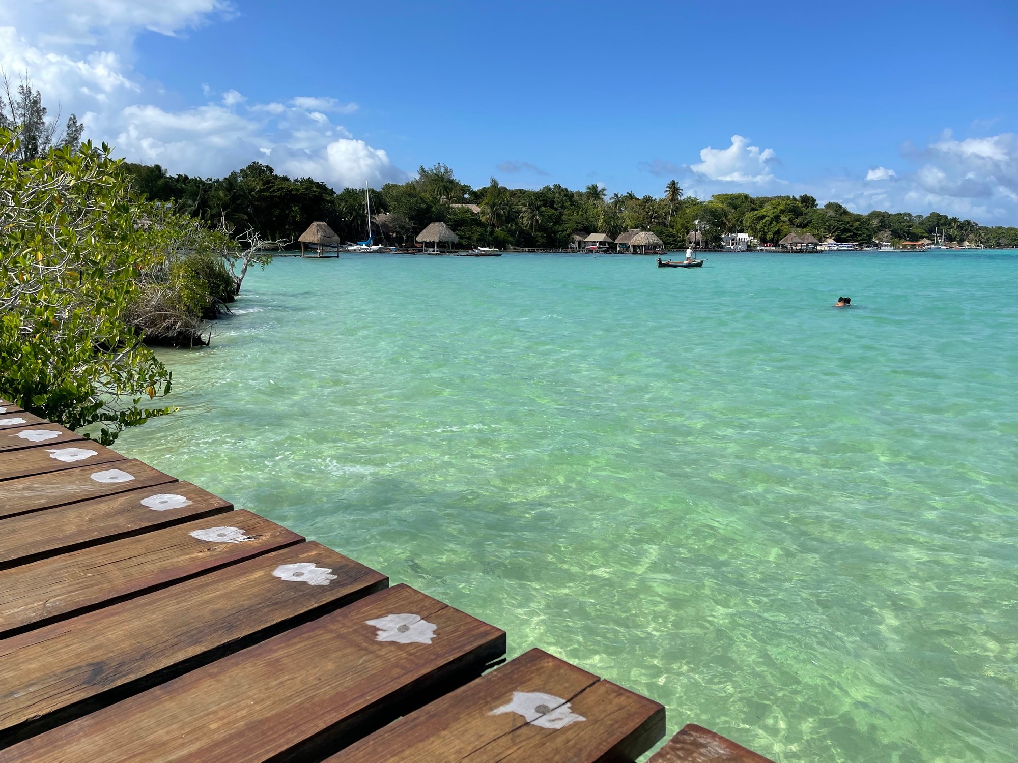 Het meer van Bacalar wordt weleens vergeleken met Bora Bora, vooral vanwege de mooie kleuren blauw in het water. De bijnaam van het meer is Laguna de los 7 Colores, wat het meer van 7 kleuren betekent. Om al die kleuren in het water goed te kunnen zien, is een boottocht over het meer verplichte kost. Vervelend ;-)