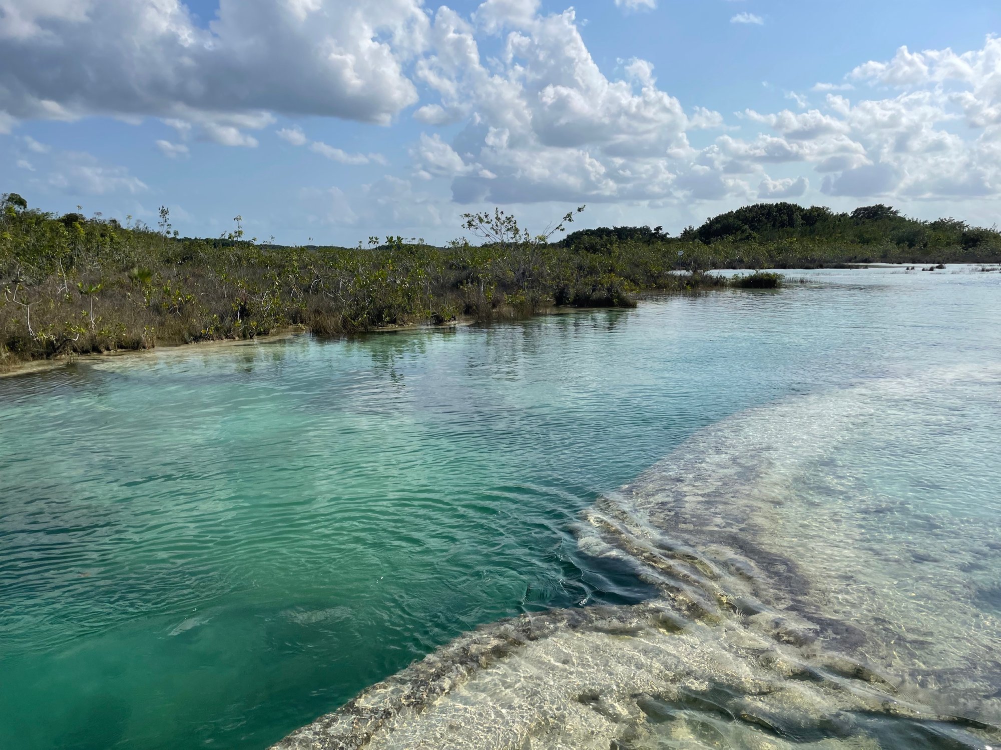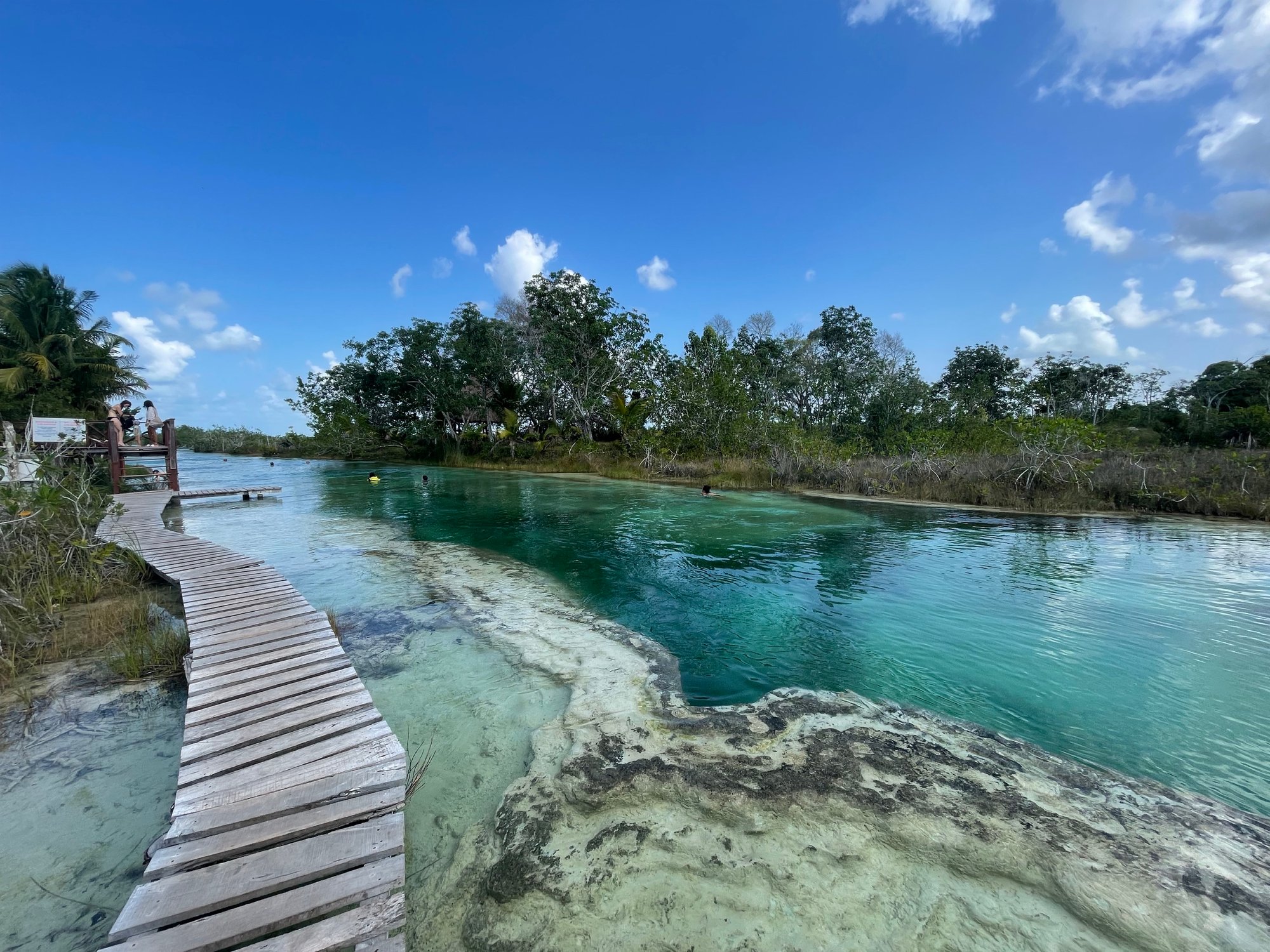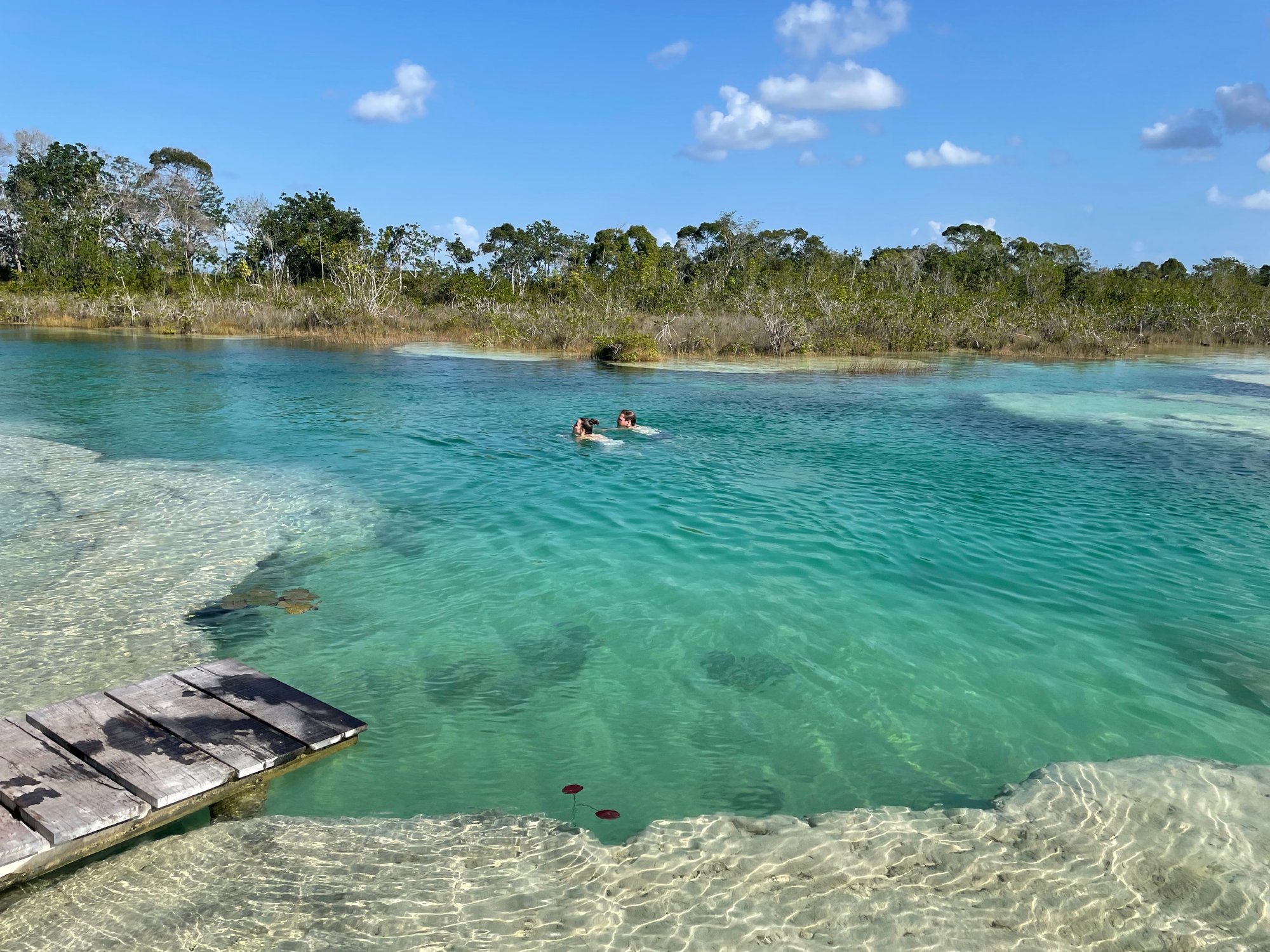 Daarna zeilen we naar het Canal de los Piratas. Dit kanaal vormt de enige verbinding tussen het meer van Bacalar en de zee. Vroeger werd dit kanaal gebruikt door piraten om vanuit Belize toegang te krijgen tot Bacalar en de boel op stelten te zetten. Nu is het vooral een hele mooie plek, omdat het water hier erg ondiep is. Dat zorgt ervoor dat het water prachtig blauw is én je kunt er heerlijk zwemmen.