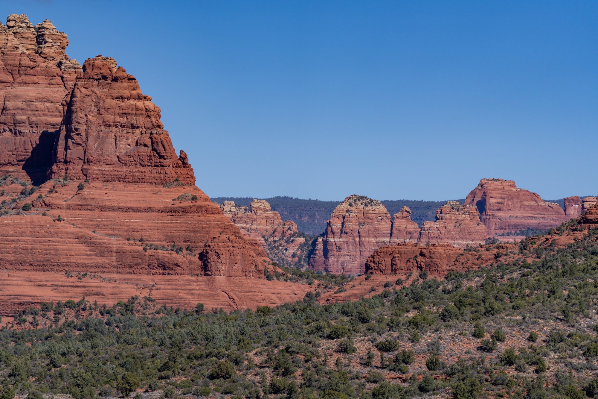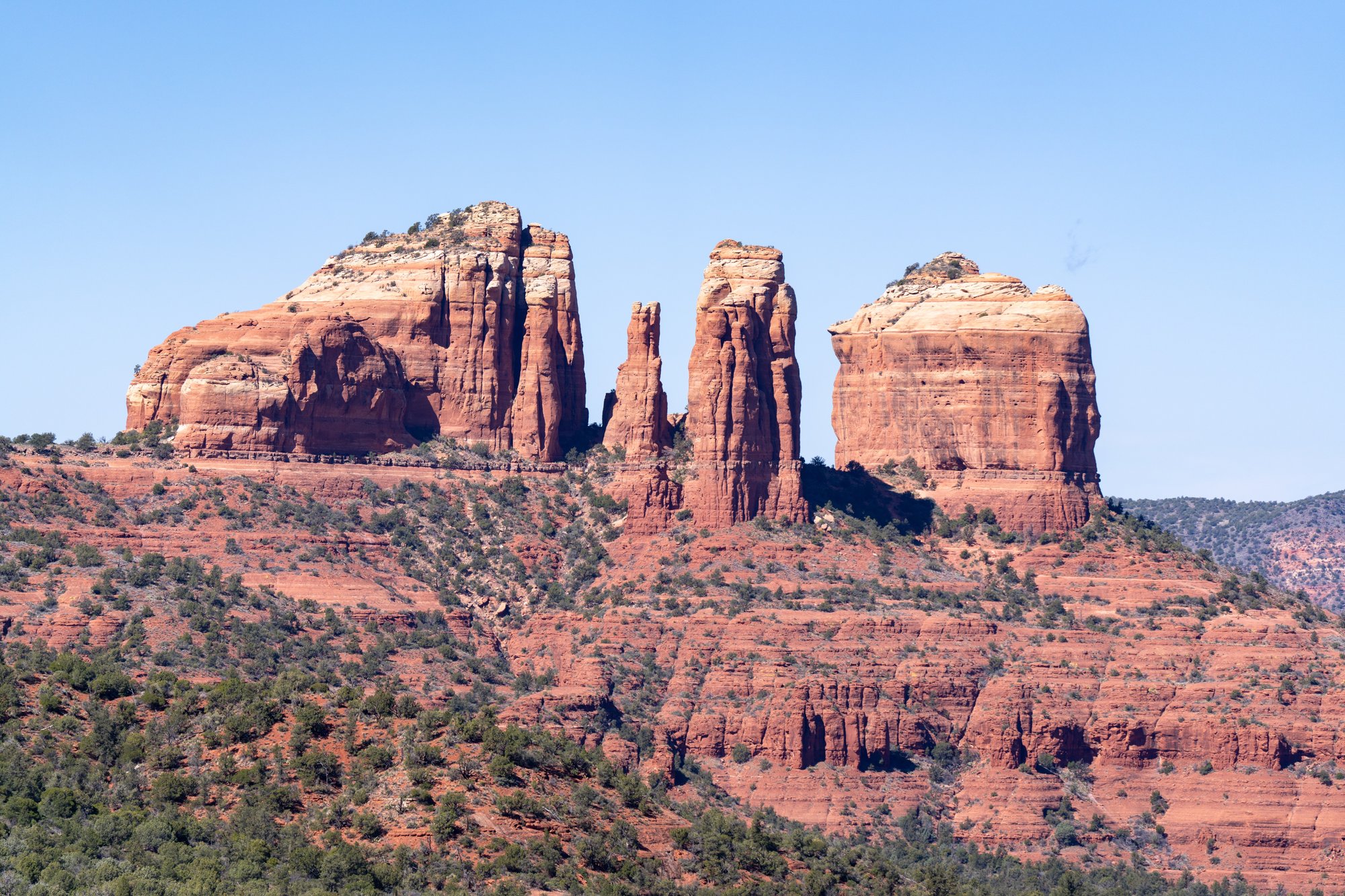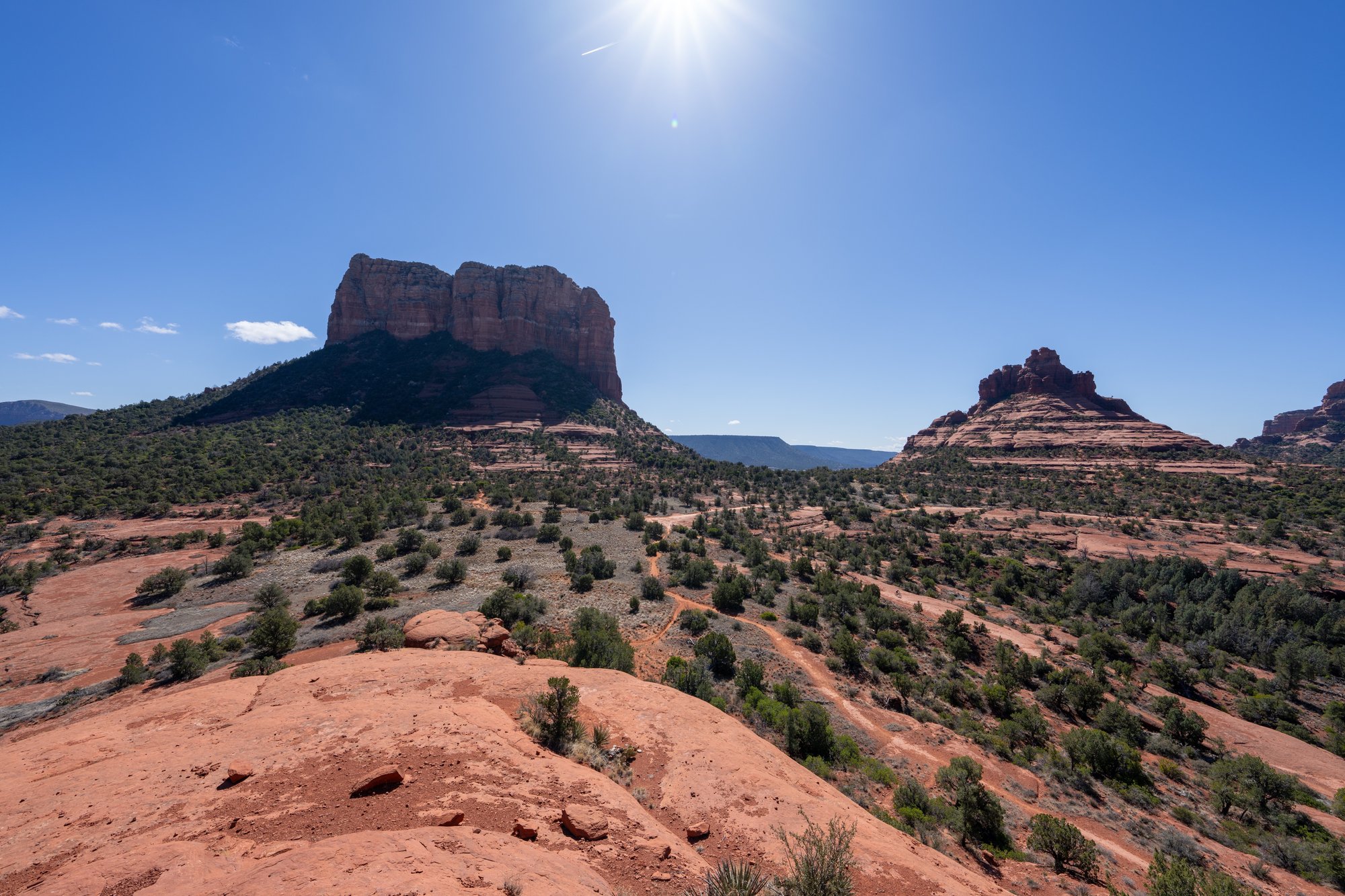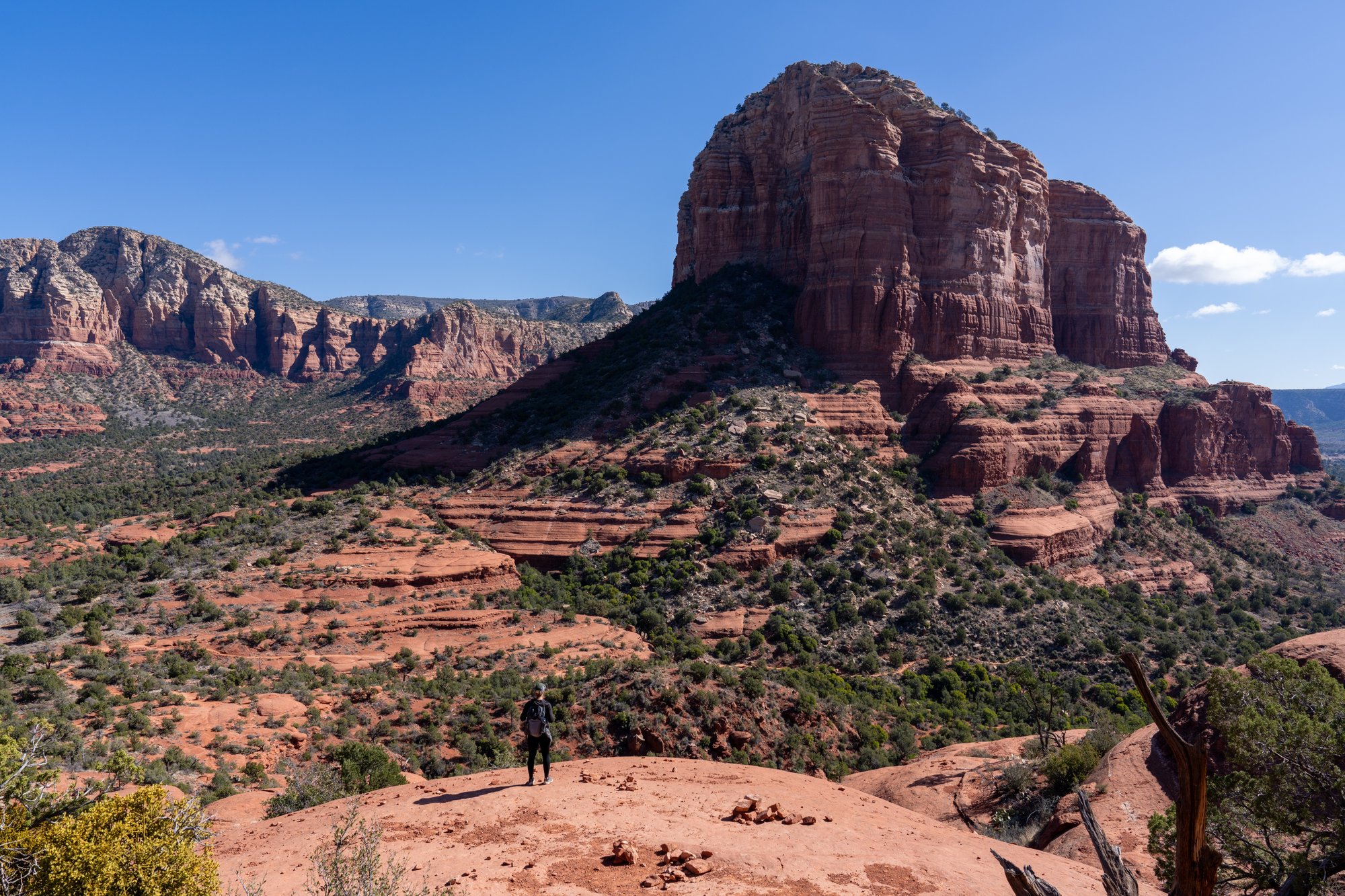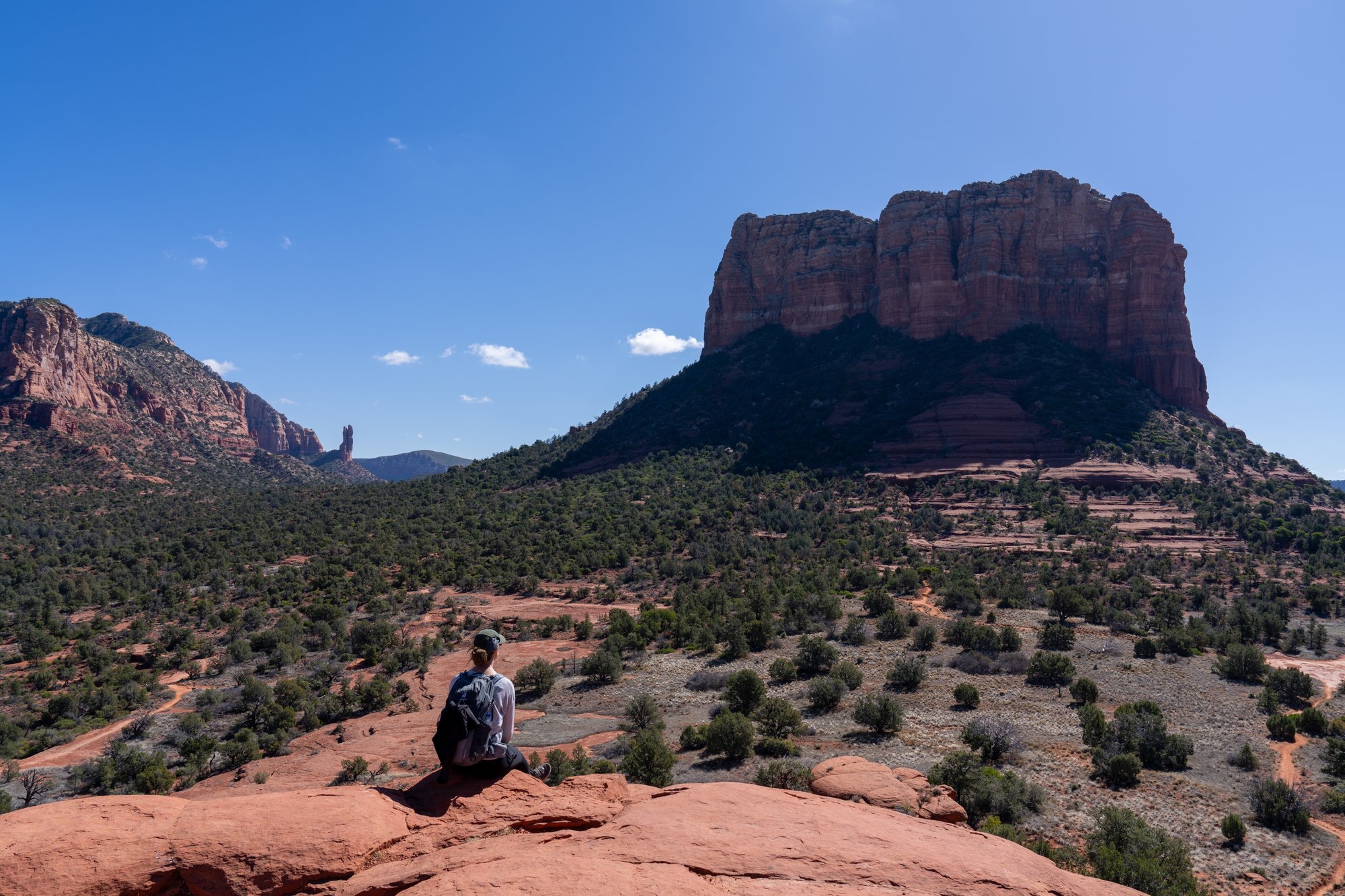 Vanaf Bell Rock hebben we nog beter uitzicht op Courthouse Butte. Ook zien we Cathedral Rock in de verte en we zien nog een lagere rotsformatie iets verderop. Vanaf daar kun je mooi naar Bell Rock en Courthouse Butte kijken. Laten we daar ook naartoe gaan! Nadat we maps.me op onze telefoon hebben gecheckt, blijkt deze kleine rots Baby Bell Rock te heten. Toepasselijk!