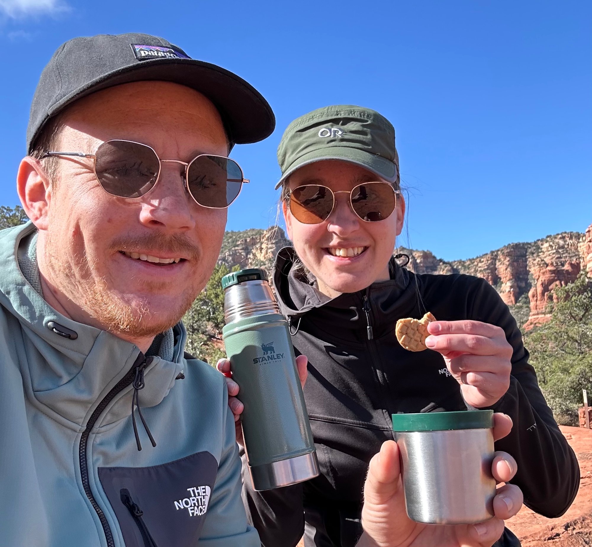 Vanaf daar wandelen we naar het begin van de Bell Rock Loop. Dit pad maakt een rondje om de Bell Rock en zo kun je deze rotsformatie dus van alle kanten bekijken. Wij kiezen ervoor om met de klok mee te lopen. Het pad is makkelijk en slechts geleidelijk stijgend, maar ik heb er moeite mee deze ochtend. Misschien is mijn lijf nog moe van gisteren of moet ik gewoon nog wakker worden. Ik weet niet wat het is, maar het kost allemaal nogal veel energie. We besluiten daarom al snel een mooie plek op te zoeken en halen de thermoskan uit onze tas. Eerst koffie!