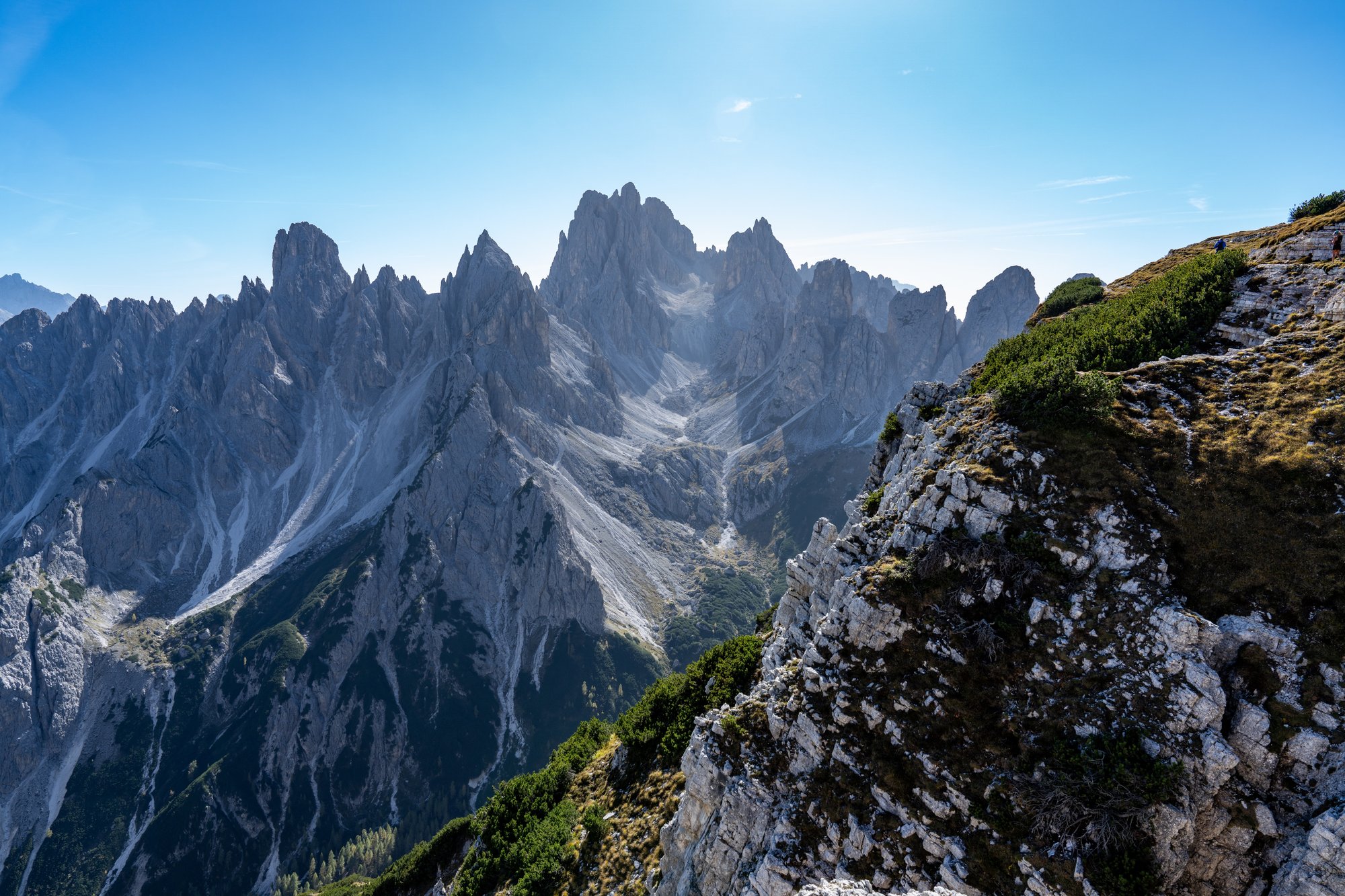Na een half uur lopen staan we op de plek die we al zo vaak op social media voorbij zagen komen. En we moeten zeggen: het is inderdaad een prachtige locatie. Ons gezichtsveld wordt gevuld met grijze, grillige bergpieken. De toppen zijn honderden meters hoger dan wij zijn en maken indruk. En het is bijna niet te geloven, maar op de één of andere manier heeft de natuur hier de perfecte fotospot gecreëerd. Je kunt namelijk over een smal stukje gras naar voren lopen en zo het allerbeste uitzicht op Cadini di Misurina ervaren.
