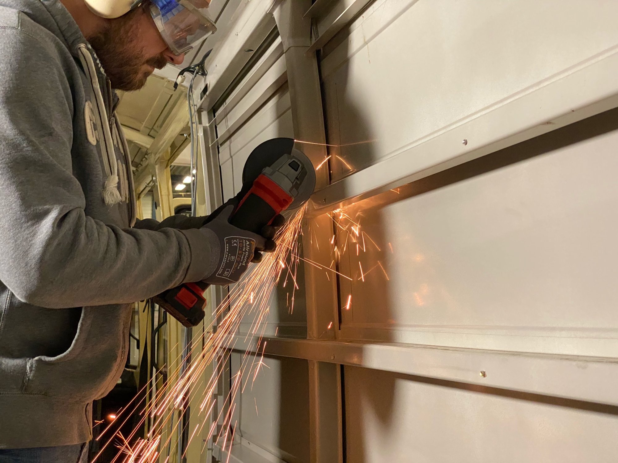 Toen de bus eenmaal in Etten-Leur stond, kon het echte werk beginnen. We hadden van tevoren al wat dingen eruit gehaald, zoals de zijwandjes en de vloer. De eerste stap is nu het inbouwen van zijramen. Gelijk één van de spannendste klusjes van het hele ombouwen denk ik, want je moet dan een gat in je plaatwerk slijpen of zagen. Als je daar een foutje maakt, is het lastig (of duur) om te herstellen. Gelukkig heeft onze handige zwager Mark stalen zenuwen én ervaring met een slijptol. Hij heeft 2 perfecte gaten geslepen. De ramen pasten er precies in. Super!