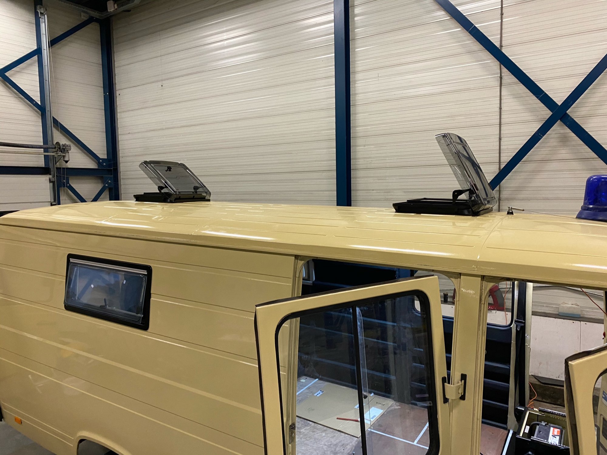 En toen we eindelijk klaar waren met de zijramen, bedachten we dat we toch eigenlijk ook wel dakluiken wilden. Er zaten twee originele, stalen dakluiken in de bus, maar daar komt geen licht doorheen en ze zijn ook niet heel mooi. Dat betekende dat Mark weer aan de gang kon met de slijptol! Wij bestelden dakramen en spoten deze zwart, zodat ze beter bij de kleur van Bruno passen. Na behoorlijk wat gevloek en gedoe zaten ook de twee dakluiken erin. Yes! Dat ziet er gelijk een stuk beter uit.
