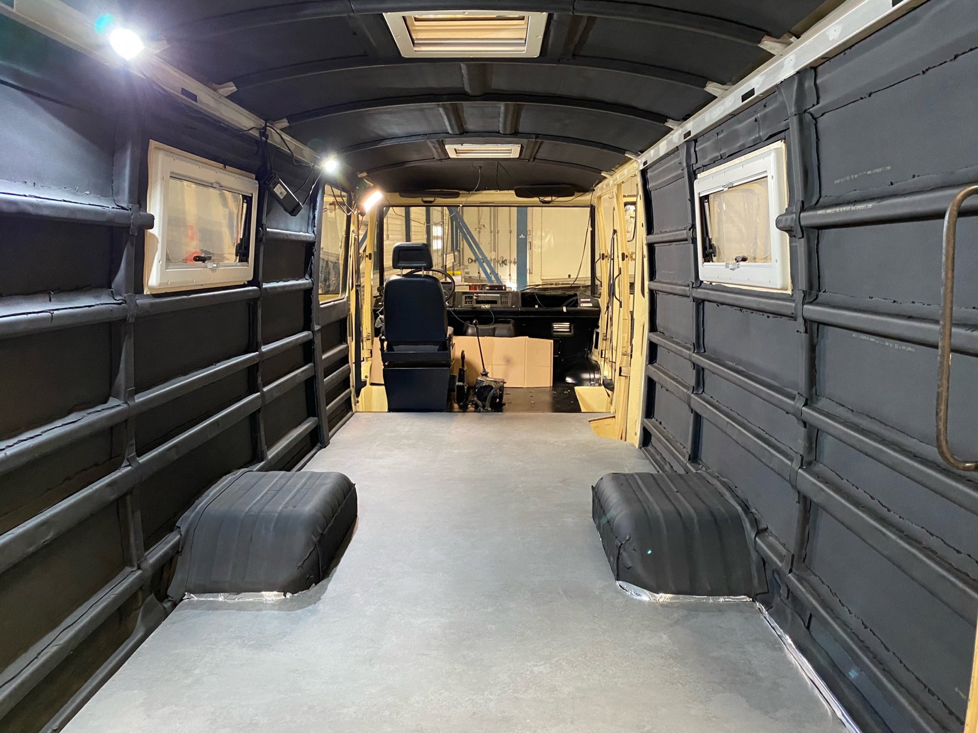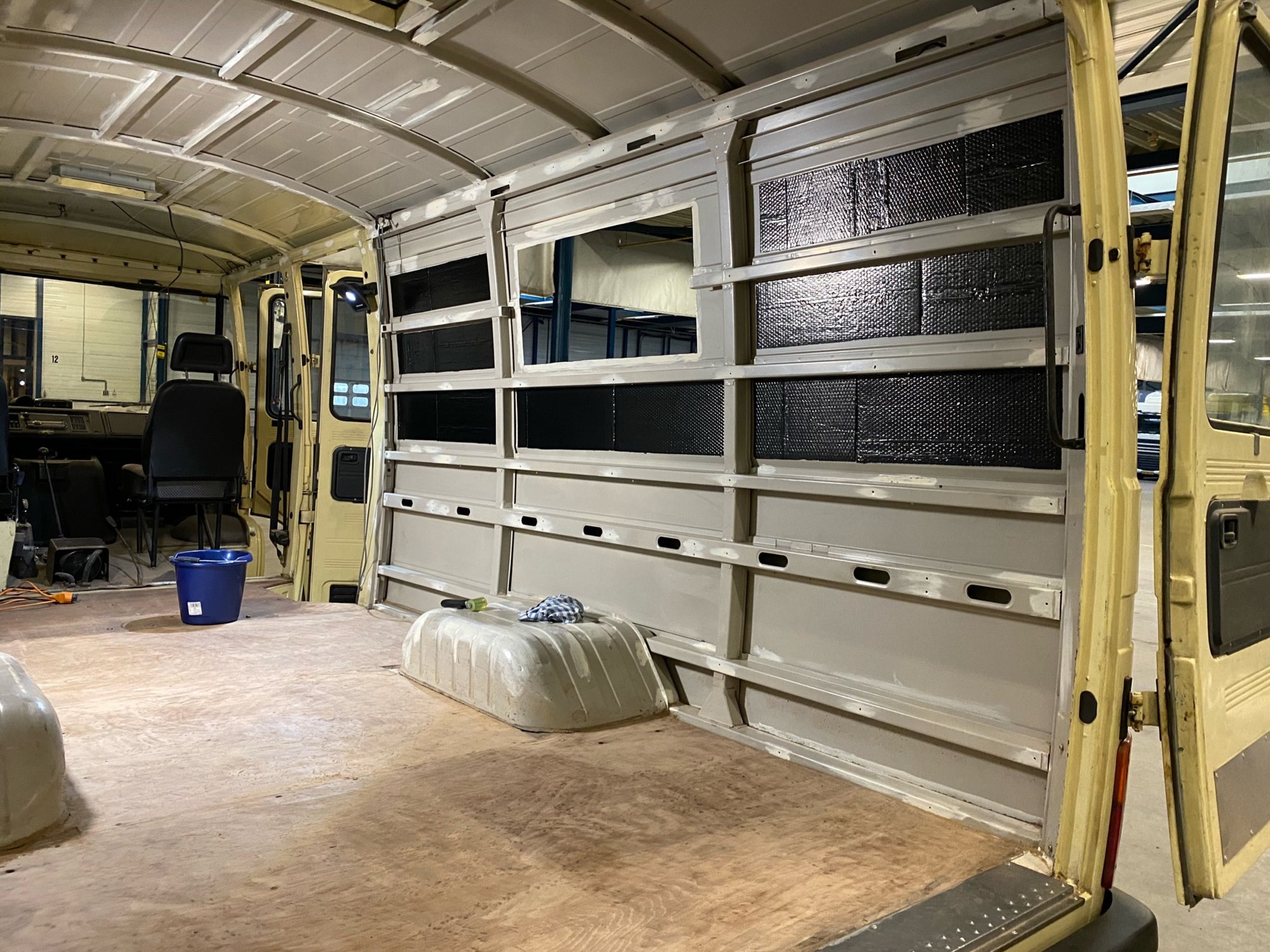 De volgende stap was isolatie aanbrengen op al het plaatwerk en alle spanten van de bus. Ook geen ingewikkelde klus, maar wel eentje waar heel wat uurtjes in gaan zitten. Afmeten, op juiste formaat snijden, plakken. En dat riedeltje tientallen keren.