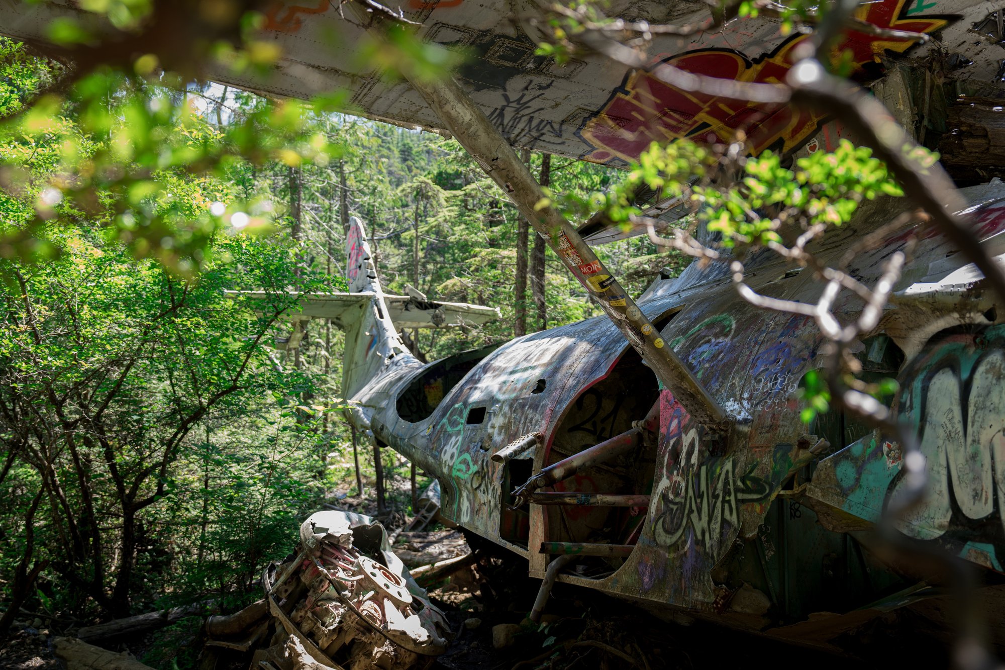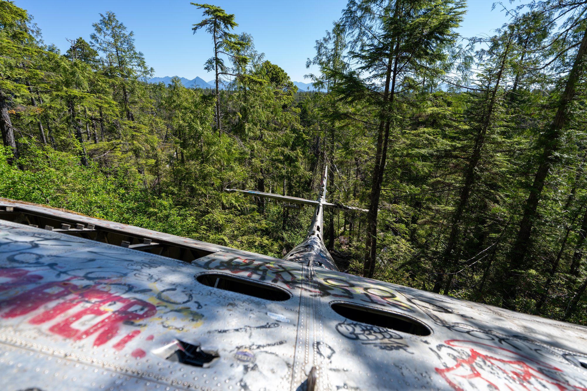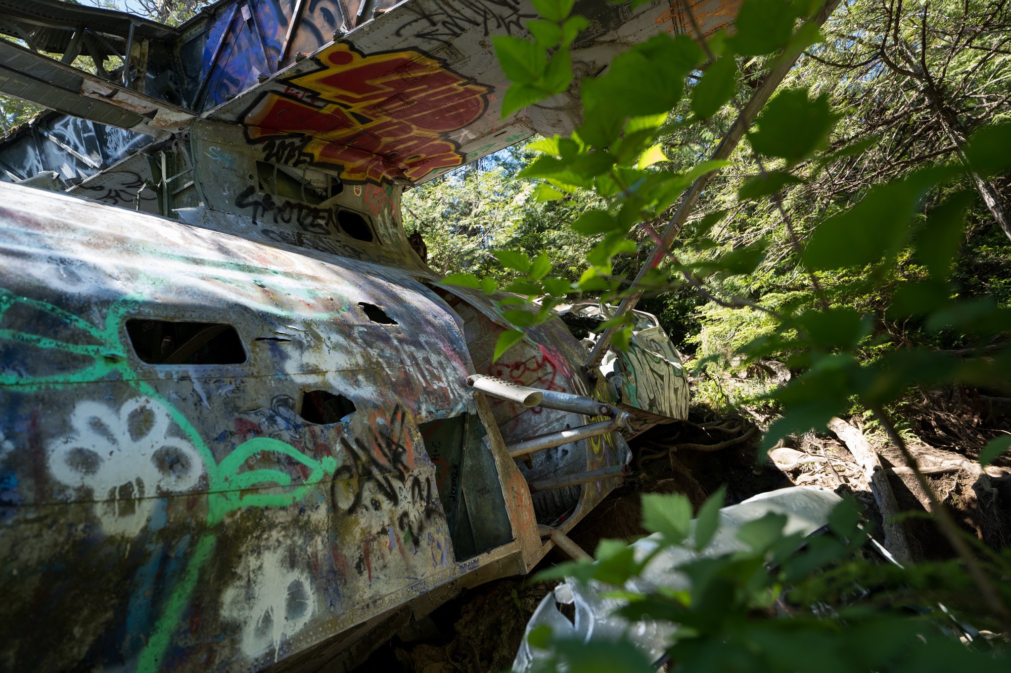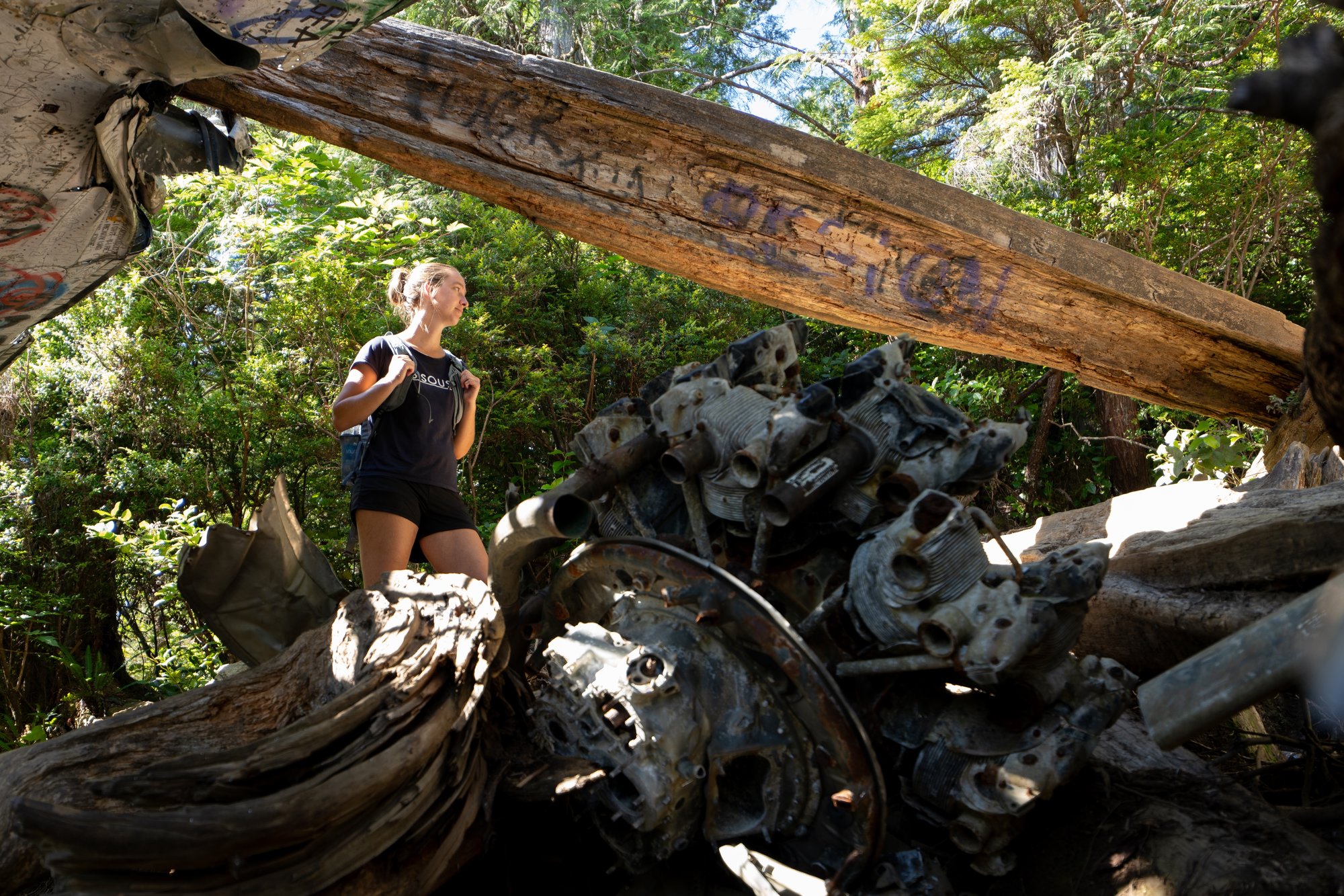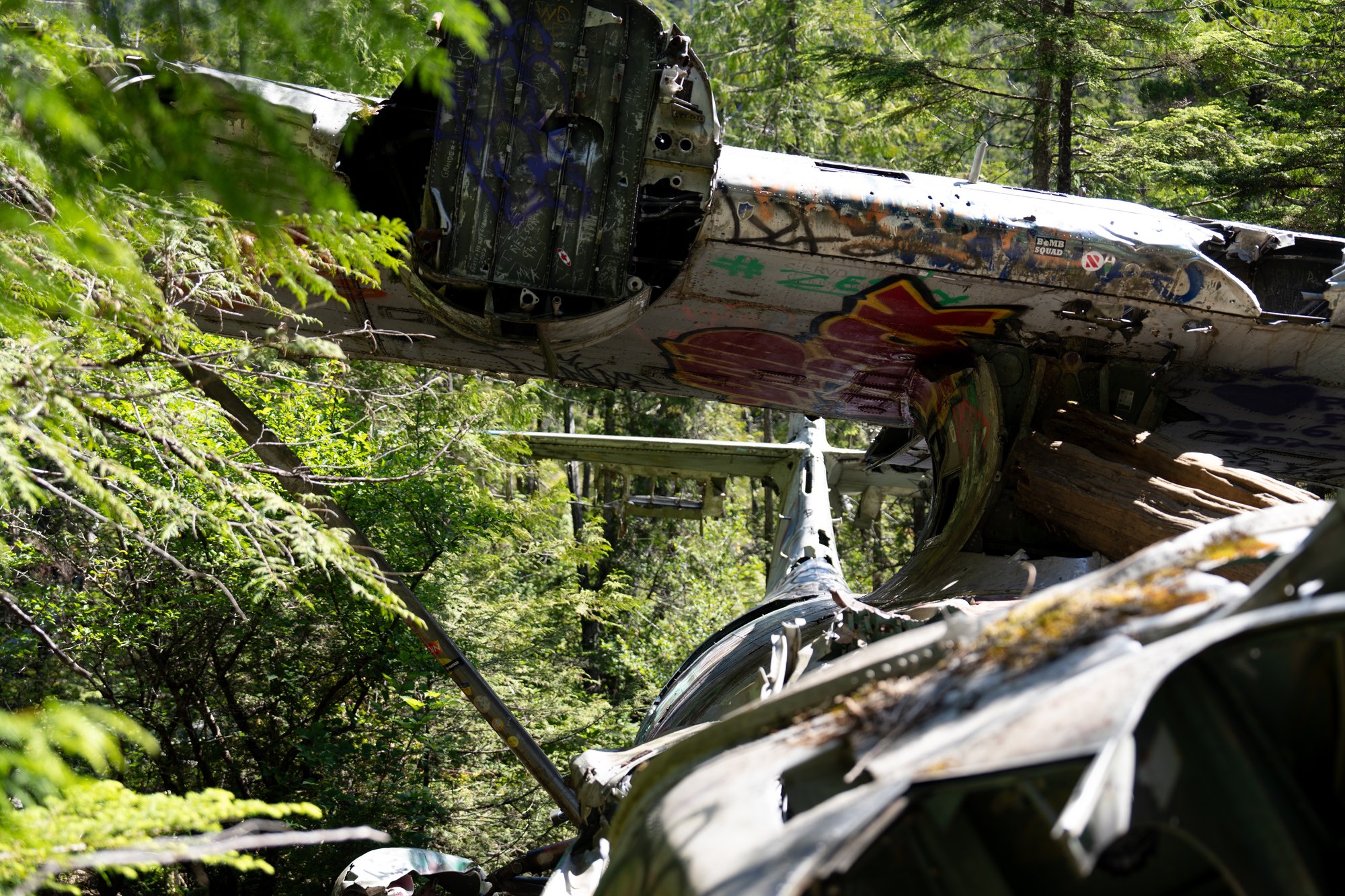Op zondagochtend wandelen we in de stilte door het dichte regenwoud naar een mystieke plek in het Pacific Rim National Park. De takjes ritselen onder onze voeten, de vogels om ons heen zingen vrolijke liedjes en af en toe kraken de houten planken van het vlonderpad. Na een korte wandeling komen we bij onze bestemming: de neergestorte bommenwerper (vliegtuigje) uit de Tweede Wereldoorlog. Verstopt tussen alle bomen en bladeren. Bespoten met graffiti. Rondzwervende onderdelen in de omgeving. We zijn hier helemaal alleen. Een geweldige ervaring!