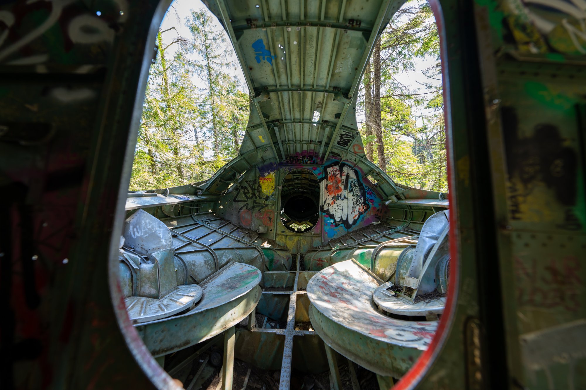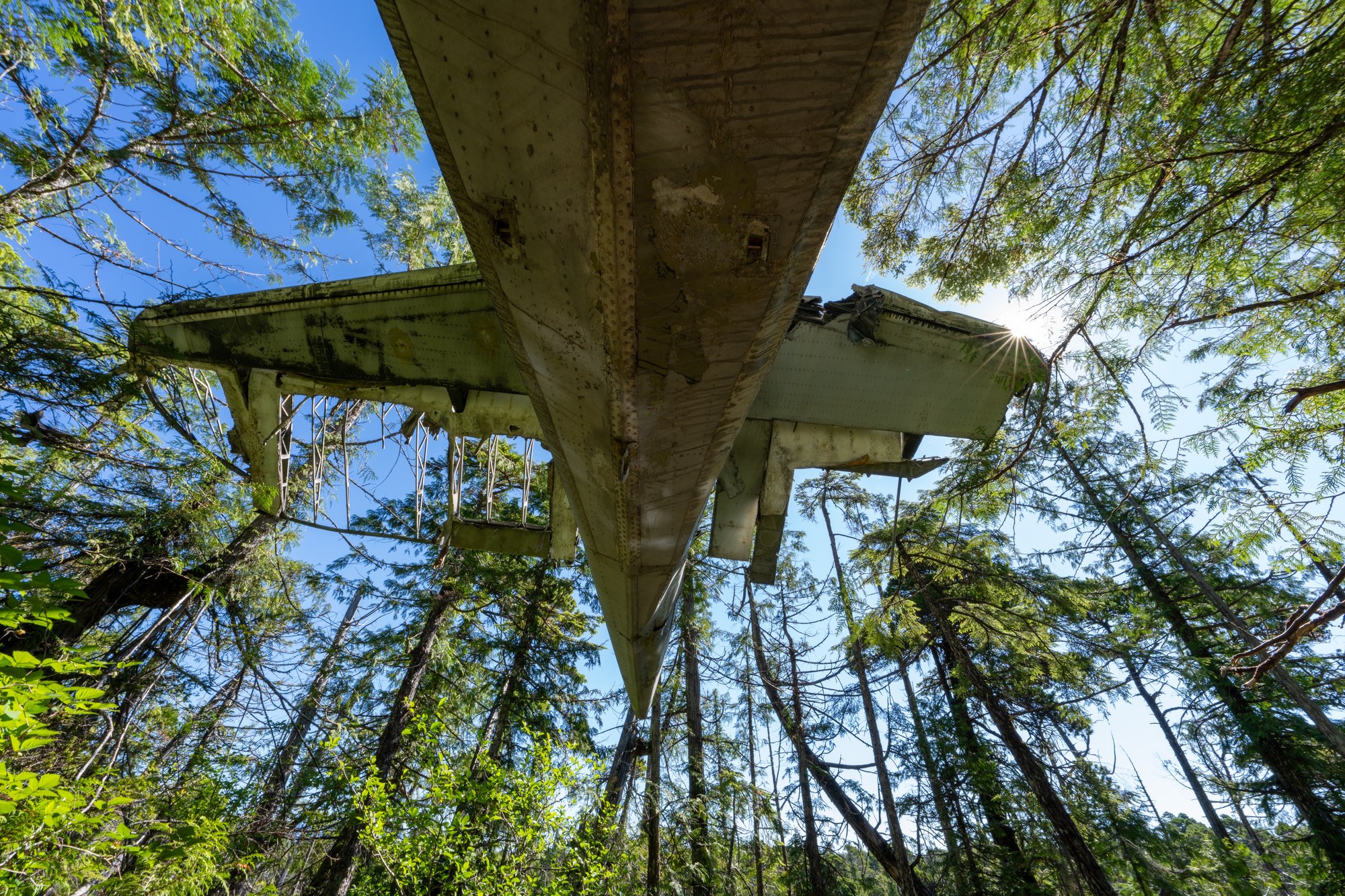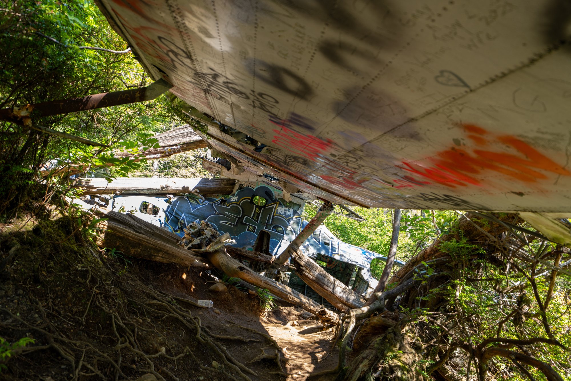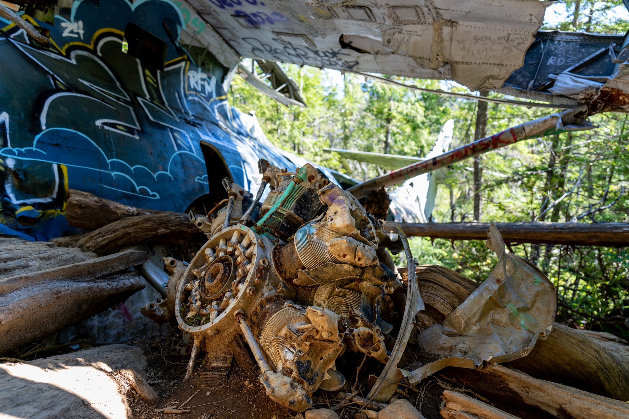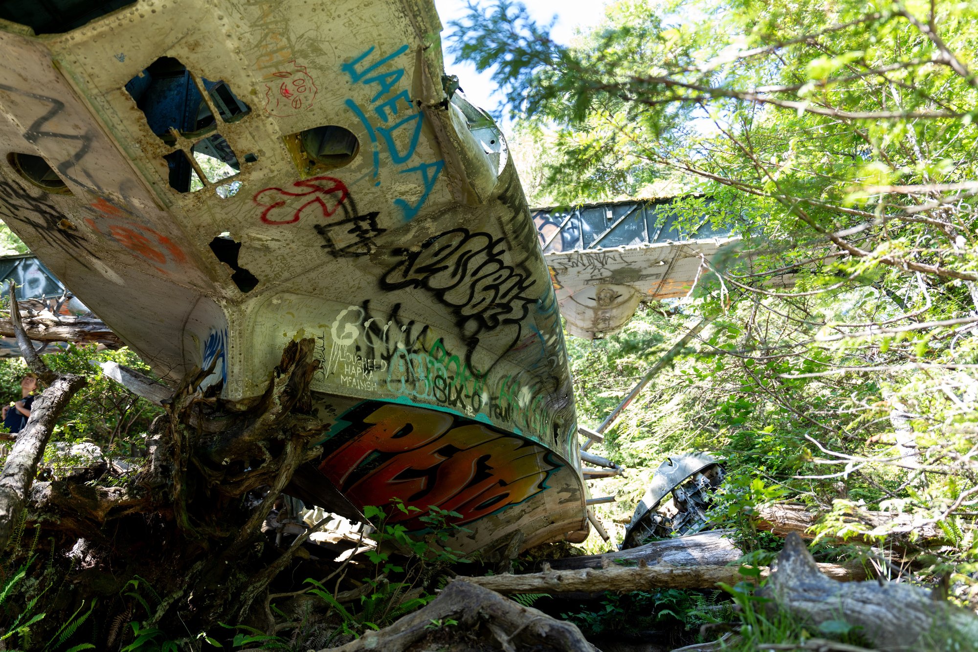 Op zondagochtend wandelen we in de stilte door het dichte regenwoud naar een mystieke plek in het Pacific Rim National Park. De takjes ritselen onder onze voeten, de vogels om ons heen zingen vrolijke liedjes en af en toe kraken de houten planken van het vlonderpad. Na een korte wandeling komen we bij onze bestemming: de neergestorte bommenwerper (vliegtuigje) uit de Tweede Wereldoorlog. Verstopt tussen alle bomen en bladeren. Bespoten met graffiti. Rondzwervende onderdelen in de omgeving. We zijn hier helemaal alleen. Een geweldige ervaring!