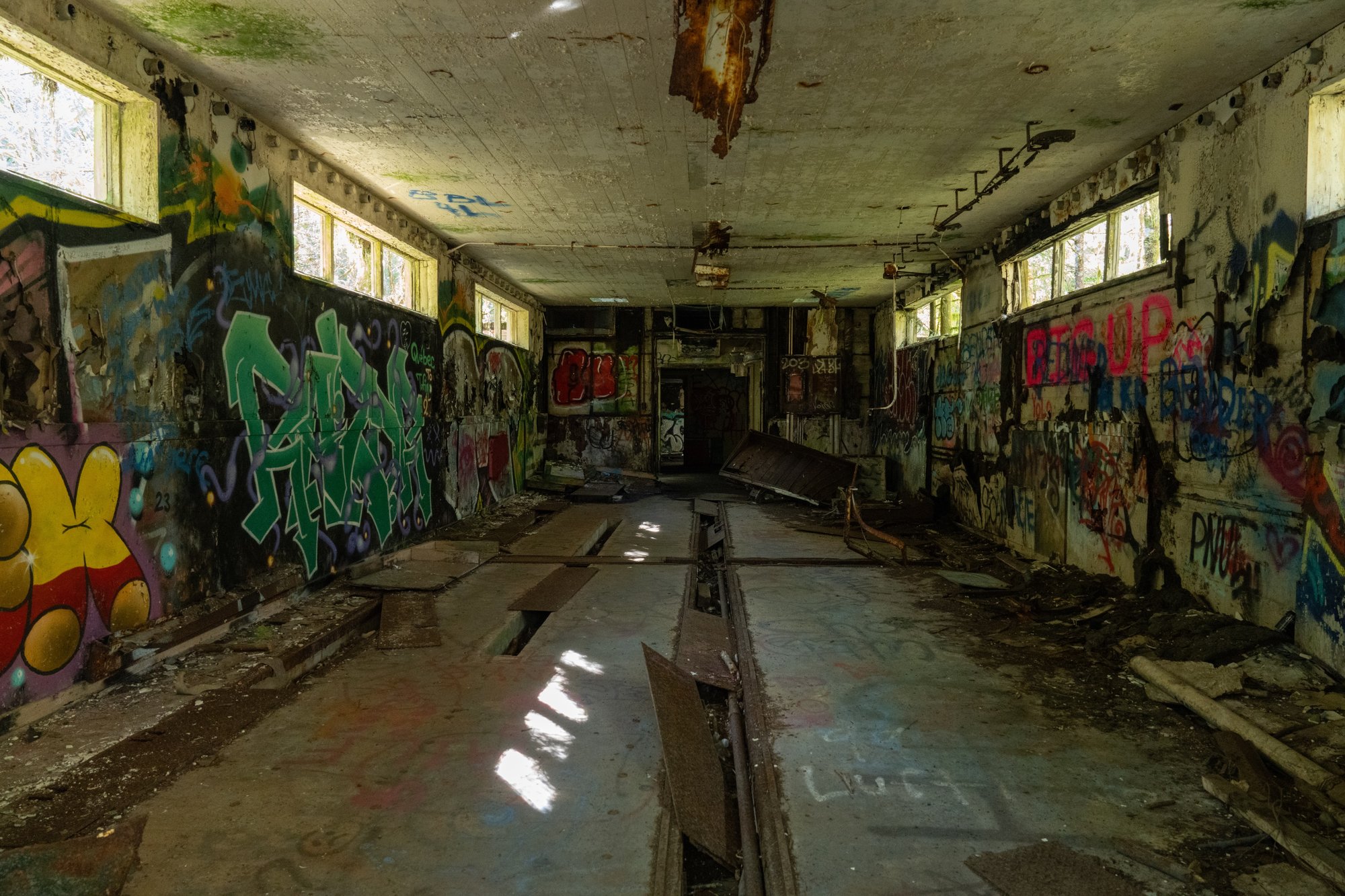 Het is ongeveer 2,5 kilometer lopen tot het vliegtuigwrak. Aan de hoeveelheid spinnenwebben waar we doorheen lopen leiden we af dat wij vandaag de eerste op het pad zijn. De hike begint met een makkelijk bospad, totdat we bij een verlaten gebouw komen. Volgens maps.me is dit het voormalige radiogebouw. Nu is het een vervallen stuk beton met overal graffiti en rotzooi. Het is zo’n plek waarvan je een beetje spanning in je buik voelt. Misschien komt dat ook omdat we nog helemaal niemand gezien hebben op de trail en we weer even moeten wennen aan het hiken in gebieden met beren, wolven en poema’s. Je weet nooit wat je tegenkomt!