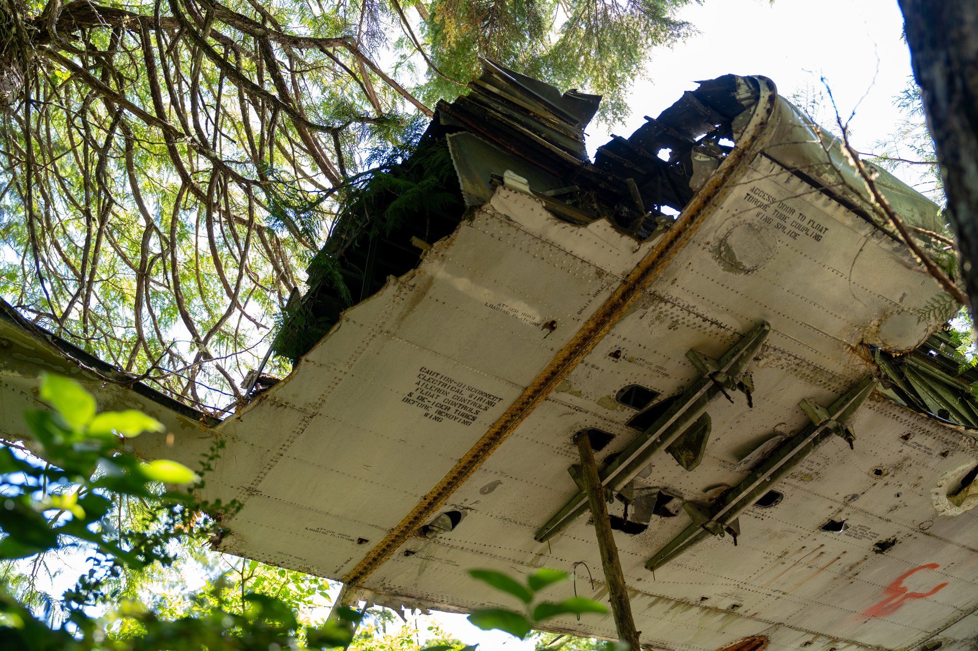 Het neergestorte vliegtuig ligt goed verstopt tussen alle begroeiing. Hij is deels uit elkaar gevallen. De constructie piept en kraakt en her en der druppelt het van de vleugels op de grond. Verder is het stil. Rondom het vliegtuig ligt het bezaaid met onderdelen die tijdens de crash of daarna zijn losgekomen. Een mystieke samenkomst van omstandigheden!