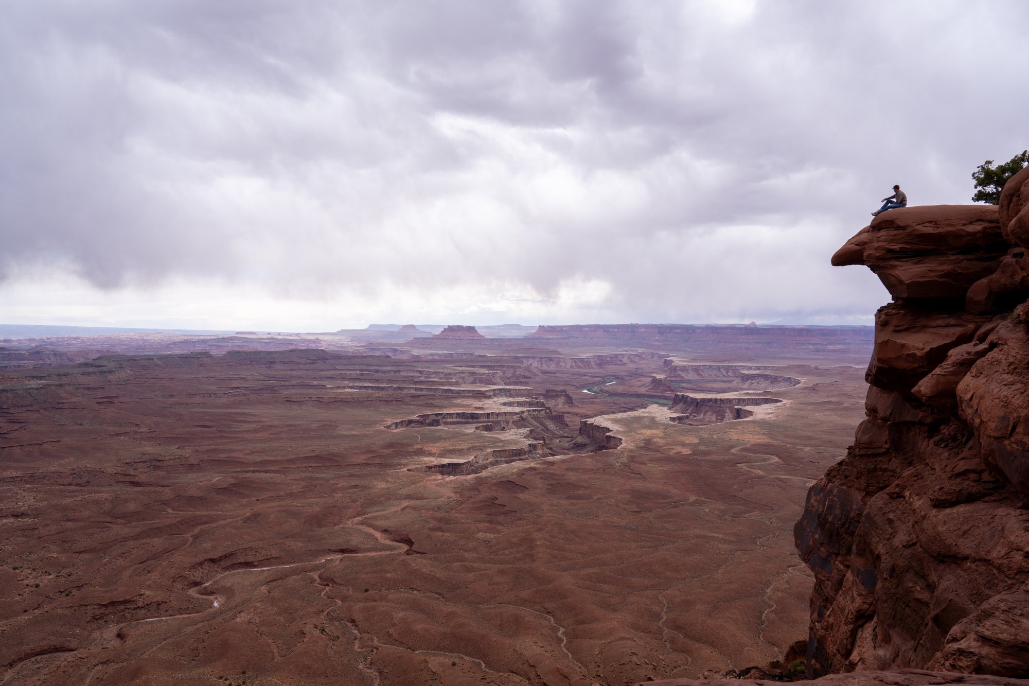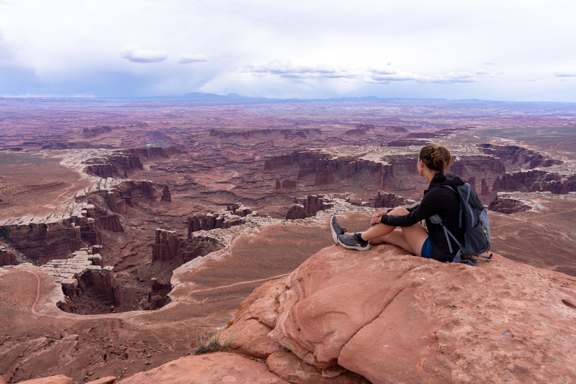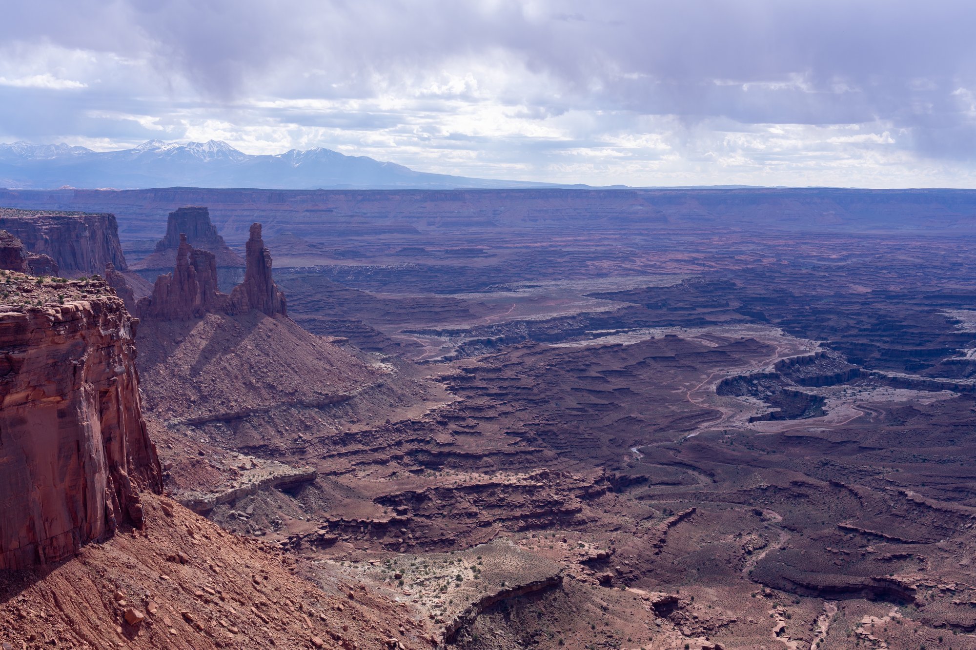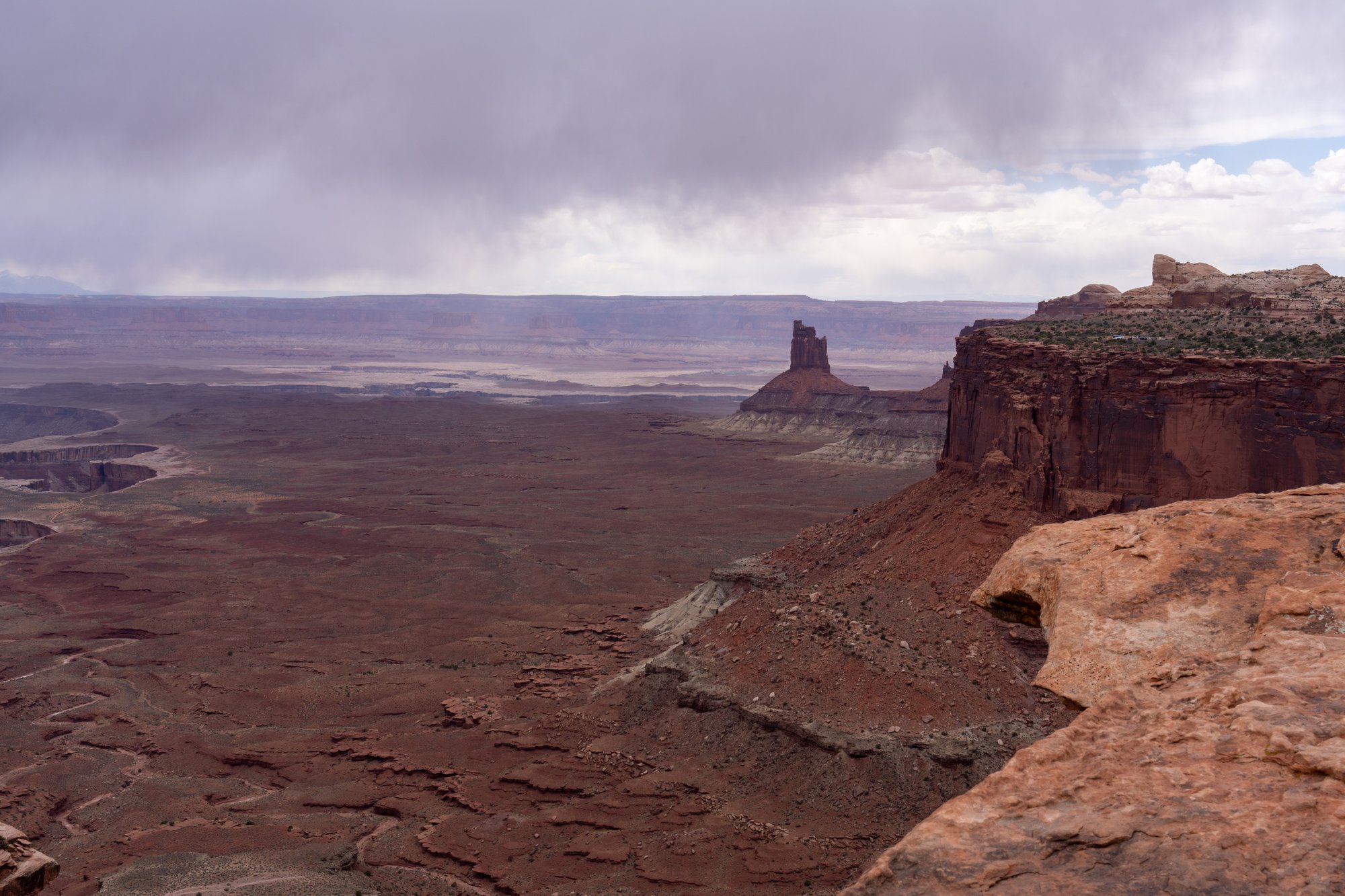Dit uitzichtpunt staat niet heel duidelijk aangegeven met bordjes en er is slechts beperkte parkeerruimte langs de weg, maar het is wel leuk om hier even een korte stop te maken. Het is inmiddels licht gaan regenen en de lucht is betrokken. Maar Canyonlands kan het prima hebben, een beetje drama in het landschap!