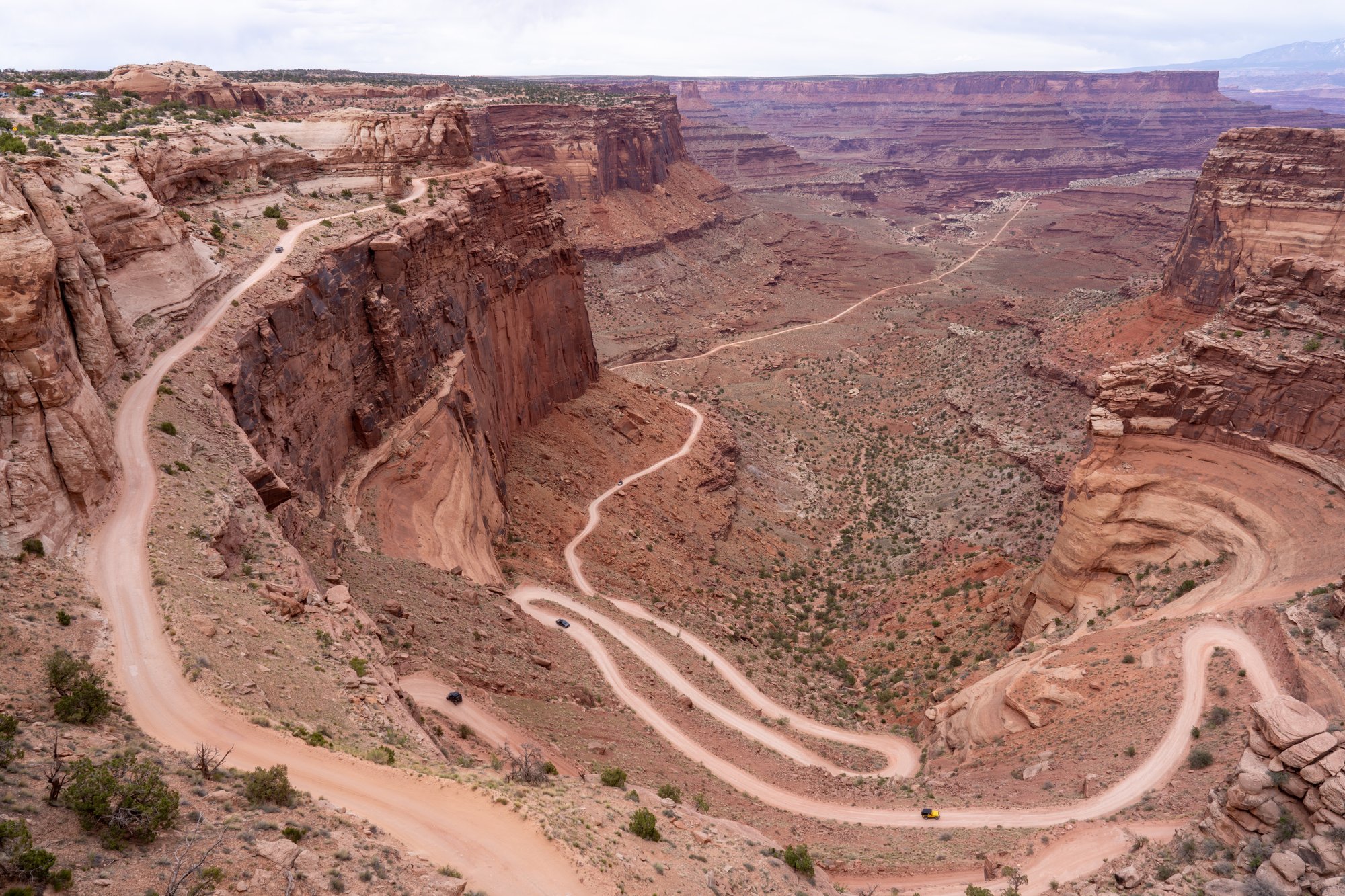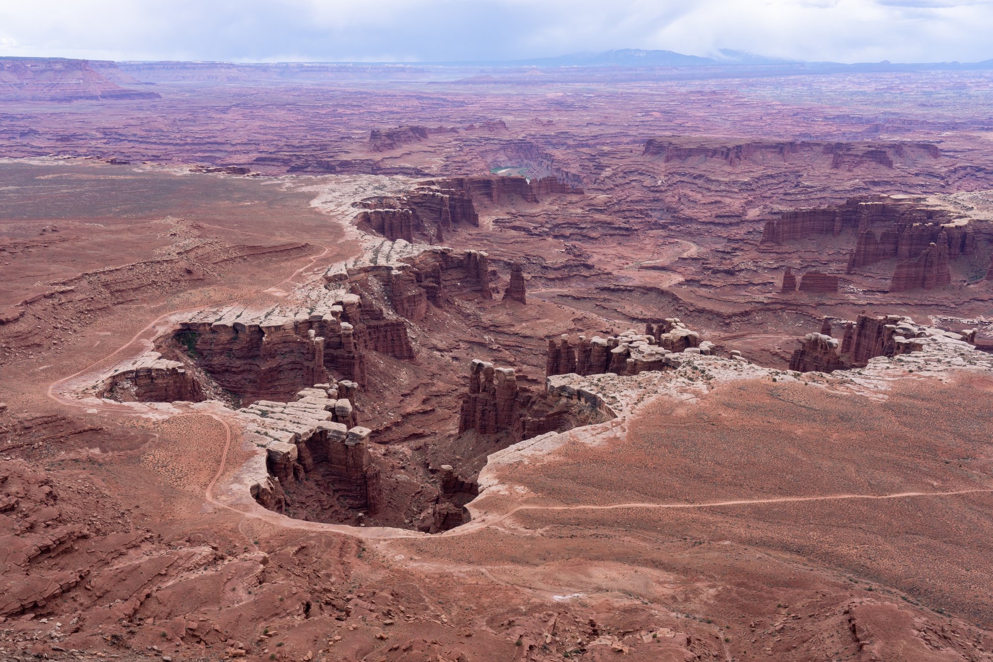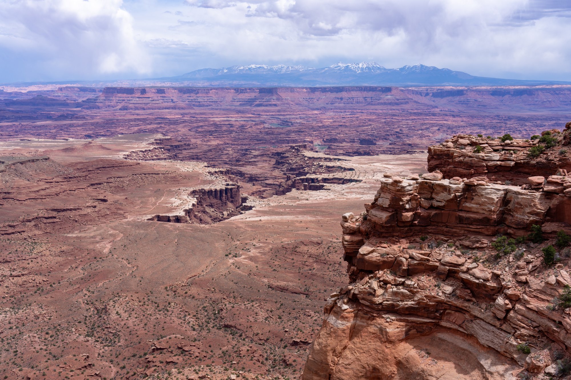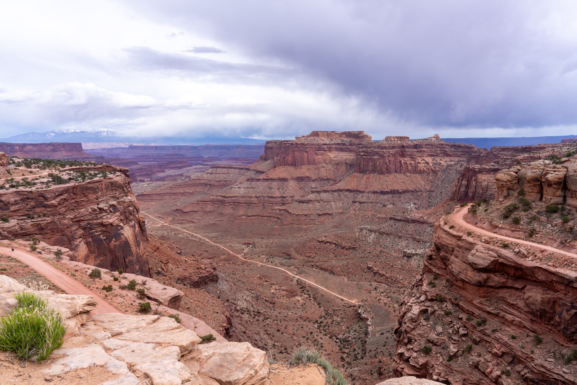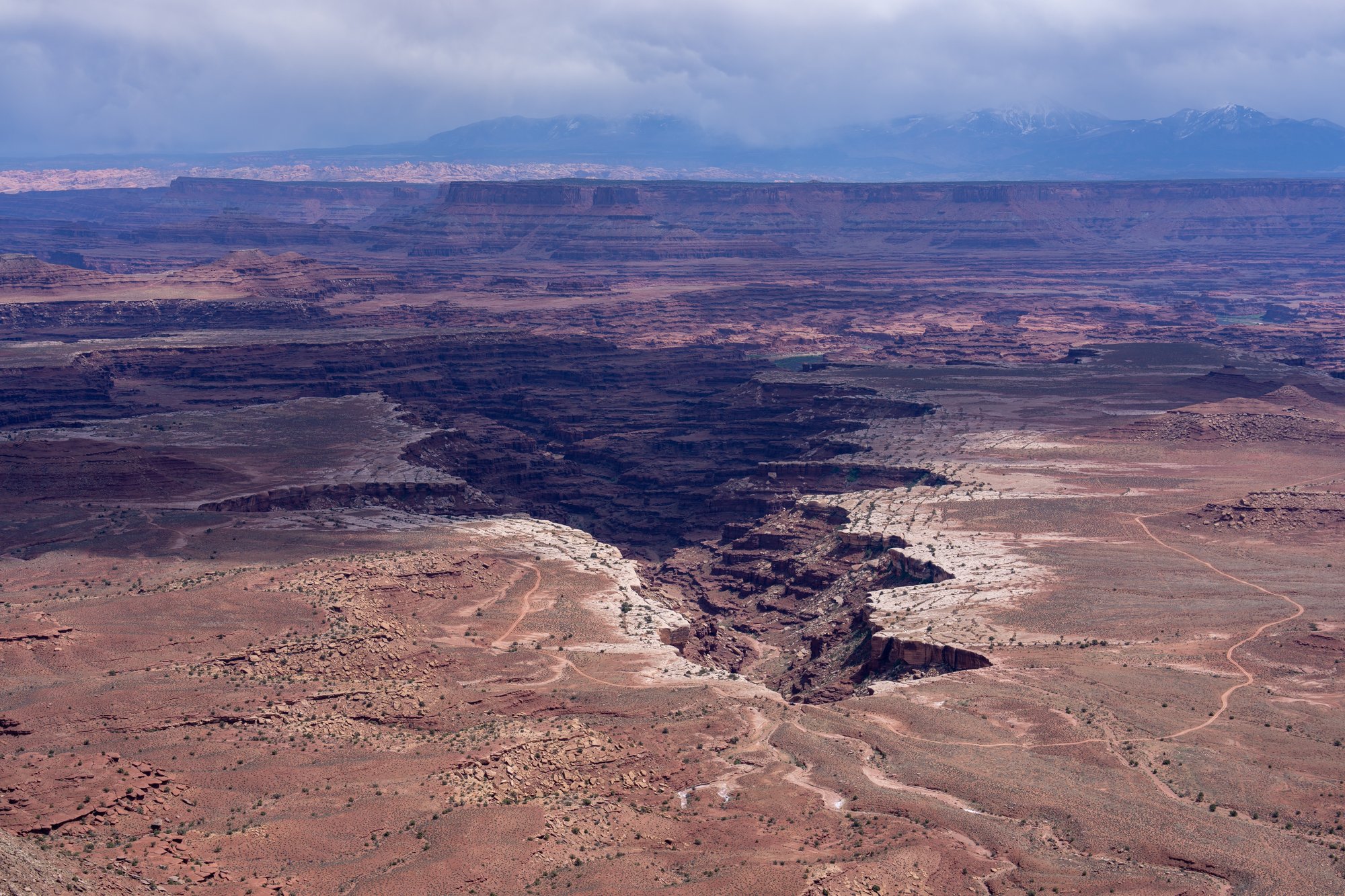 White Rim Overlook is nog zo’n schitterend uitzicht. Ook hier kijken we in kloven en op rotsformaties, maar de White Rim Overlook heeft nog iets extra’s. De besneeuwde La Sal Mountains in de verte.