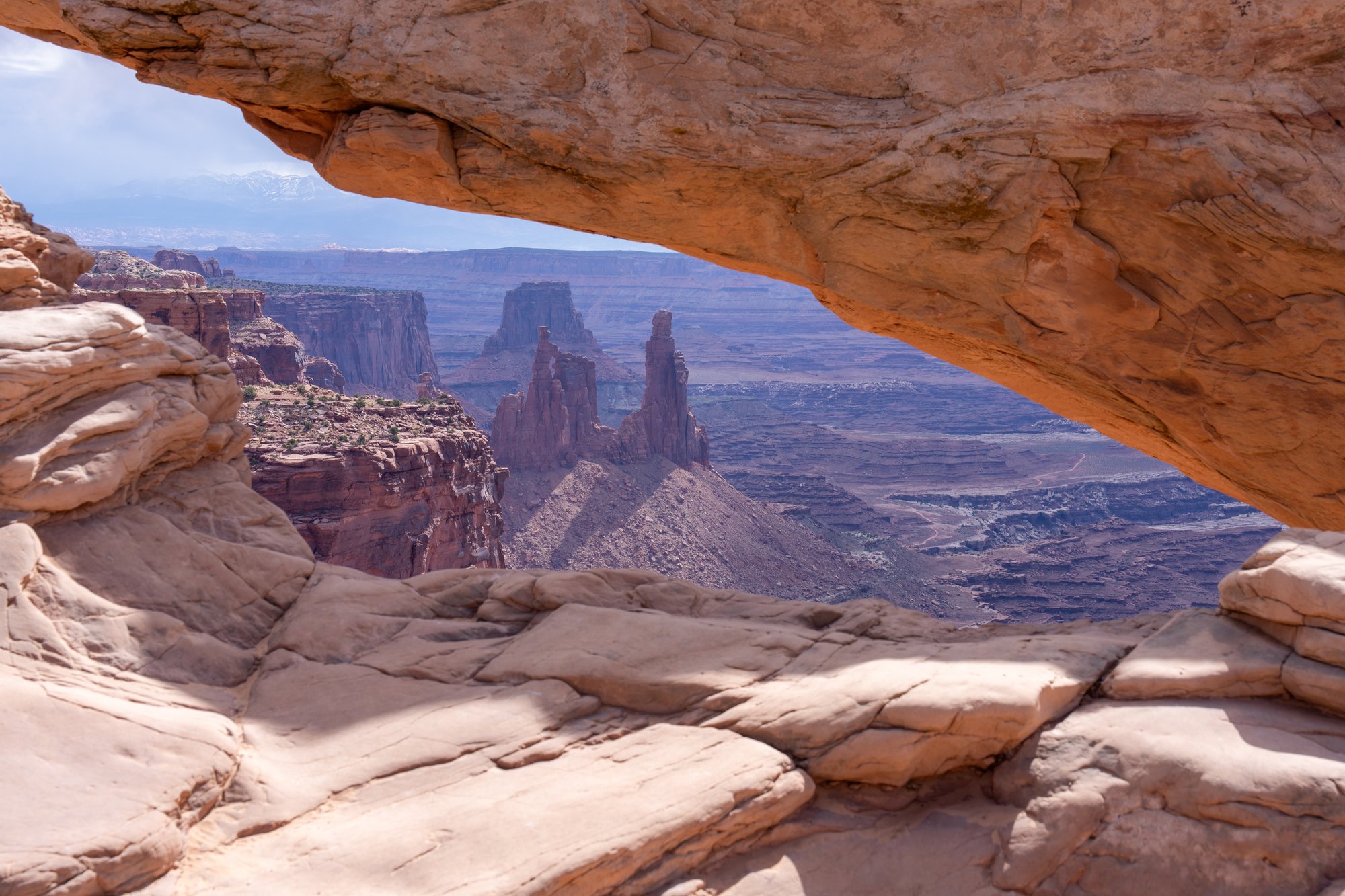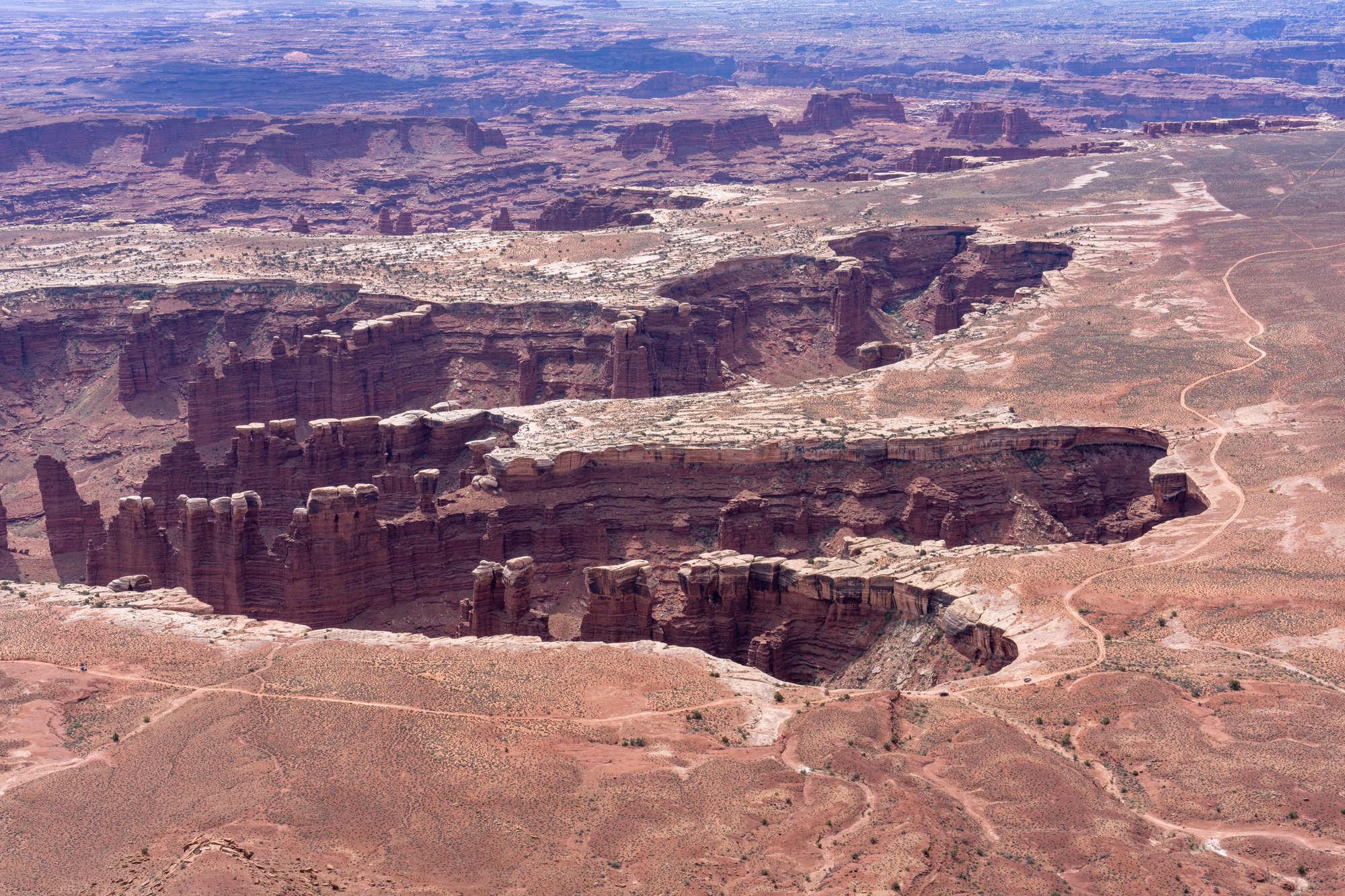 We wandelen de White Rim Trail - een ontspannen, vlakke wandeling van ongeveer 1,5 kilometer - totdat we bij een volgend uitzichtpunt komen. Hier kunnen we twee kanten op kijken. Rechts van ons hebben we een uitzicht dat vergelijkbaar is met Grand View Point (maar dan vanaf een andere hoek) en links kijken we de diepte in richting Mesa Arch. Eigenlijk krijg je hier 2 uitzichten voor de inspanning van één!
