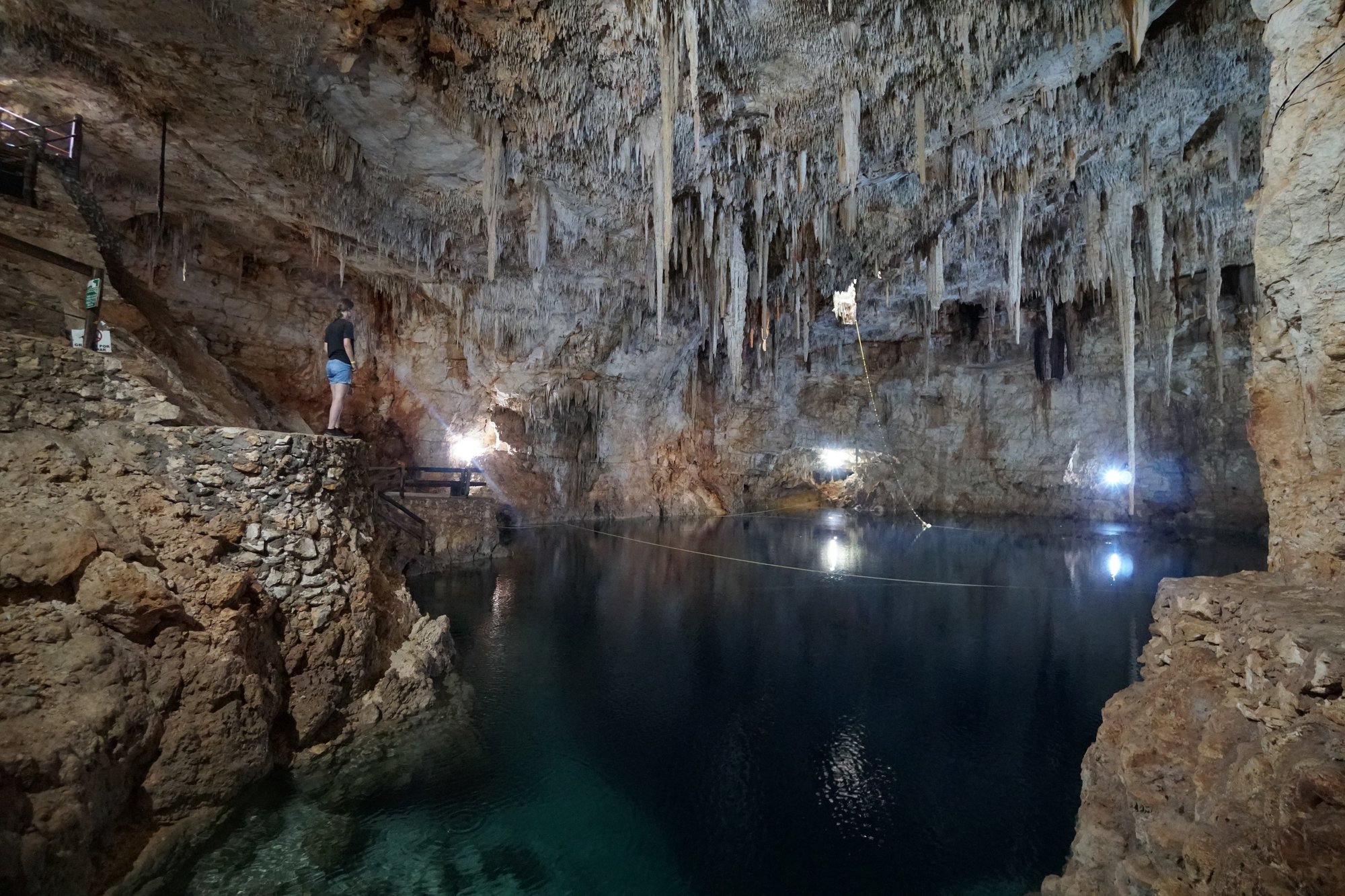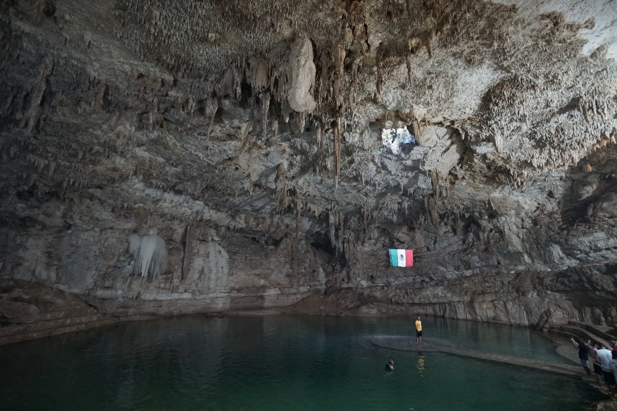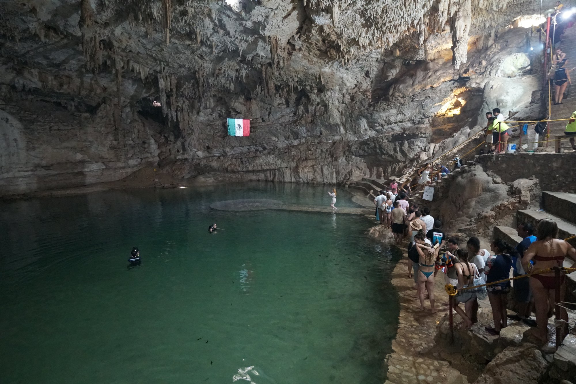 Nadat we hebben genoten van de Samula cenote, lopen we naar de andere kant van het terrein en gaan we de grot van Cenote Xkeken in. Deze cenote is bijna helemaal dicht en daarmee een stuk donkerder dan andere cenotes. Wel heb je ook hier weer mooie stalactieten en het is niet al te druk. Het water is door de donkere kleur alleen niet zo heel aantrekkelijk om in te zwemmen. Je verkoeling zou ik eerder in Samula zoeken!