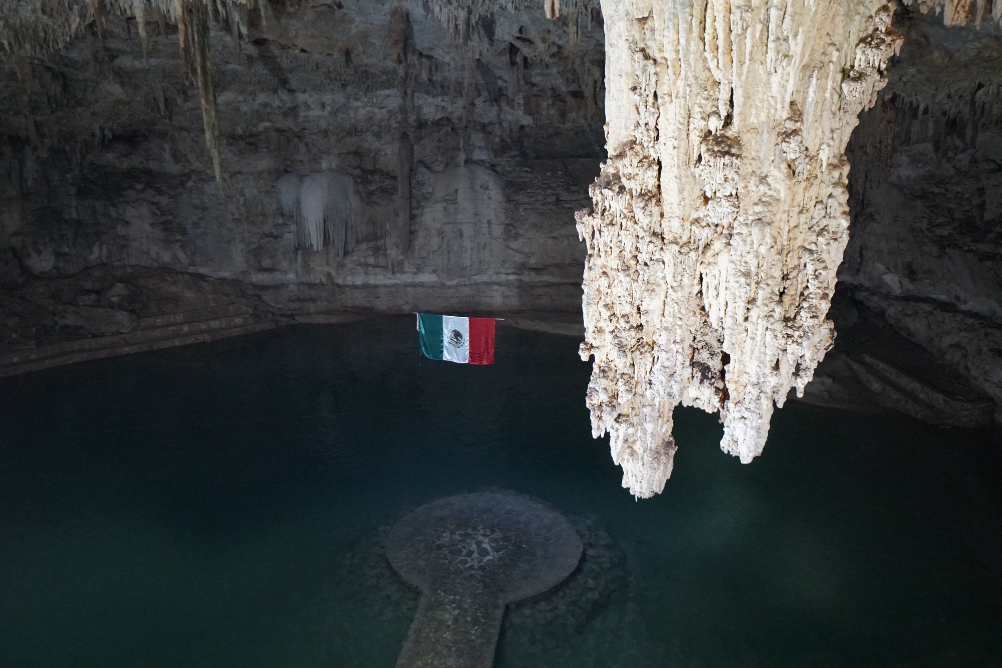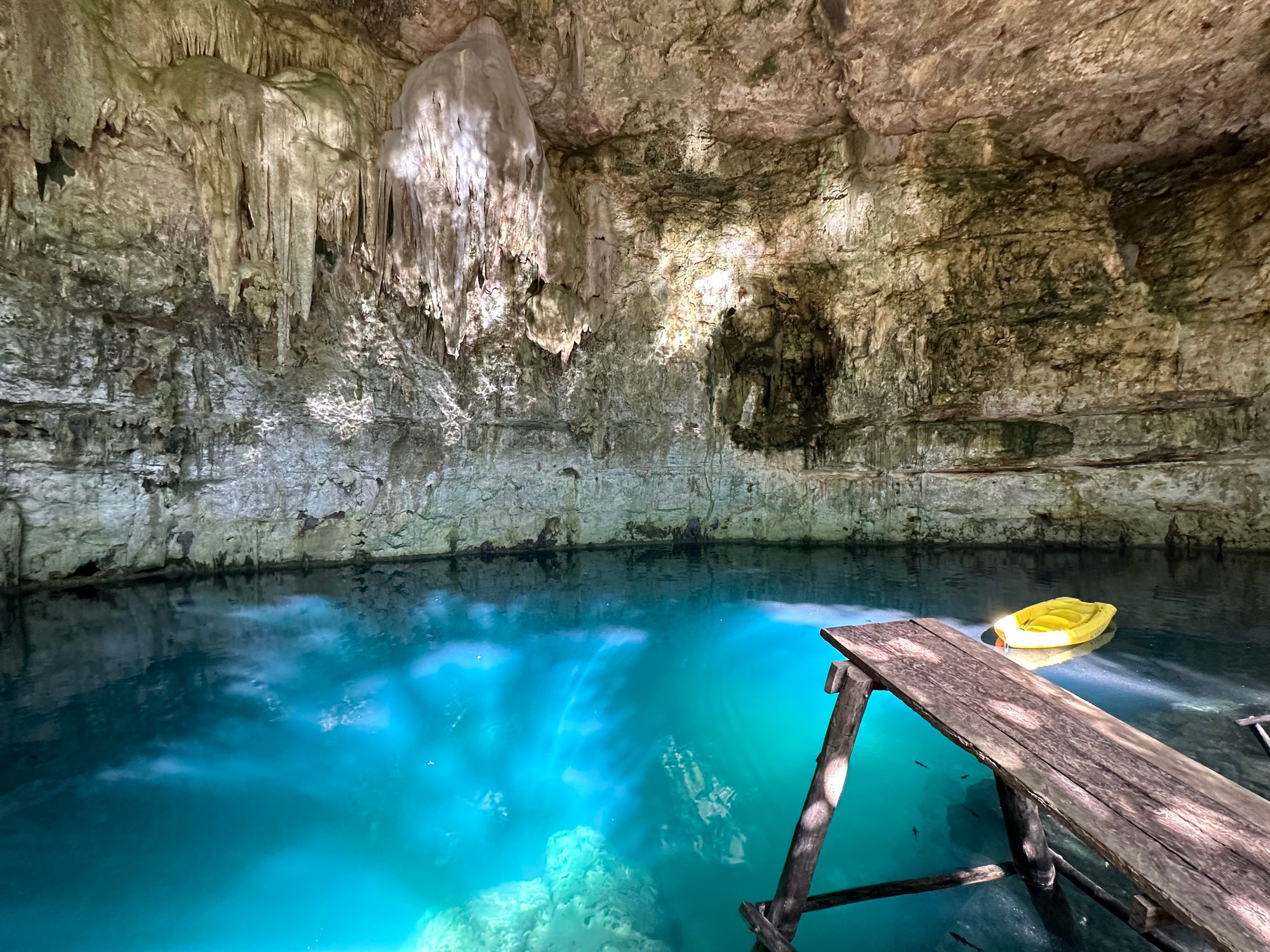 We beginnen onze zelf georganiseerde cenote tour bij één van de populairste cenotes in de omgeving: Cenote Suytun. De cenote ligt in een vrij donkere grot met een kleine opening bovenin. Als het een zonnige dag is en de zon staat op de juiste positie, dan schijnt de zon in een mooie straal precies door dit gat op het platform in het water. Dat is zonder twijfel een mooi plaatje!