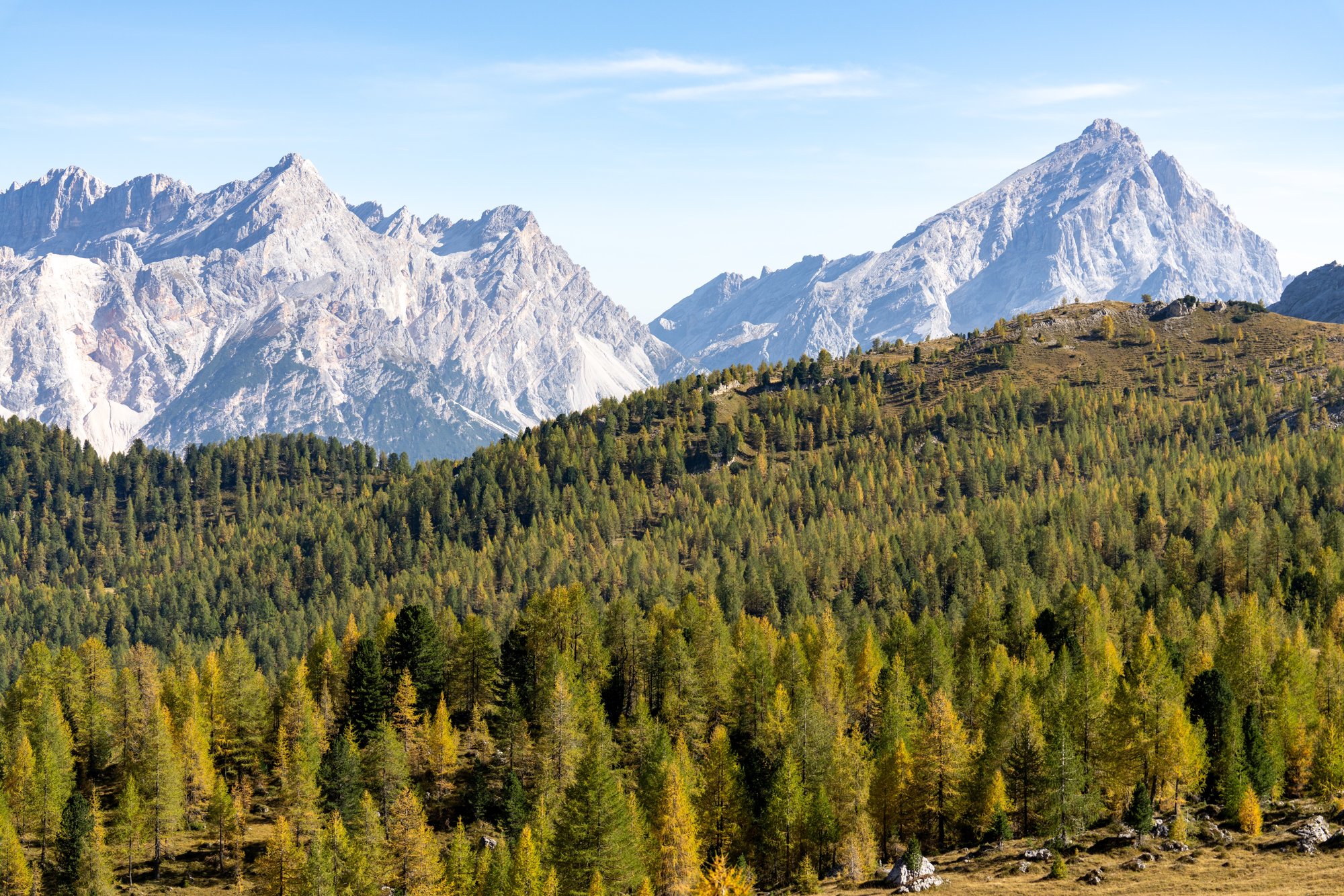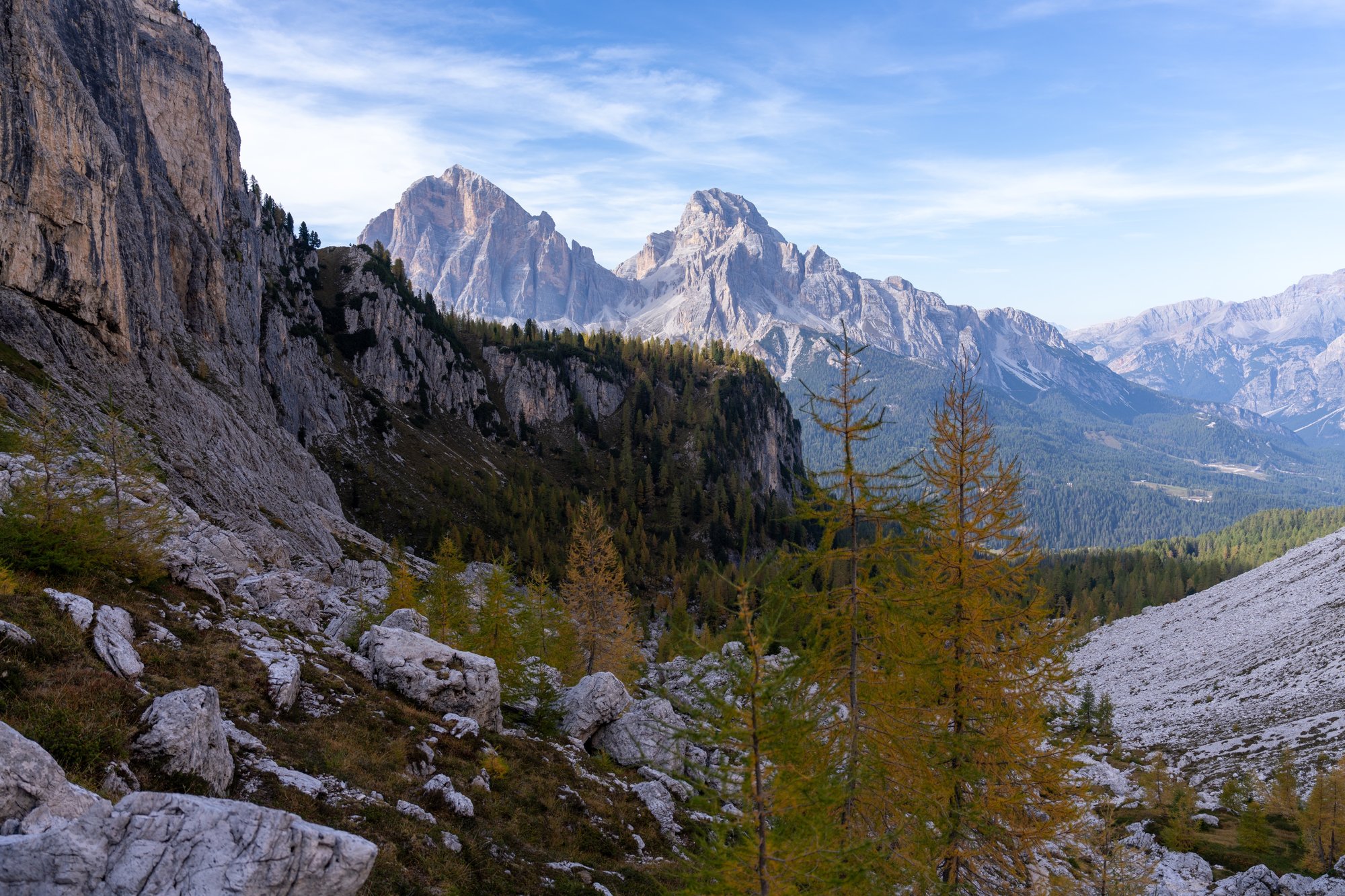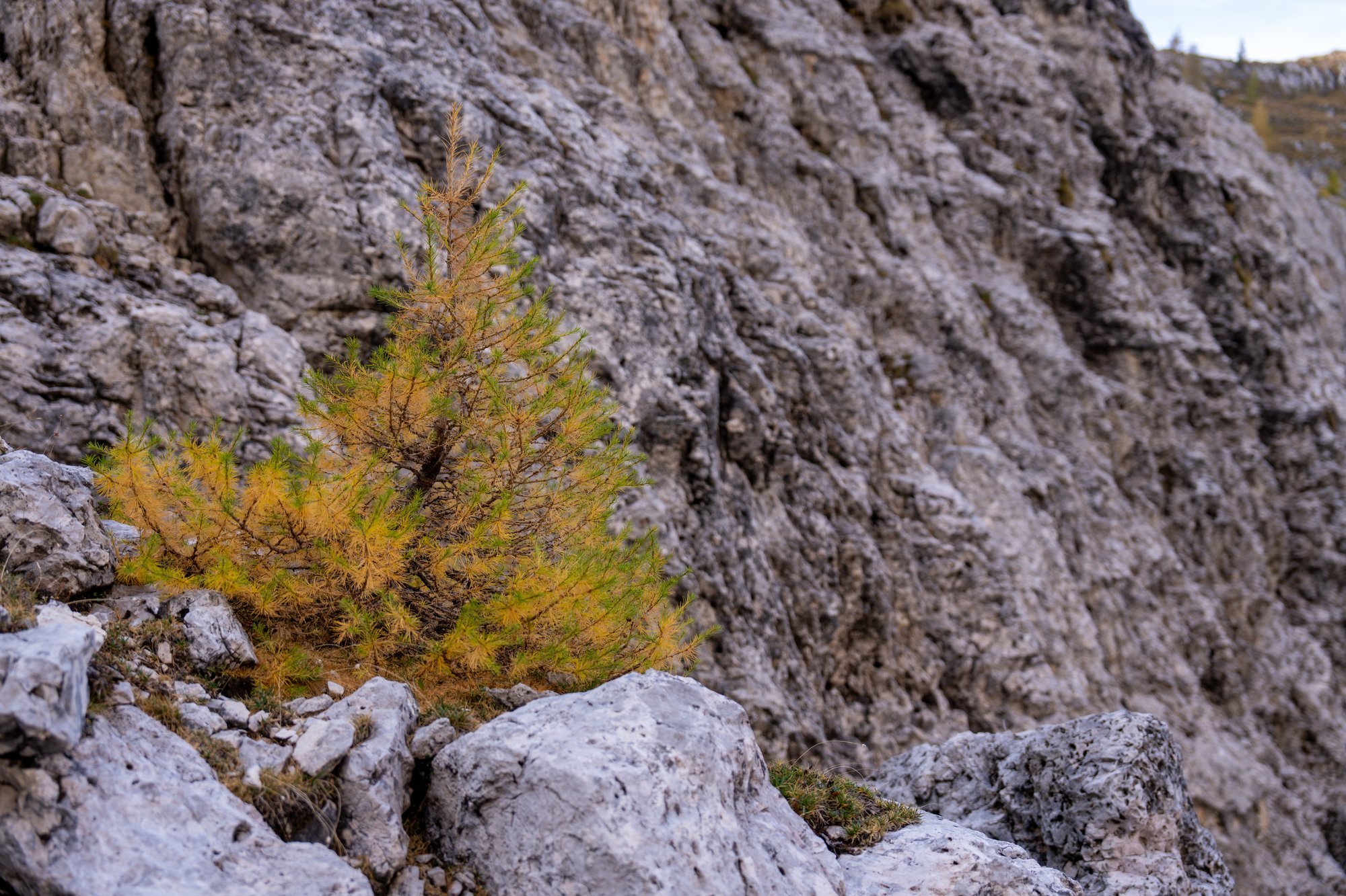 Na 45 minuten bereiken we Forcella Ambrizzola. We bevinden ons nu op 2.277 meter hoogte en klim 2 zit erop. Nog eentje te gaan! We volgen het pad dat ons langs de andere kant van de Croda da Lago bergketen leidt. Het landschap is ineens heel anders. Rotsachtig met zo’n typisch groengele kleur door de lage begroeiing. Het vredige en idyllische van Lago Federa heeft plaatsgemaakt voor een rauw samenspel waar rotsen en bergwanden domineren. Dat kunnen wij ook goed waarderen!