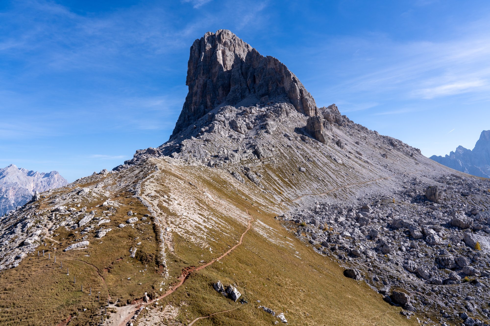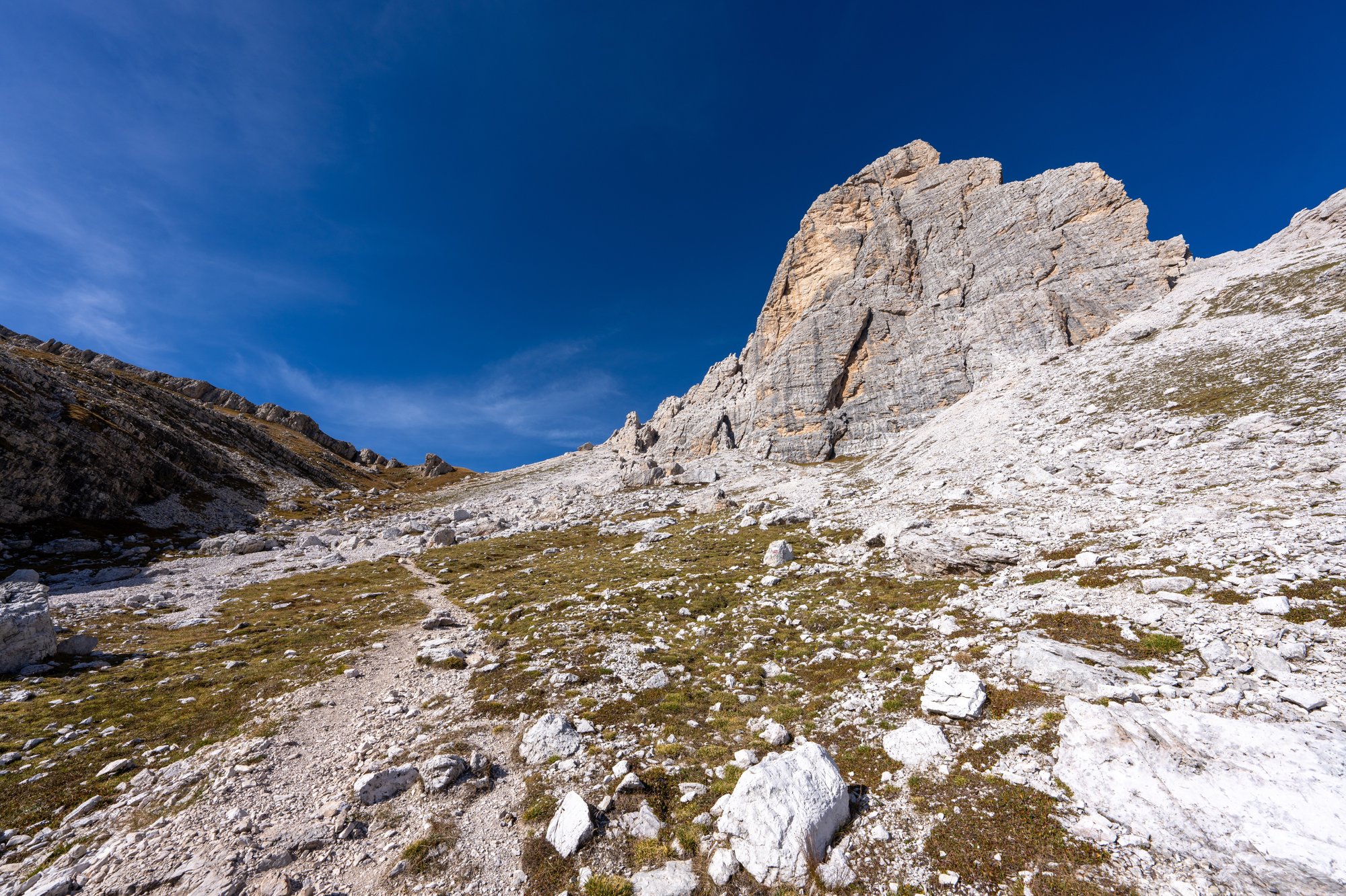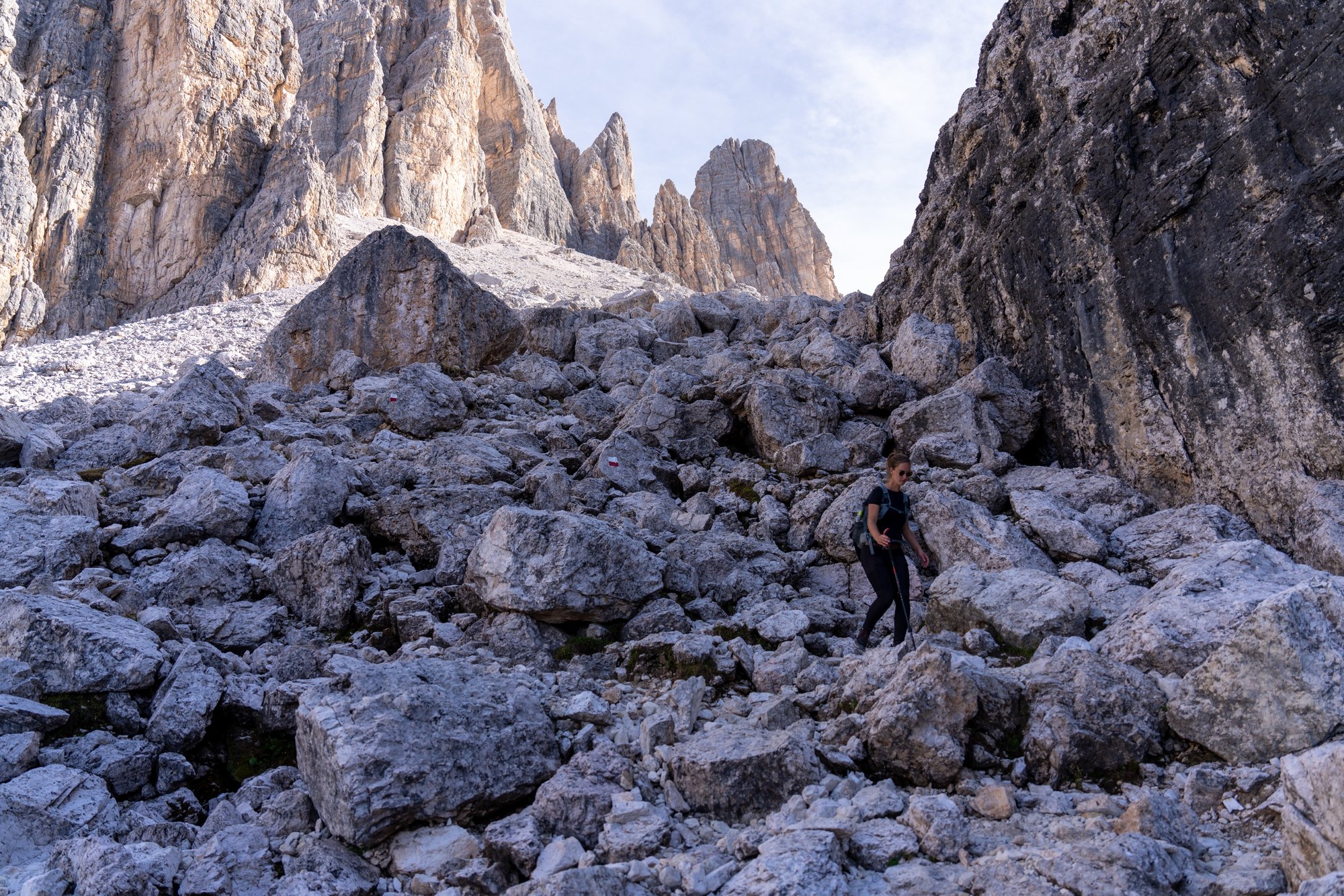 Het duurt niet lang voordat ons doel in zicht komt: Forcella di Formin op 2.426 meter hoogte. Het pad naar deze bergtop begint vriendelijk, maar het duurt niet lang voordat de trail verandert in een genadeloze klim. De steilheid in combinatie met het fijne gruis maken dit deel van de hike pittig, zowel conditioneel als technisch.