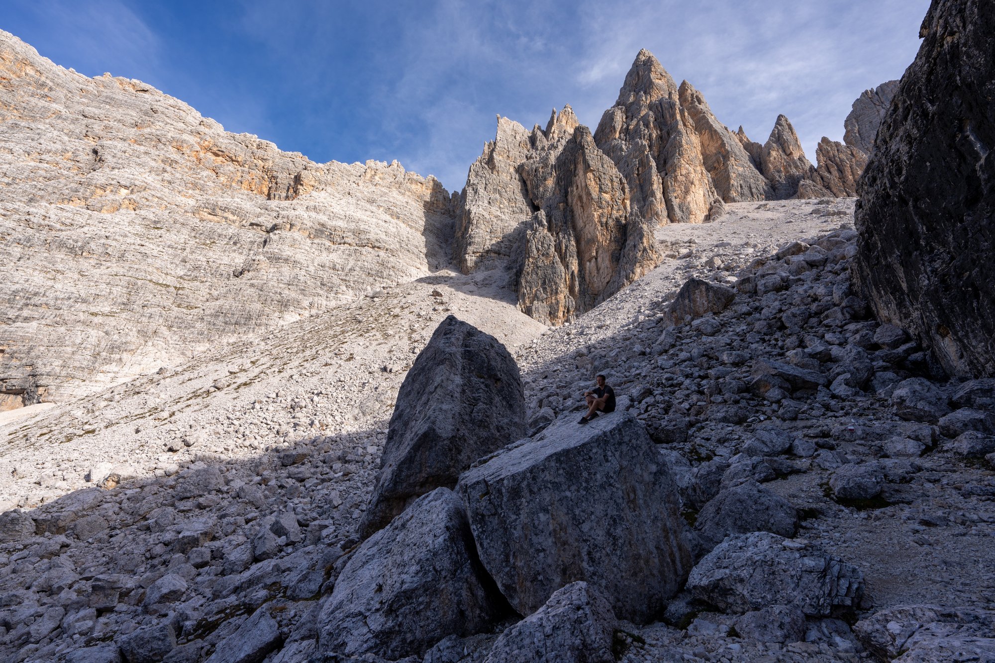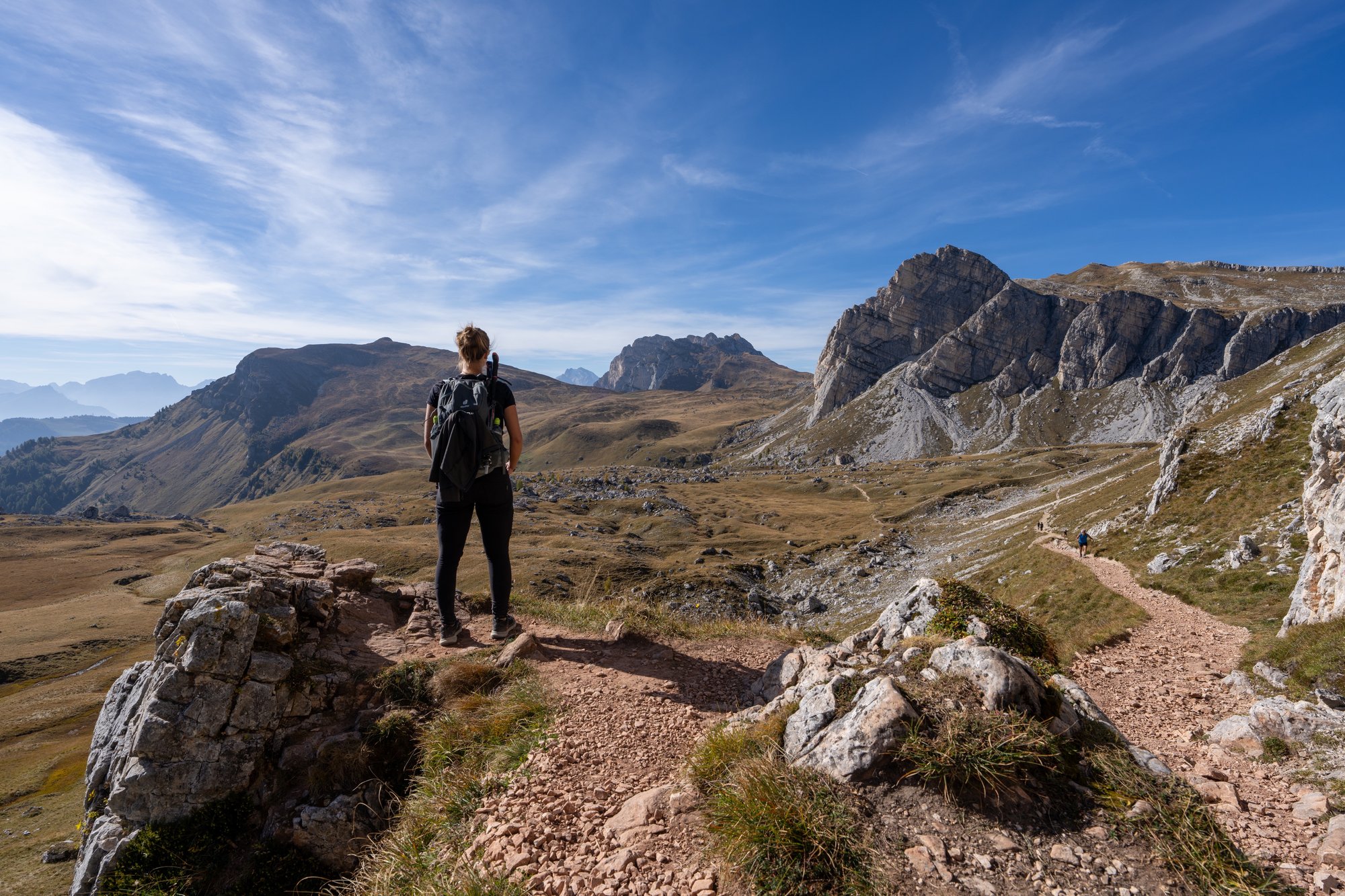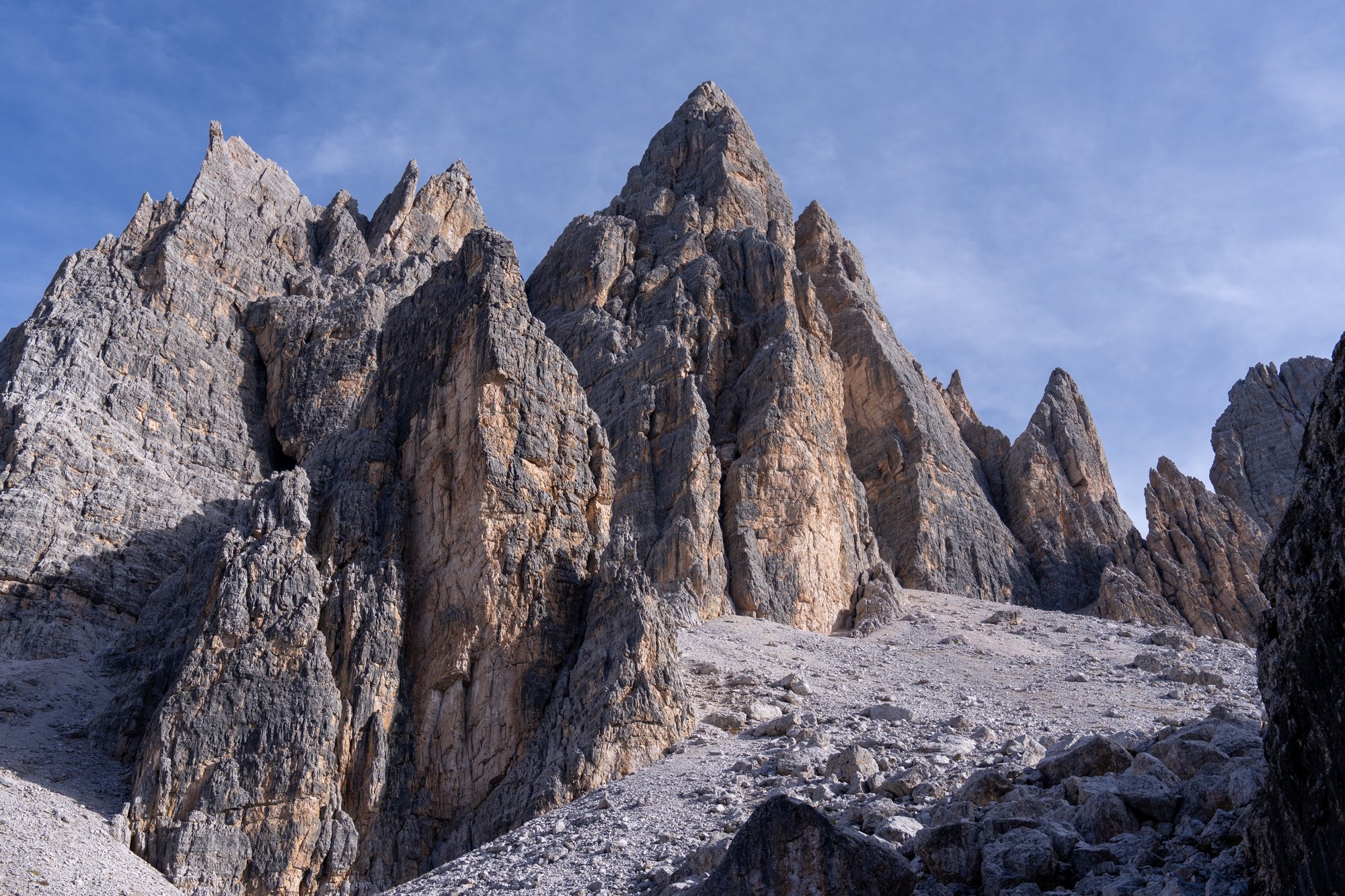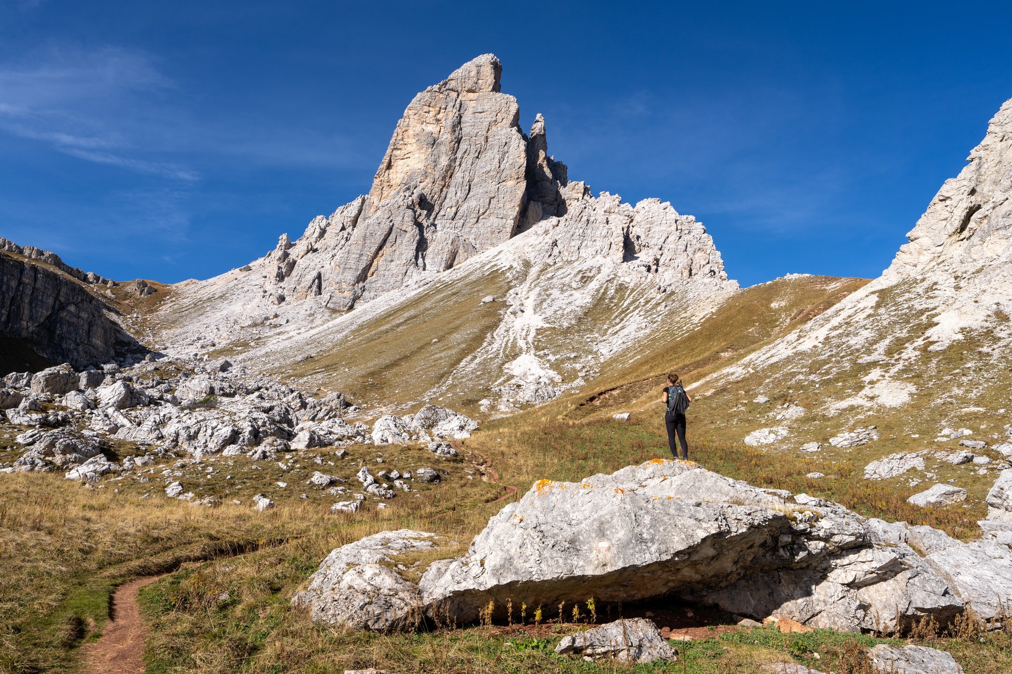 Het duurt niet lang voordat ons doel in zicht komt: Forcella di Formin op 2.426 meter hoogte. Het pad naar deze bergtop begint vriendelijk, maar het duurt niet lang voordat de trail verandert in een genadeloze klim. De steilheid in combinatie met het fijne gruis maken dit deel van de hike pittig, zowel conditioneel als technisch.
