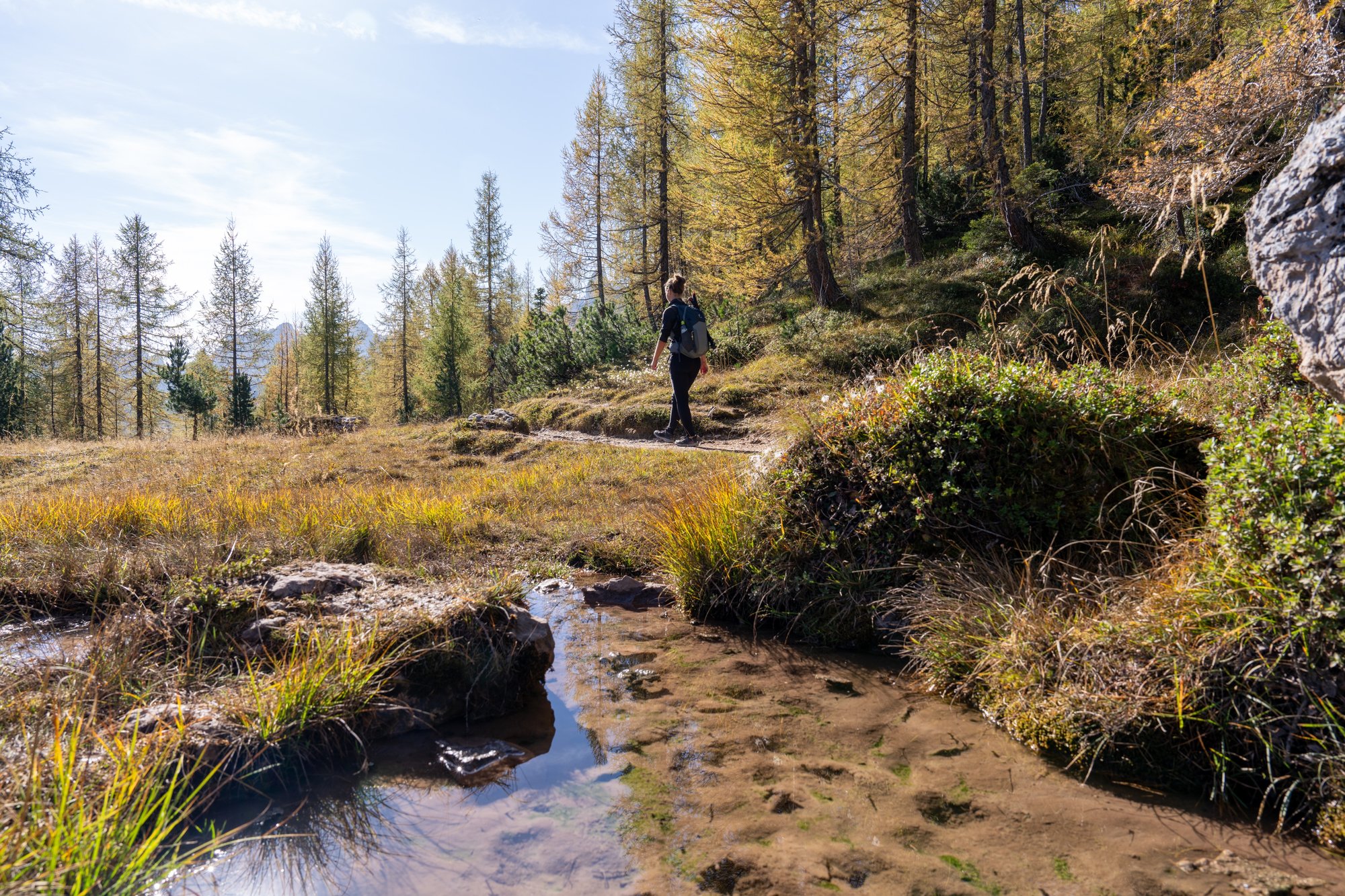 Het is nog fris als we rond half 10 aan de Croda da Lago Circuit Trail beginnen. Niet zo gek als je je bedenkt dat het alweer half oktober is. De tijd vliegt in de Dolomieten! We waren al eerder in de buurt van Lago Federa en de Croda da Lago bergen (bij de Rifugio Nuvolau hike en Lago di Sorapis), maar we hebben deze hike expres bewaard voor het laatste deel van onze Dolomieten trip. Dit is namelijk een herfst hike bij uitstek, hebben we ons laten vertellen. We zijn benieuwd of de herfstkleuren al te zien zijn!